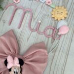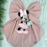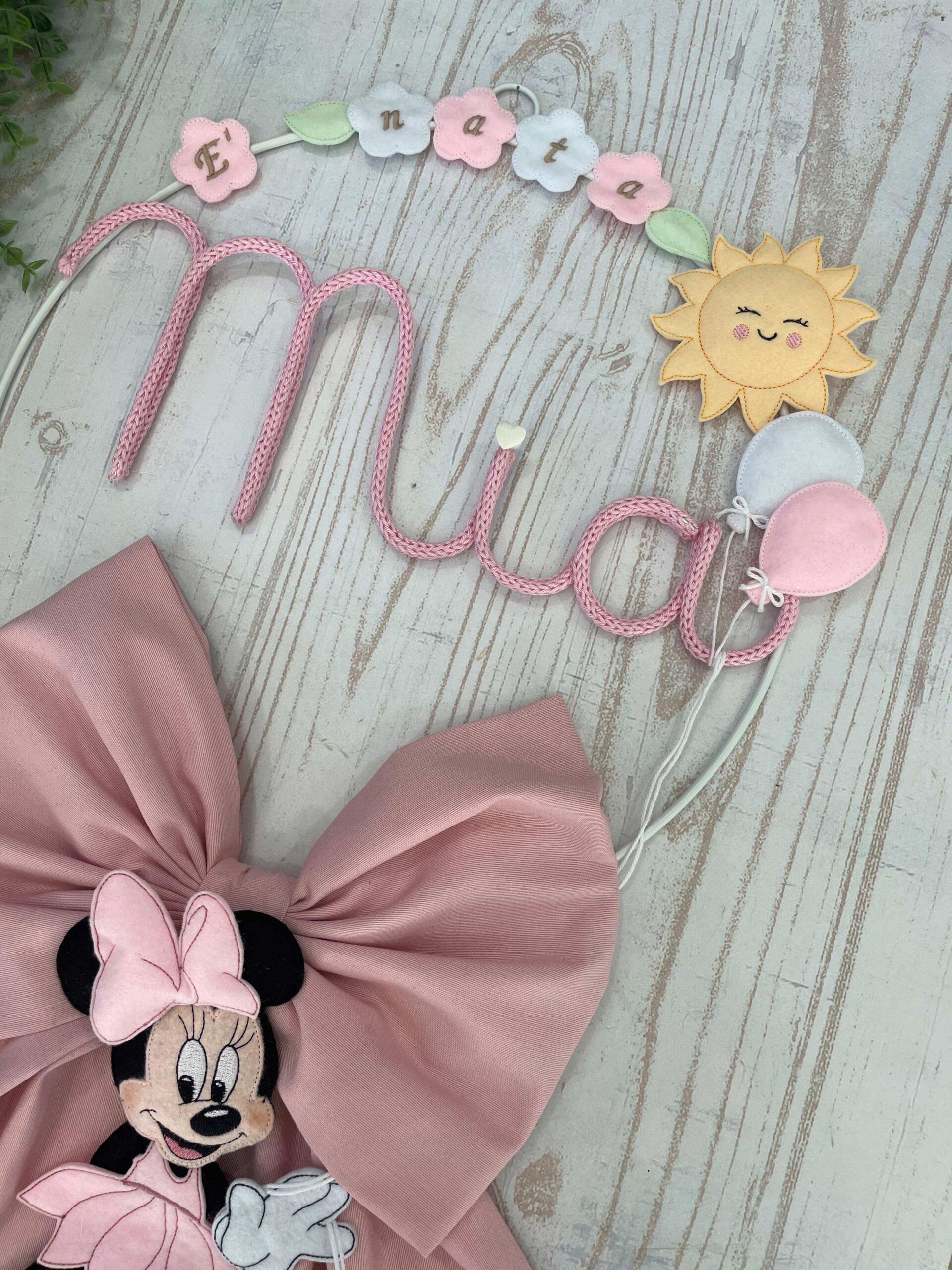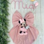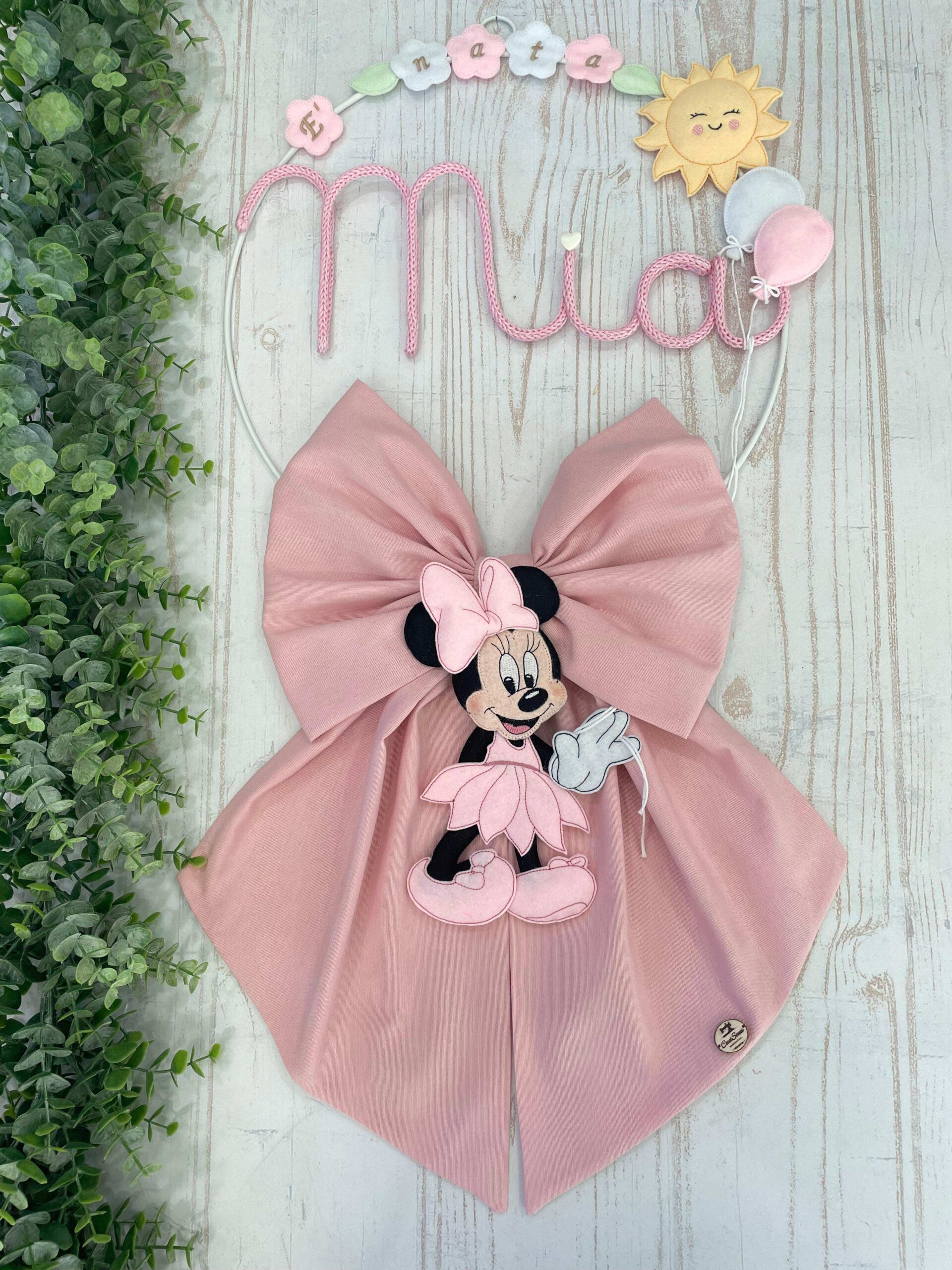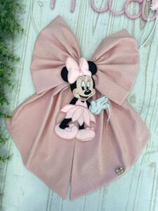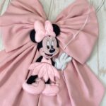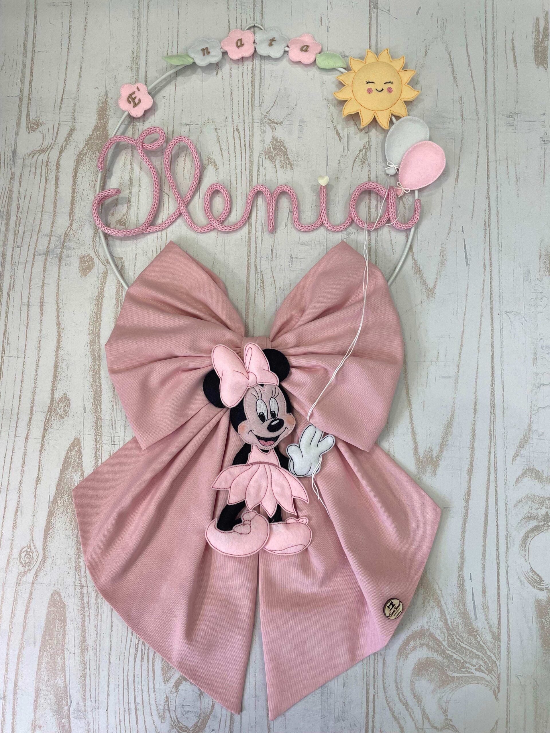 Dal fiocco pende la tenerissima Minnie tridimensionale in pannolenci, che rende questo fiocco unico e perfetto per annunciare l’arrivo della tua bimba con dolcezza.