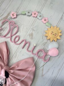 Il fiocco, in cotone rosa, è impreziosito da un cerchio in metallo bianco decorato con palloncini e vari elementi in pannolenci, che incornicia con delicatezza il nome della bimba in tricotin rosa (personalizzabile).