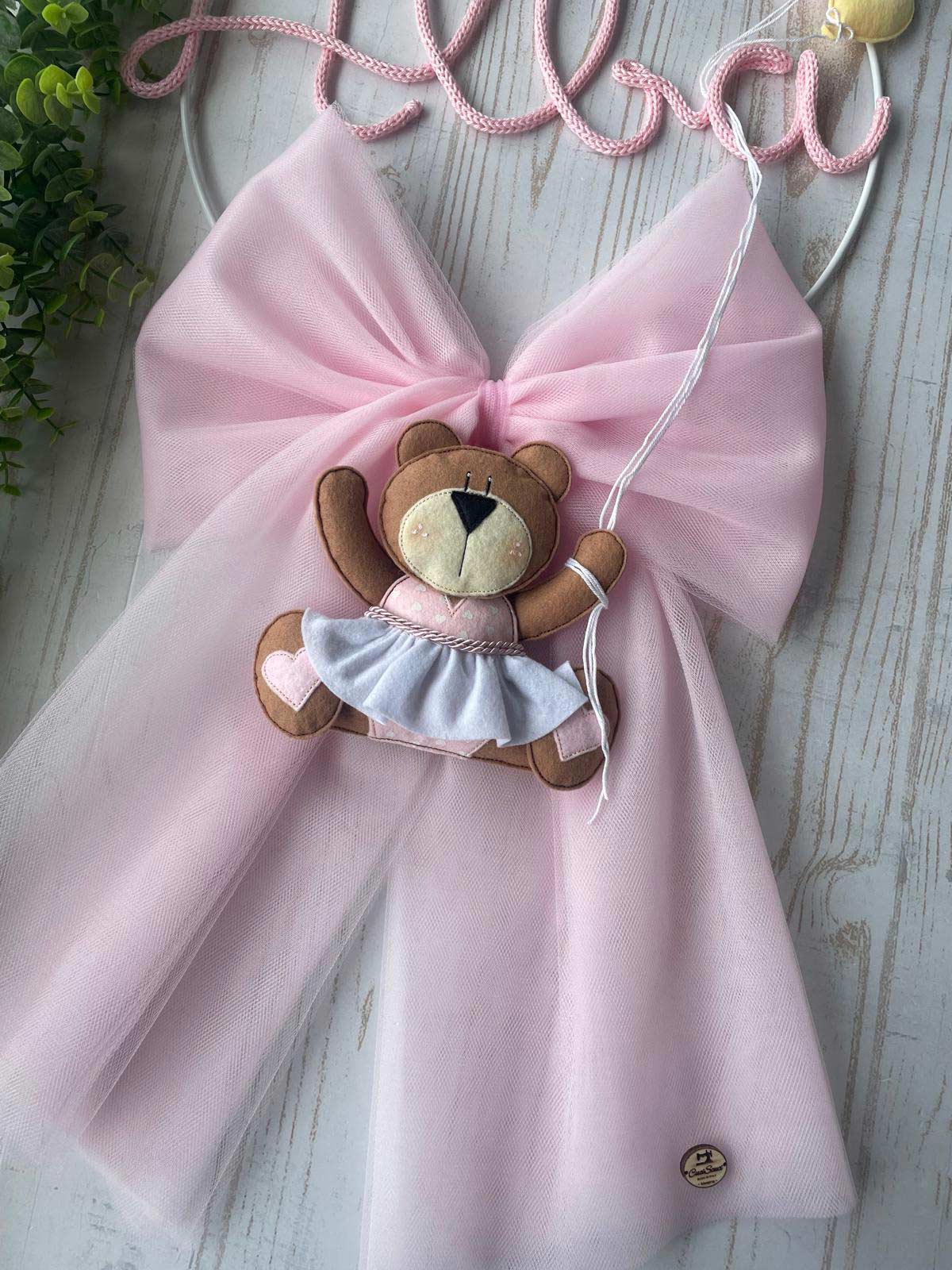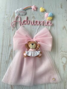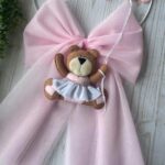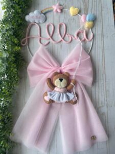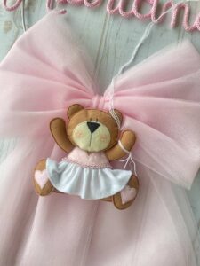 Fiocco Nascita Rosa in Tulle con Nome in Tricotin e Orsetta.