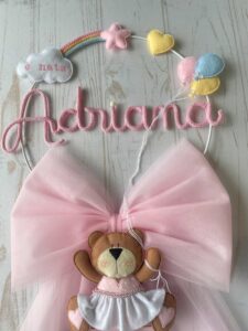 Dal fiocco pende una tenera orsetta in pannolenci tridimensionale, vestita con un grazioso abitino e con in mano dei fili che si collegano ai palloncini posizionati nella parte superiore del cerchio.