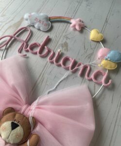 Il fiocco, in tulle rosa, è impreziosito da un cerchio in metallo bianco decorato con delicati dettagli in pannolenci, che fanno da cornice al nome della bimba (personalizzabile) in tricotin rosa.