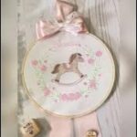 Il ricamo, eseguito con grande cura artigianale, raffigura un dolce cavallino a dondolo, accompagnato dal nome della bambina e da un decoro floreale armonioso nei toni del rosa. Un insieme romantico e senza tempo, perfetto per valorizzare l’ingresso di casa o la cameretta.