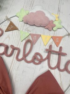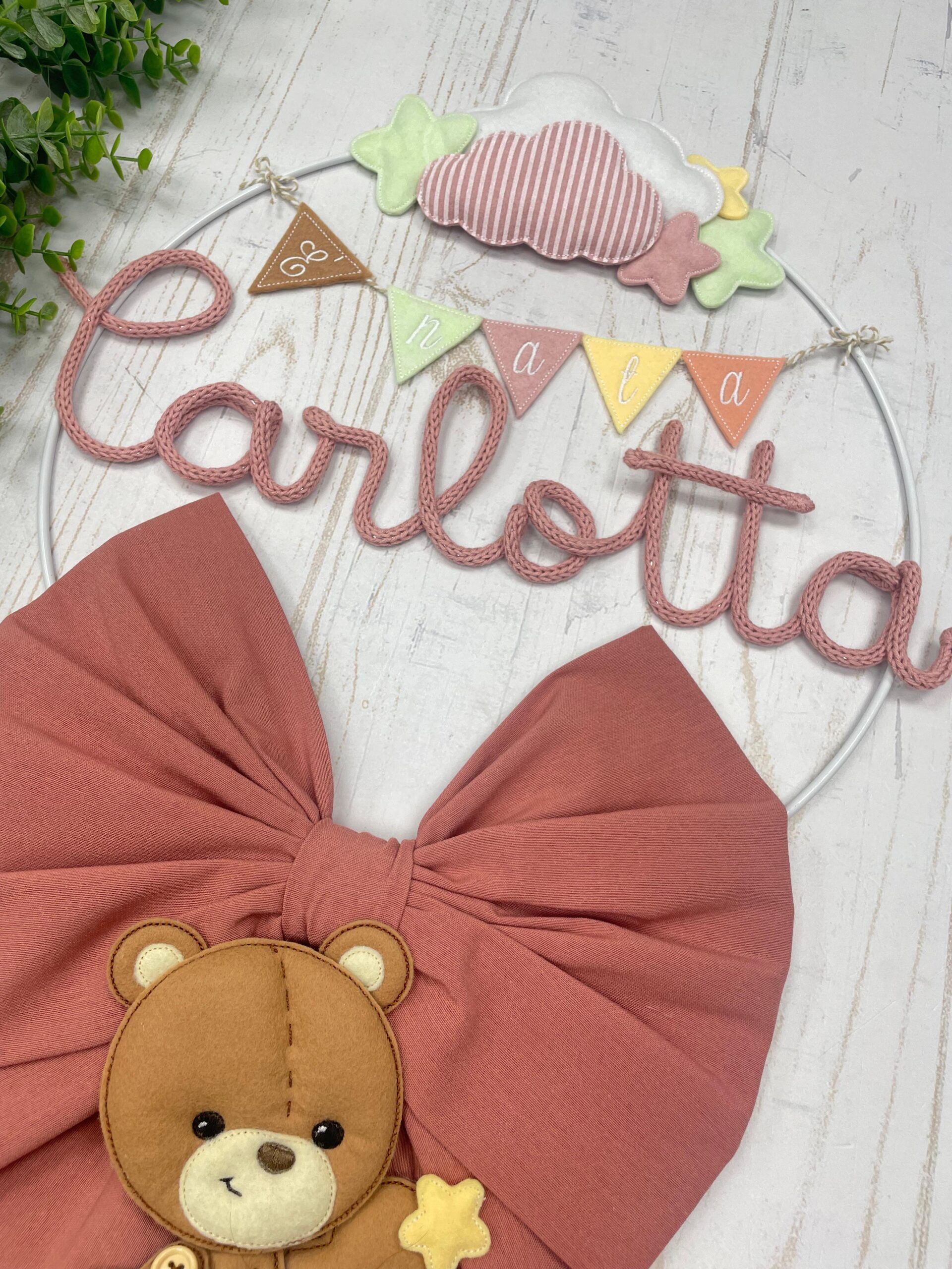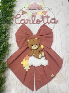 Un fiocco nascita originale, creato a mano dalla nostra sartoria con cotone terracotta e dettagli curati nei minimi particolari.