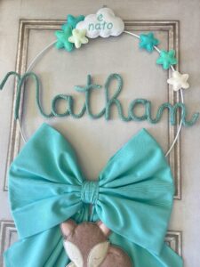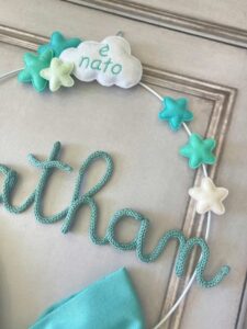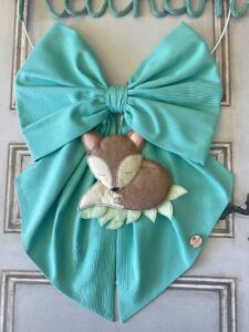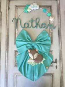 Al centro spicca il nome del bimbo in tricotin tiffany, mentre dal fiocco pende una tenerissima volpe tridimensionale in pannolenci, realizzata con grande precisione artigianale.