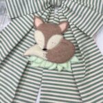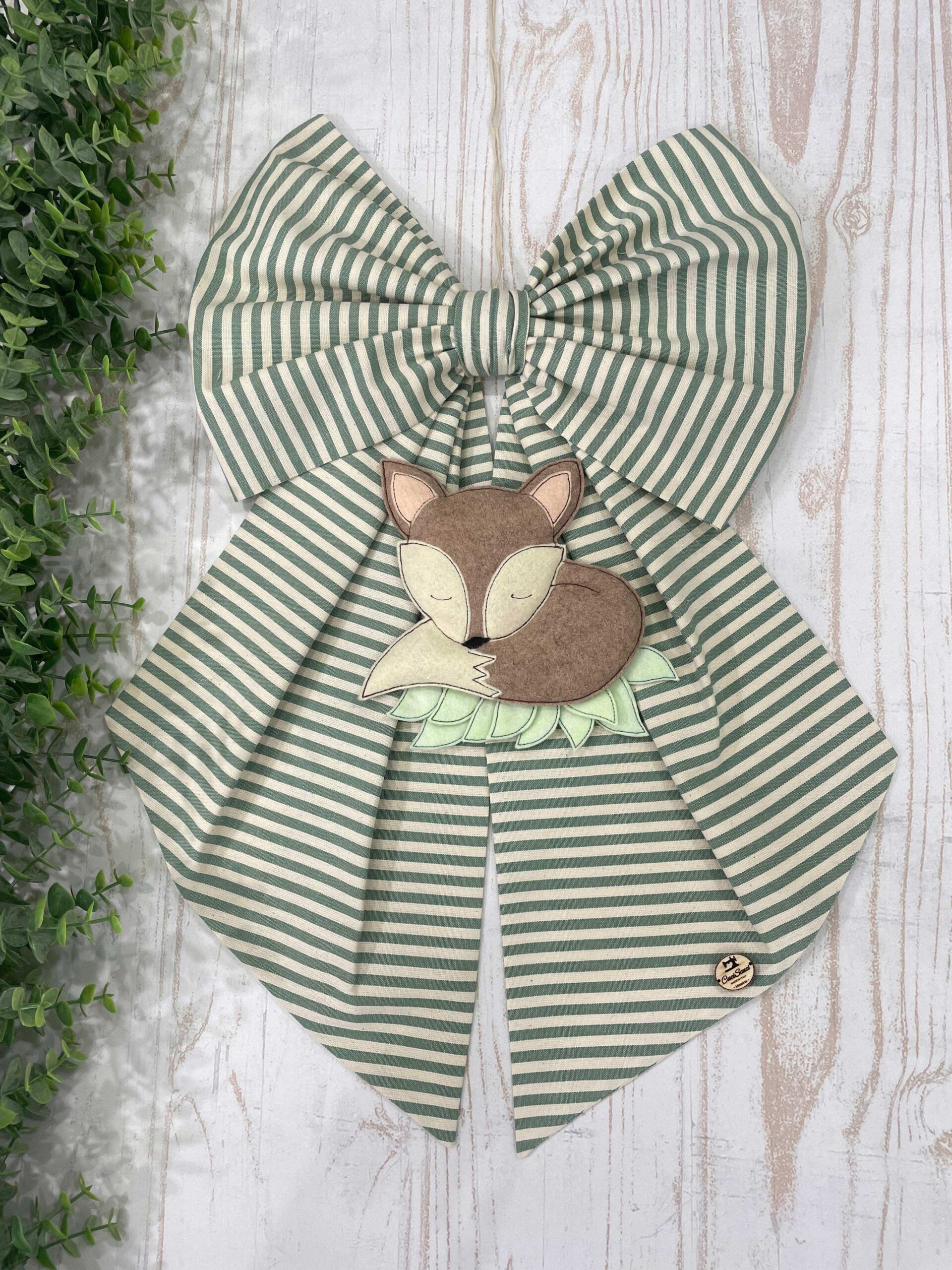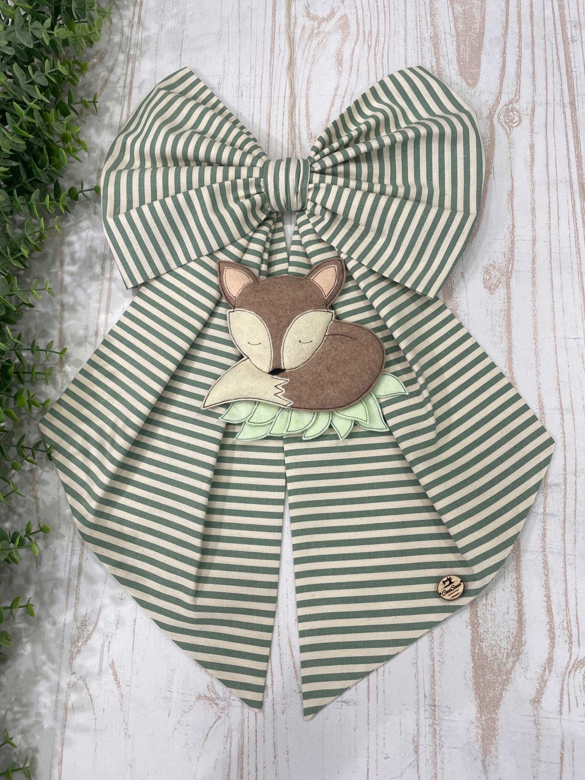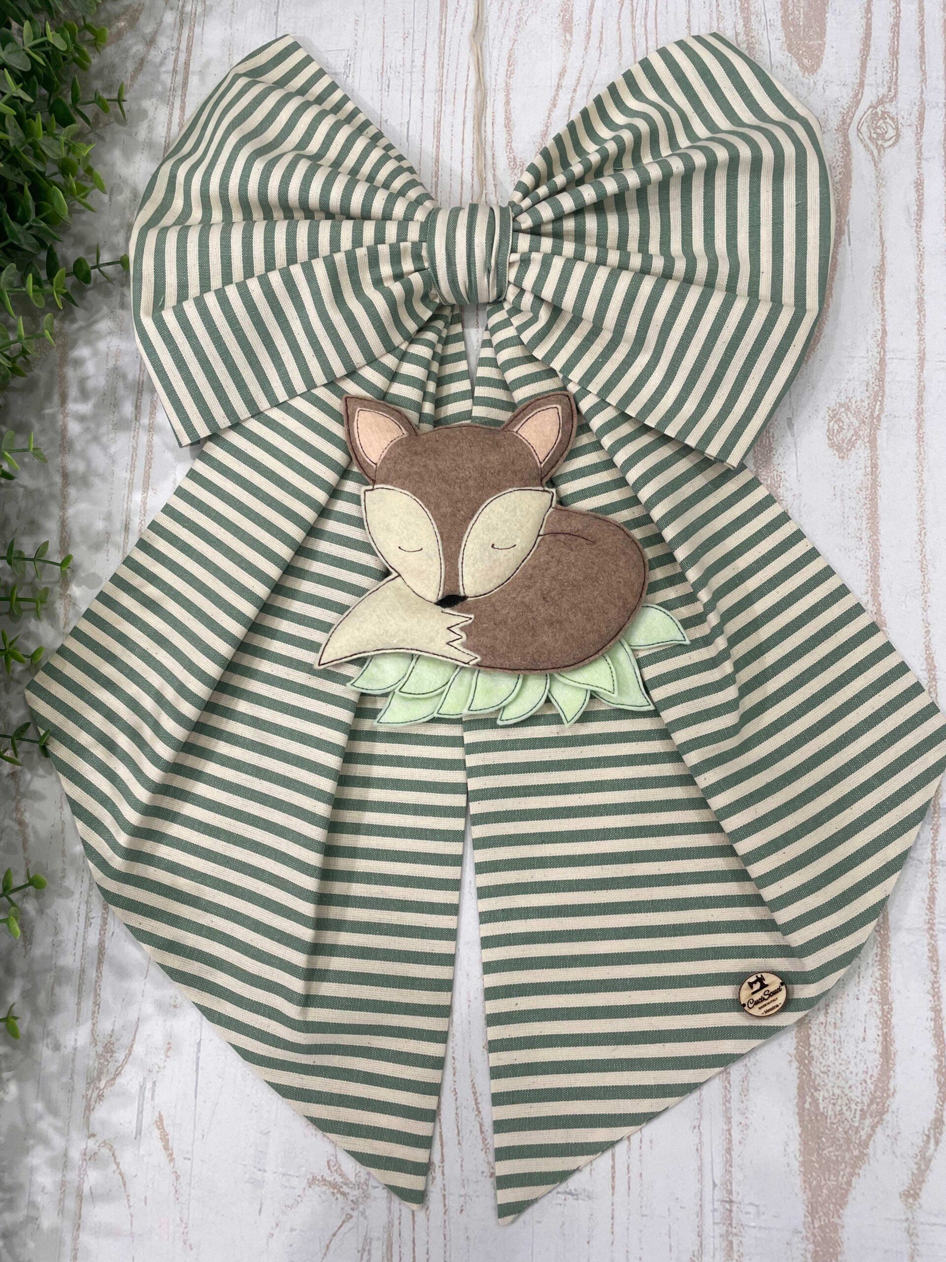 Dalla parte inferiore del fiocco pende una tenerissima volpe tridimensionale in pannolenci, realizzata con maestria artigianale per rendere ogni creazione unica e speciale.