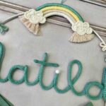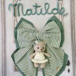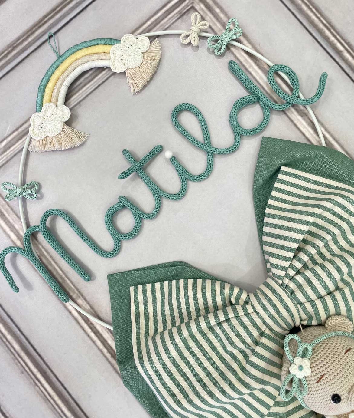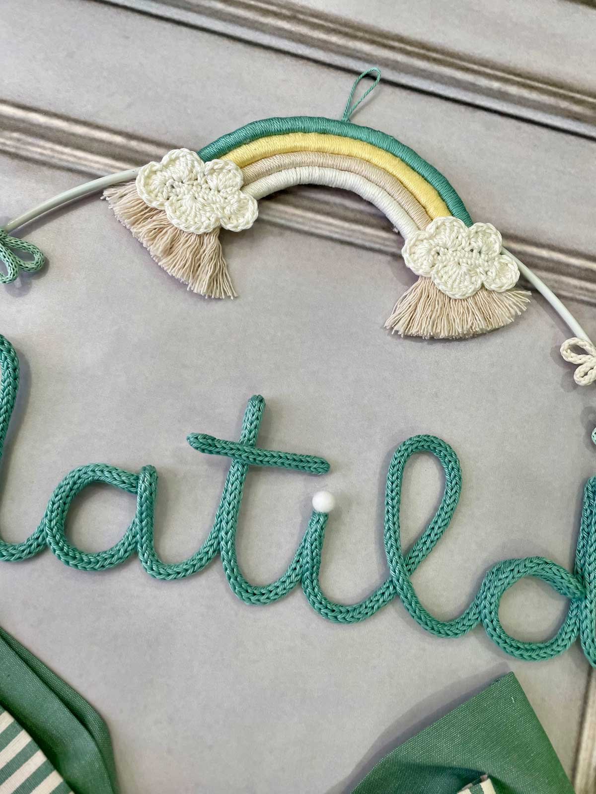 Al centro è applicato il nome della bimba in tricotin verde salvia, personalizzabile.