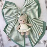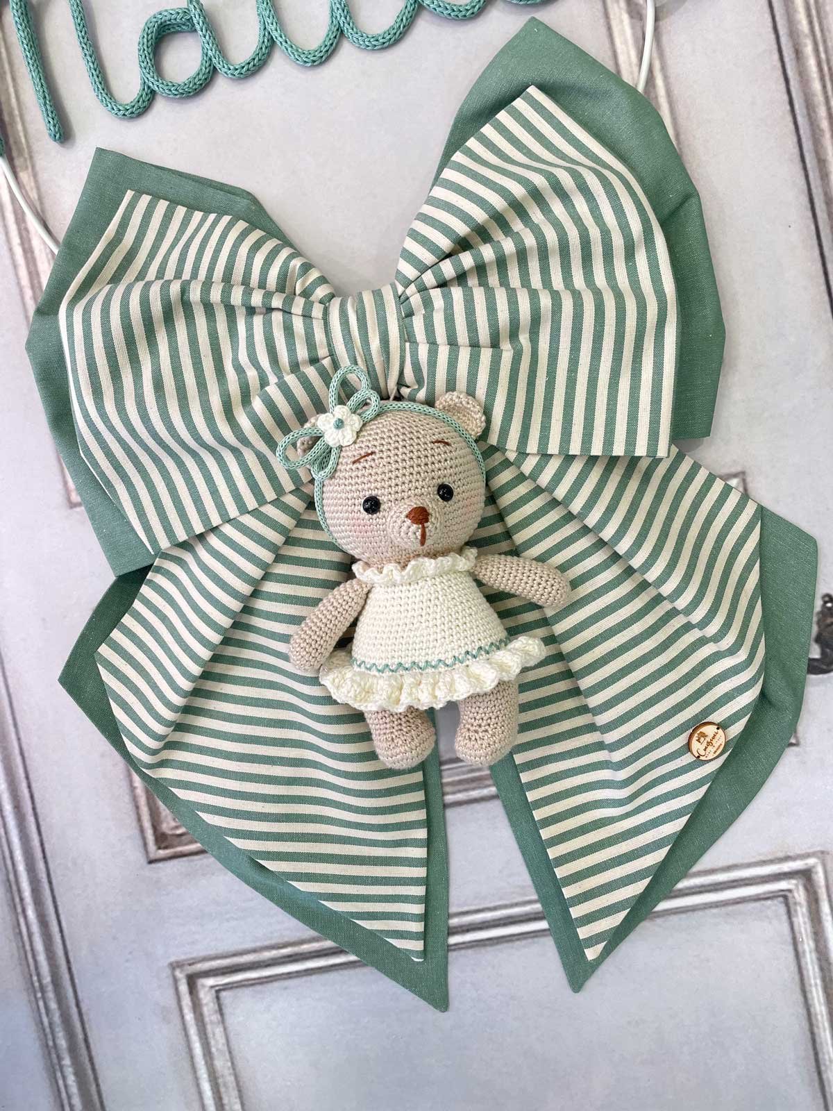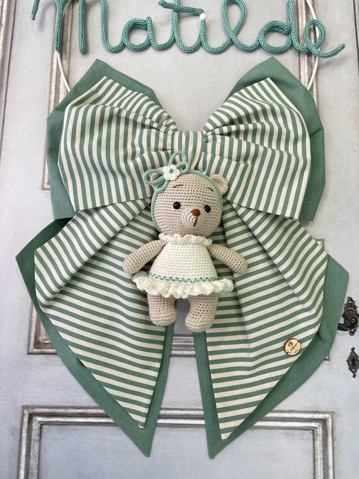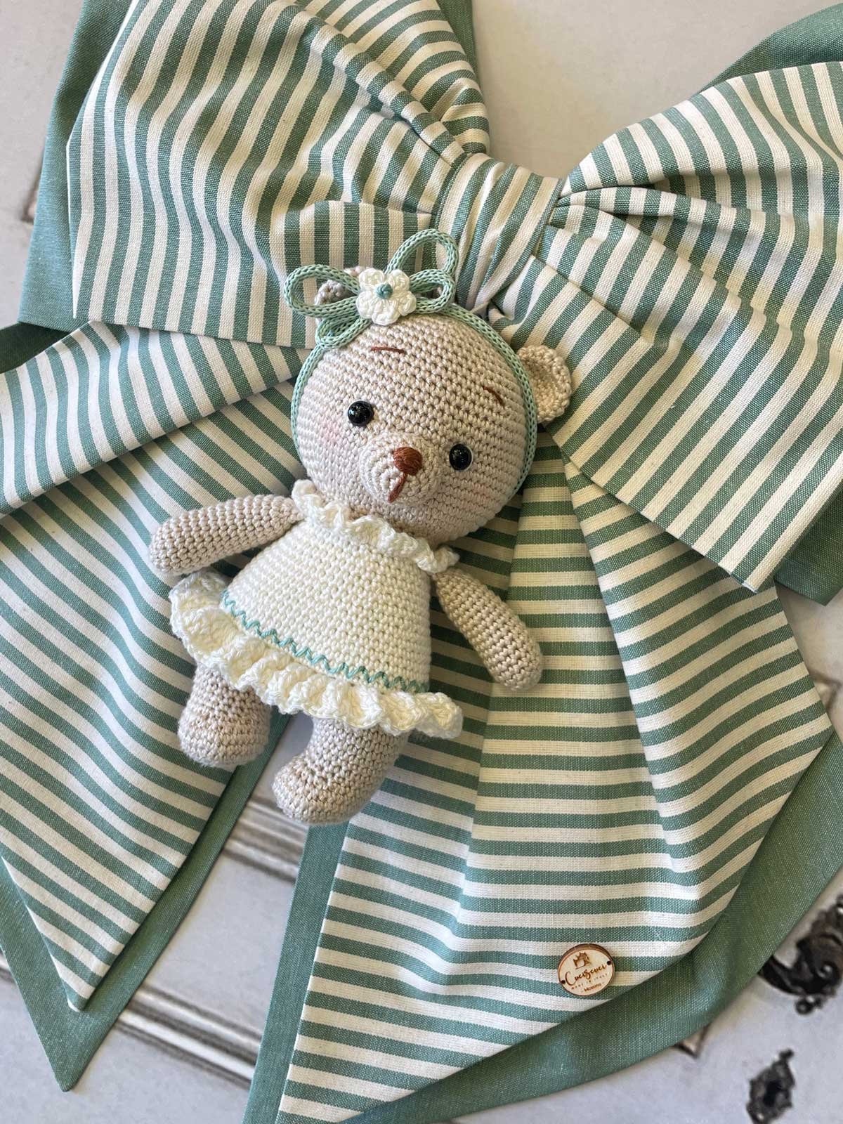 Dal fiocco pende una tenerissima orsetta tridimensionale realizzata con la tecnica amigurumi.