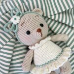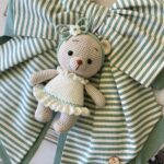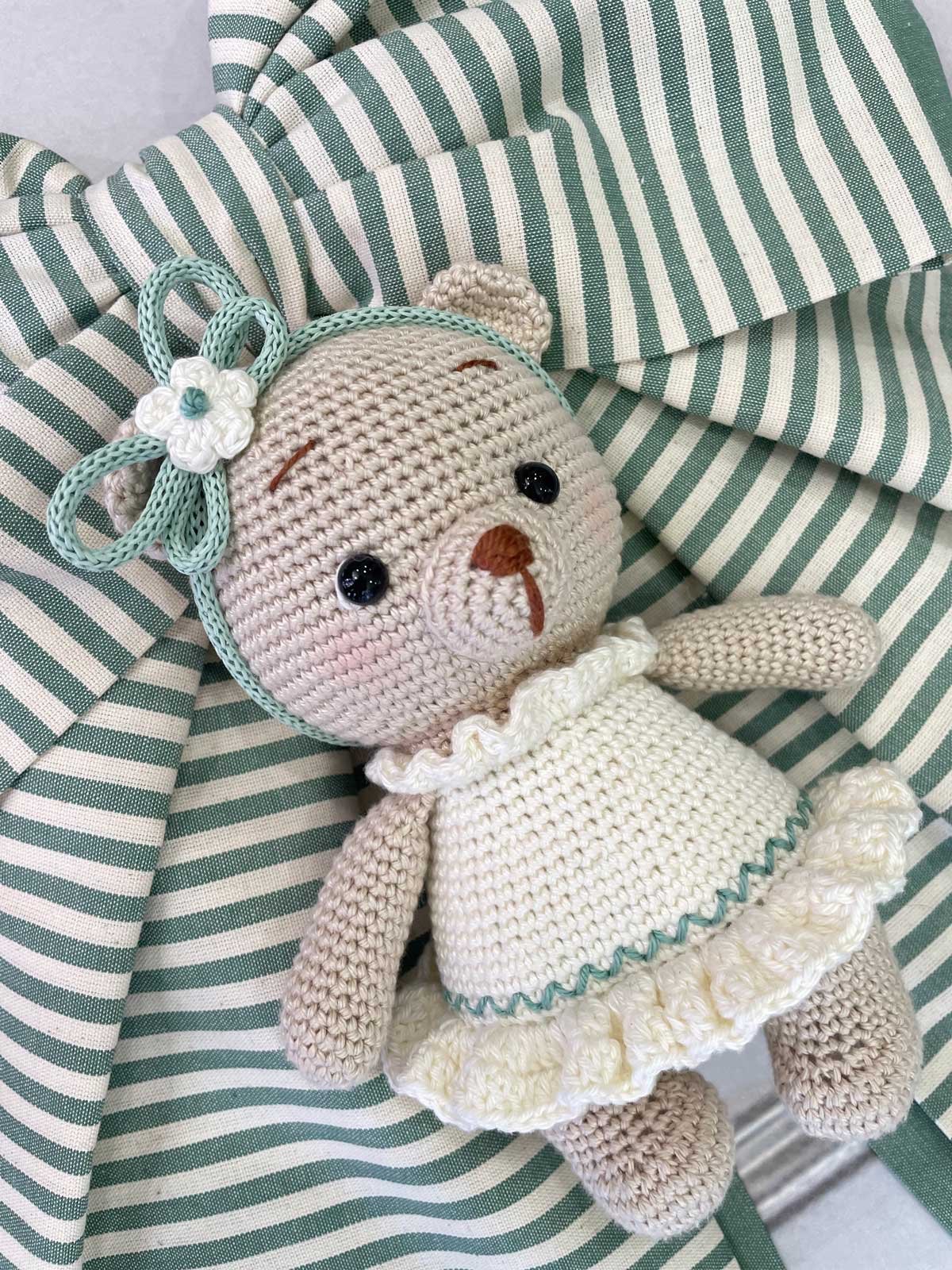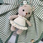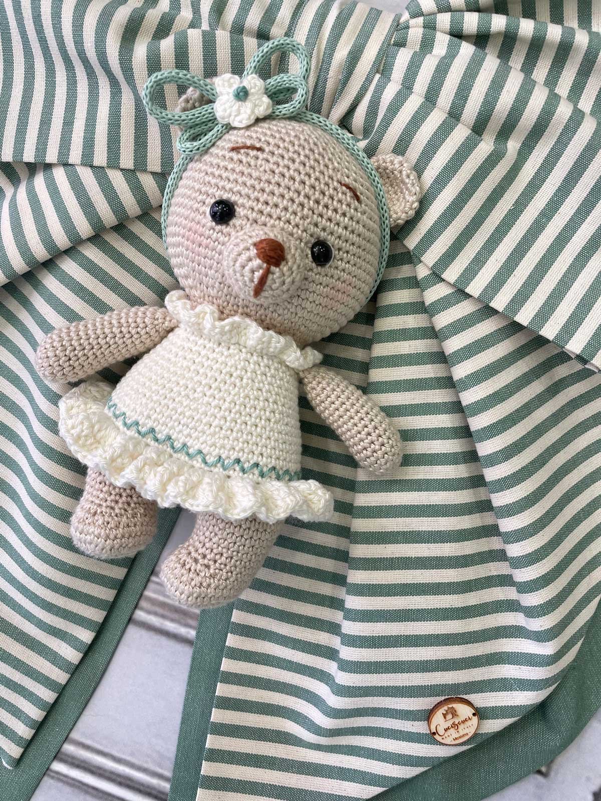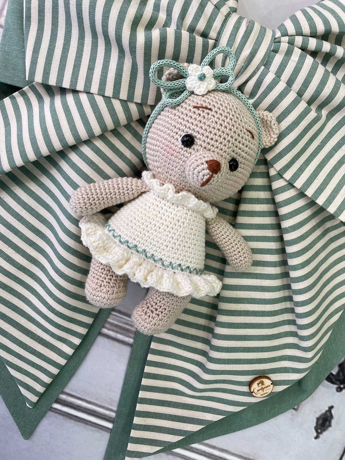 Dal fiocco pende una tenerissima orsetta tridimensionale realizzata con la tecnica amigurumi.