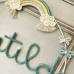 Un cerchio in metallo bianco, decorato con farfalle in crochet e un arcobaleno, fa da cornice a questo fiocco originale.