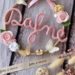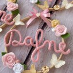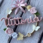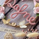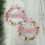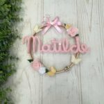 Al centro del telaio, il nome della bimba in tricotin rosa, per un tocco personalizzato e romantico.
