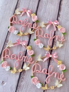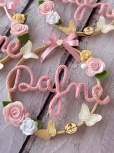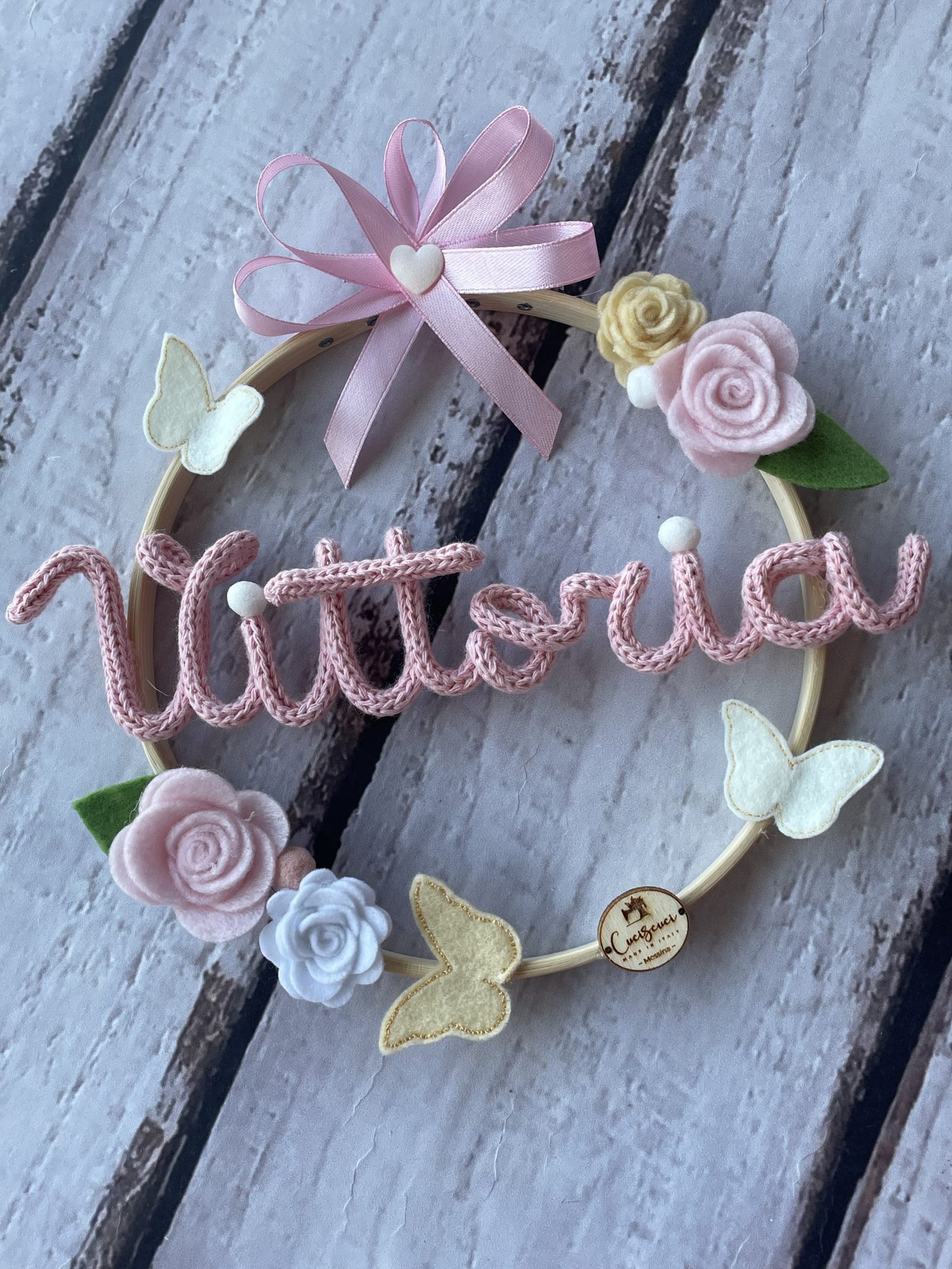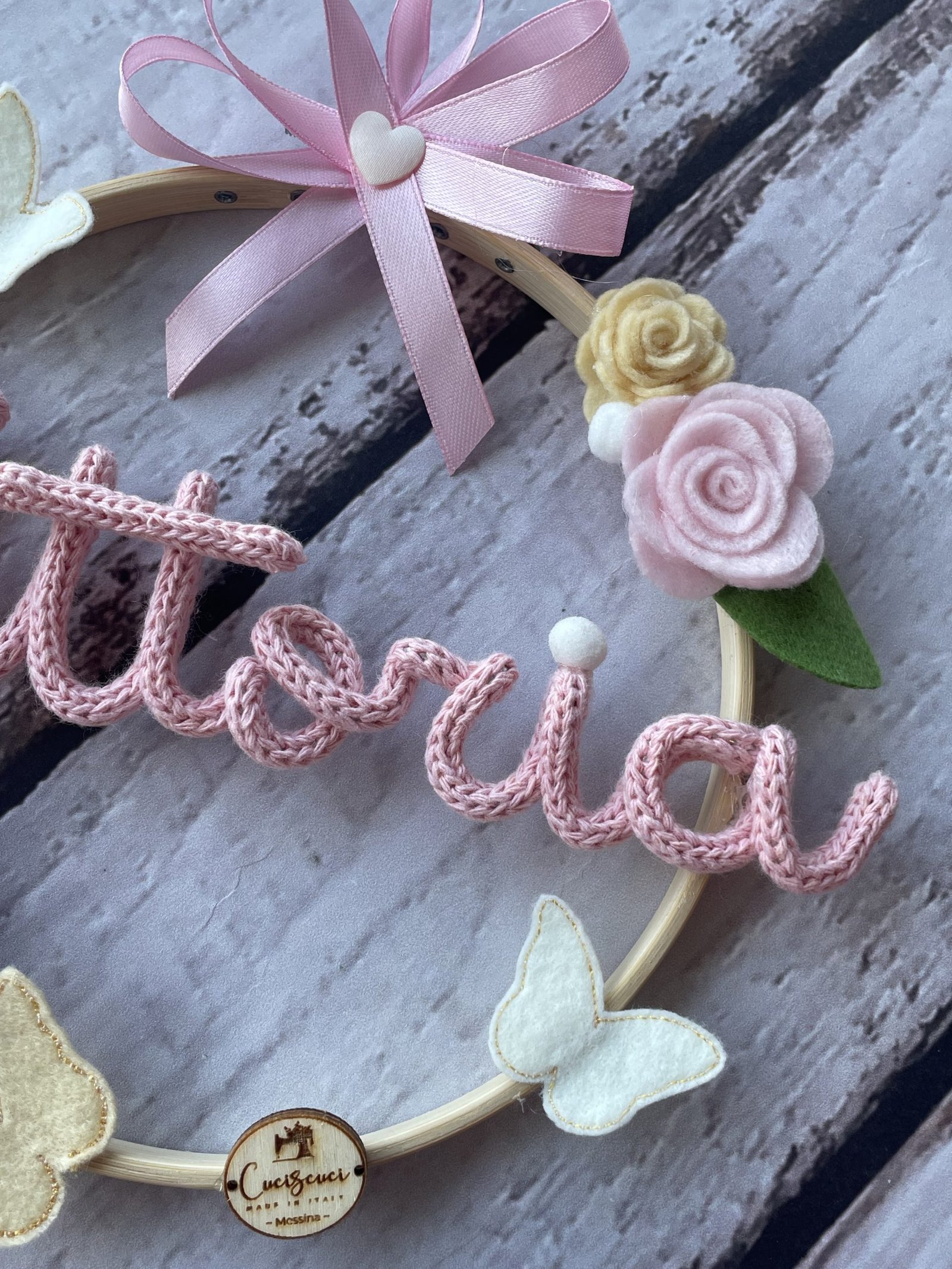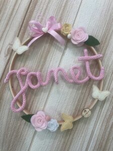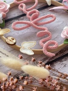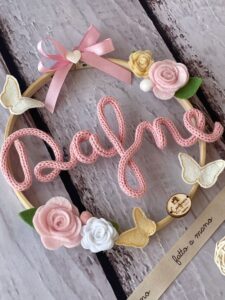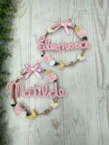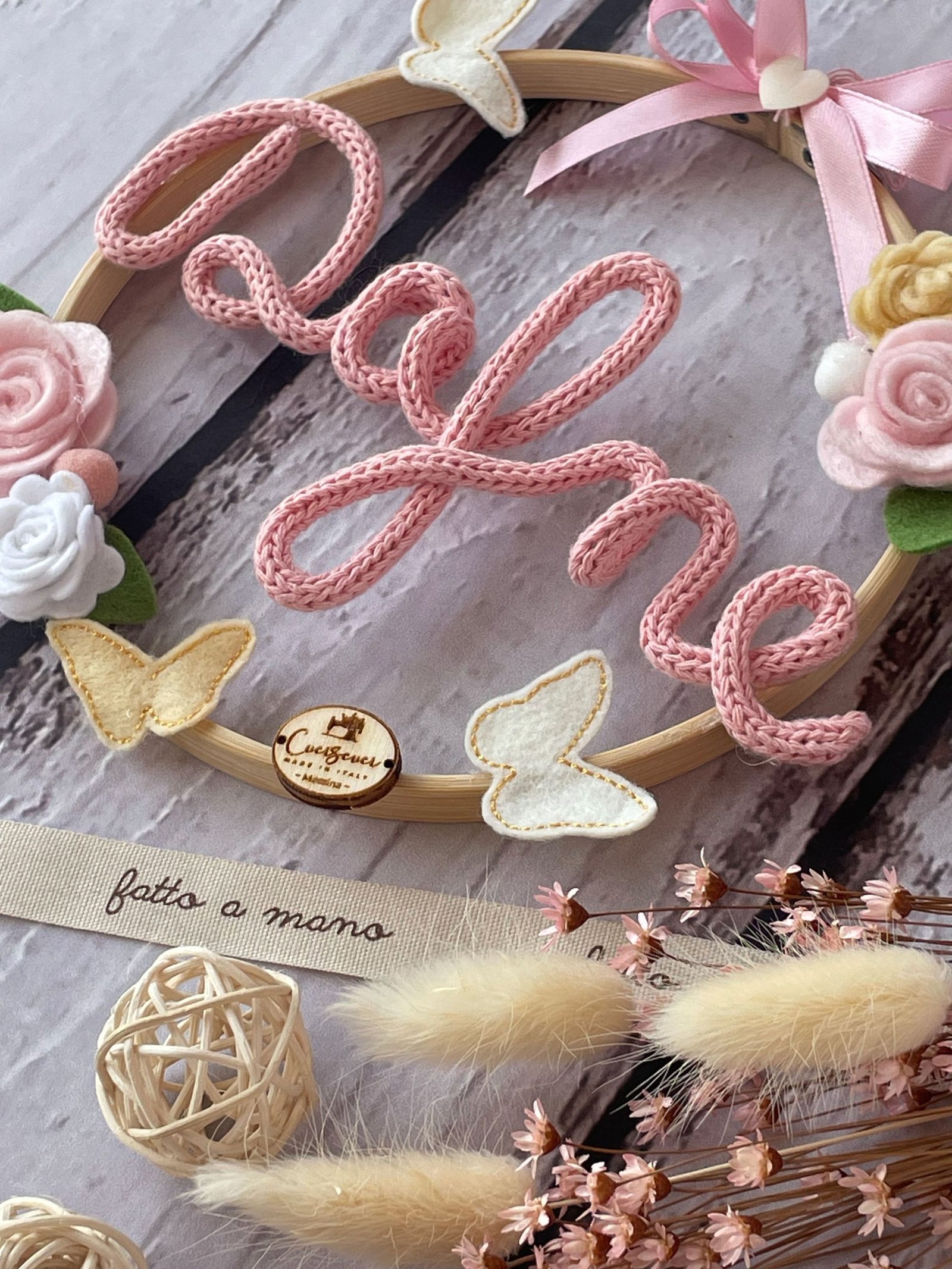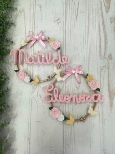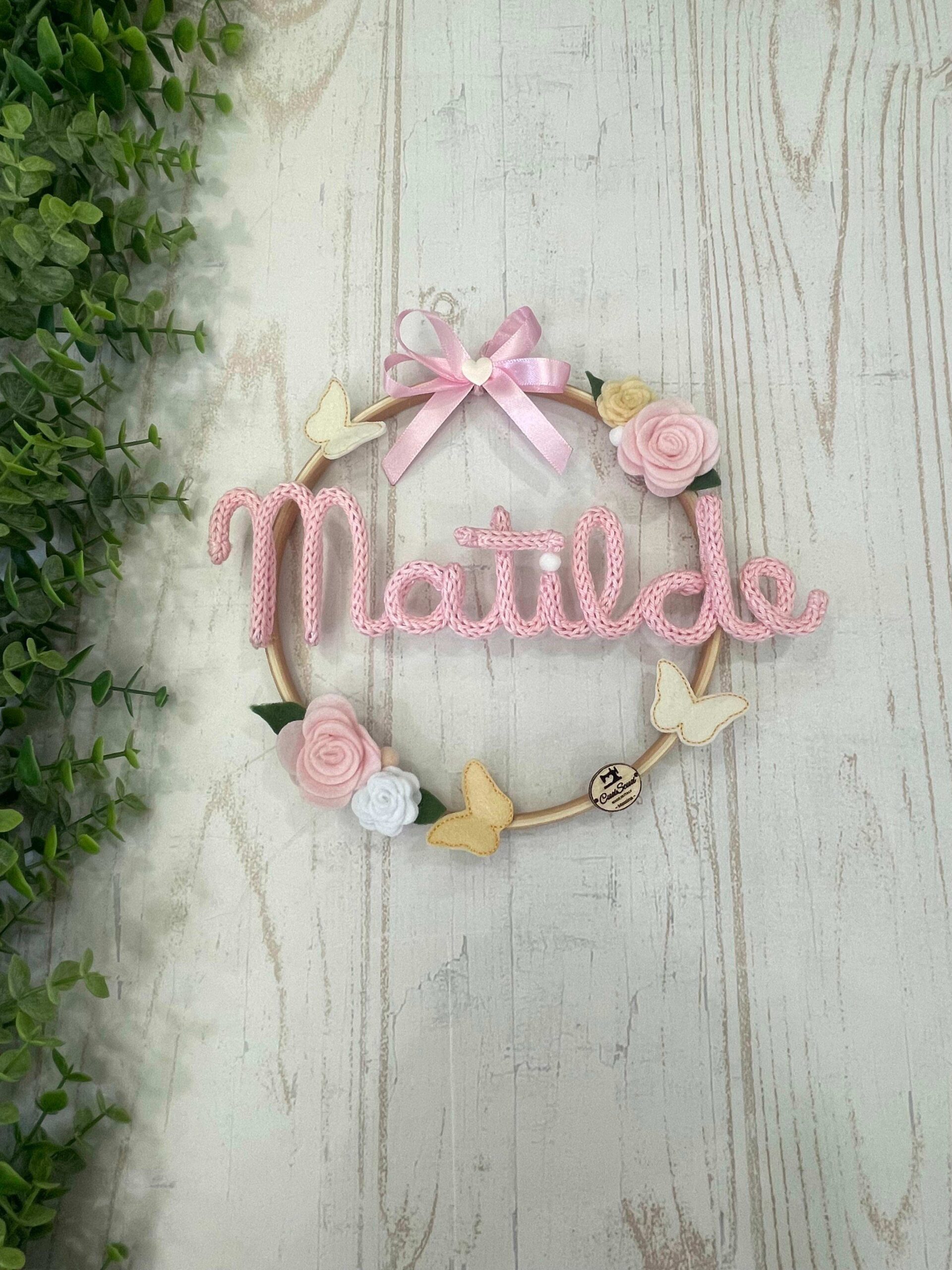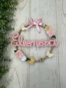 Al centro del telaio, il nome della bimba in tricotin rosa, per un tocco personalizzato e romantico.