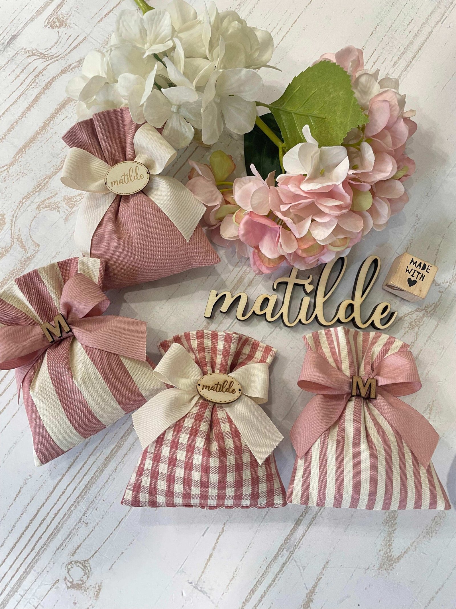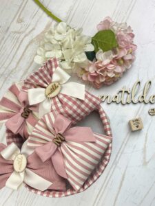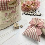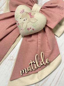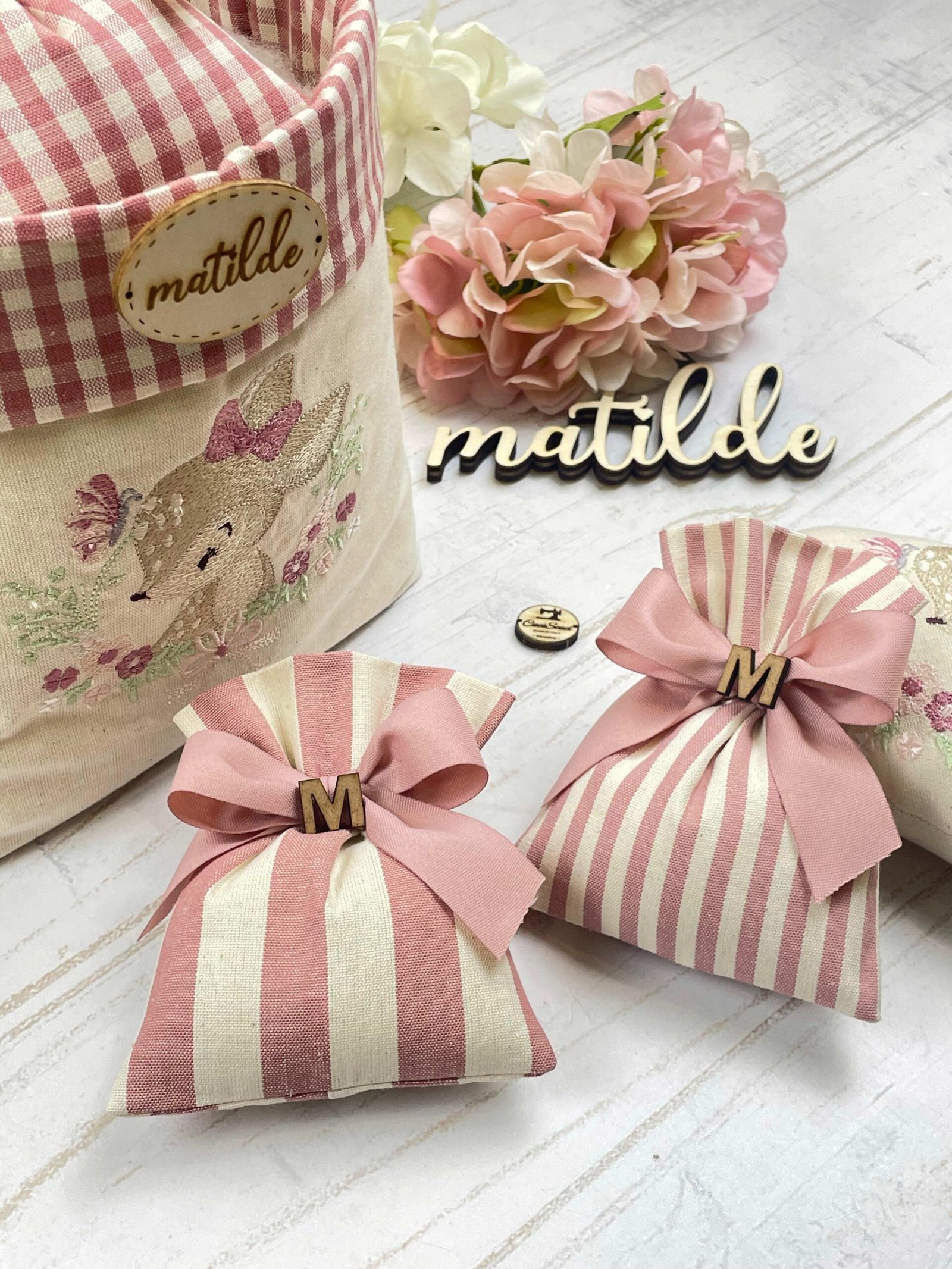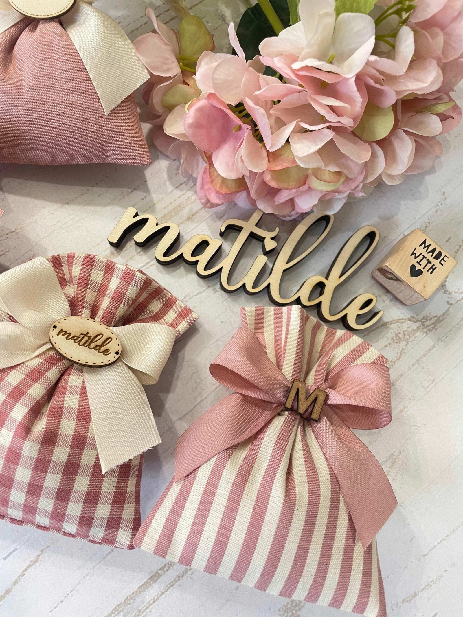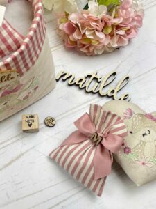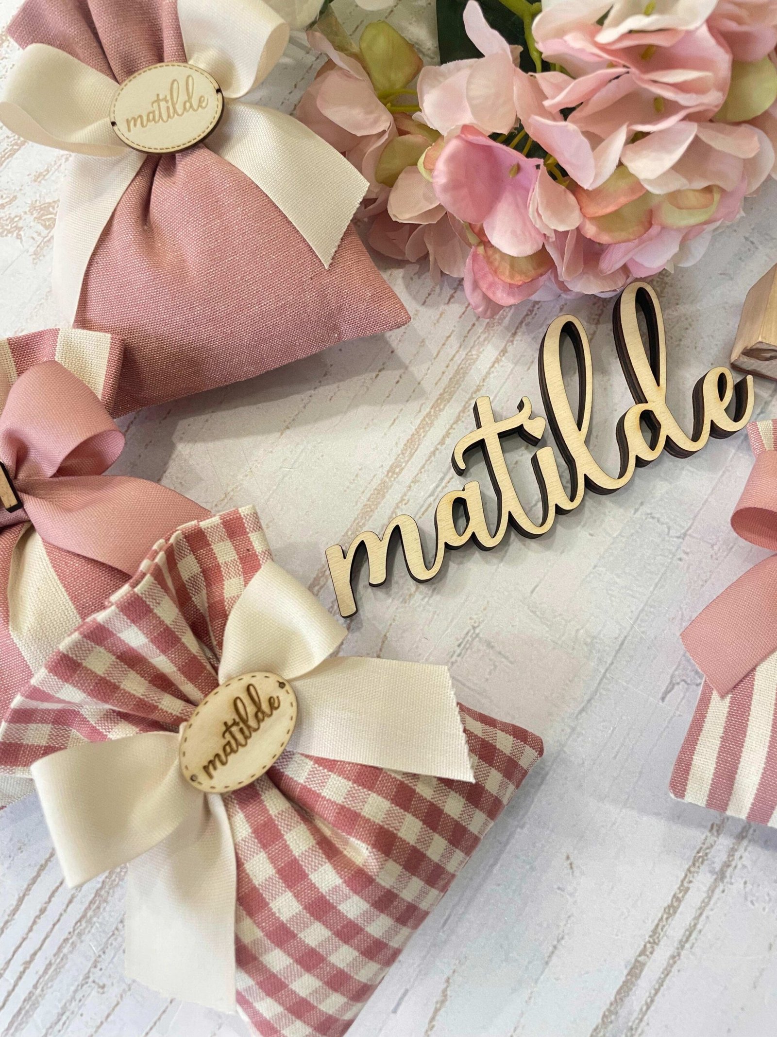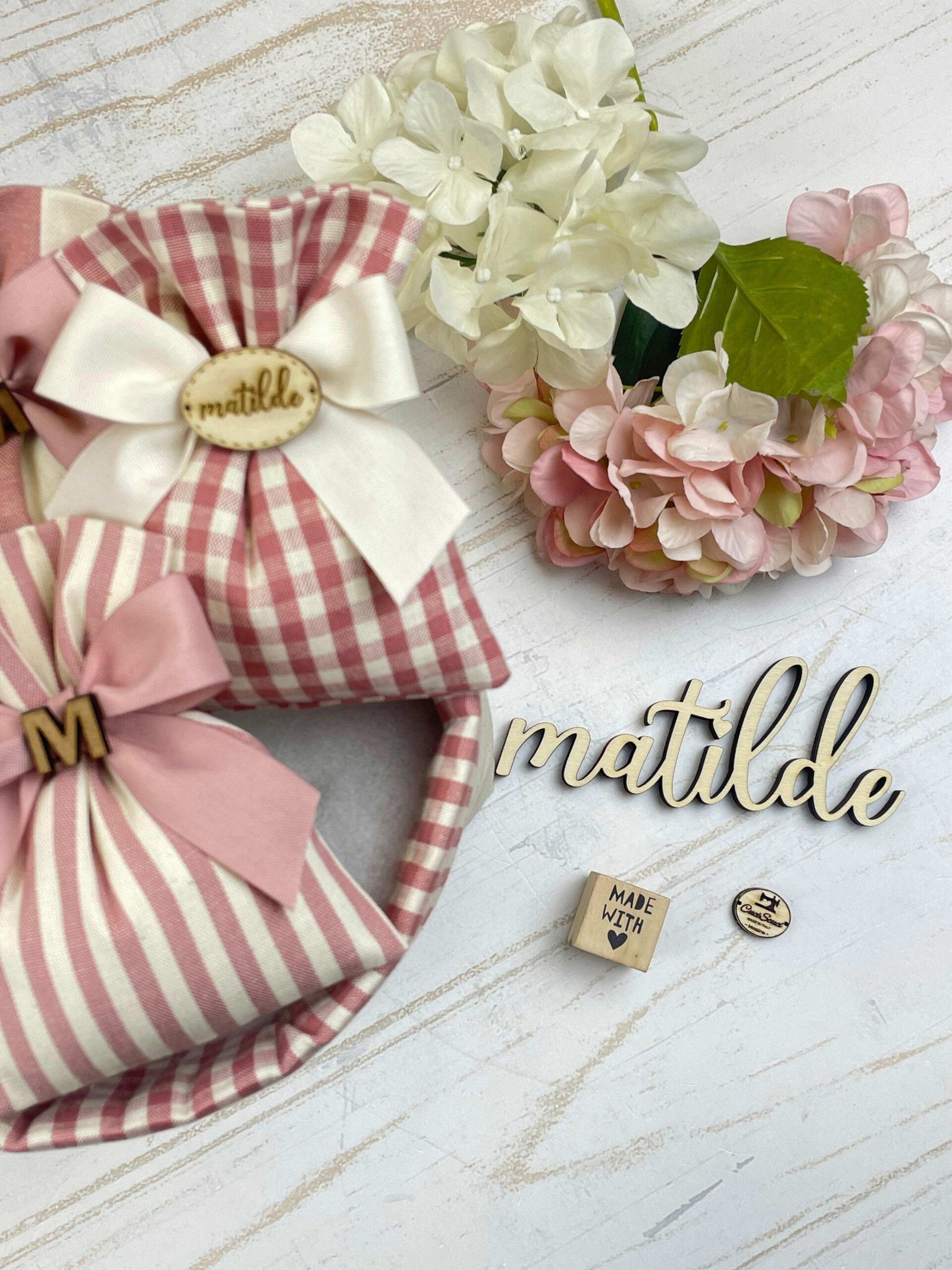 Ogni pezzo è acquistabile singolarmente e personalizzabile con il nome della bambina grazie a una splendida targhetta in legno incisa, che aggiunge un tocco unico e artigianale.