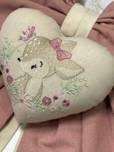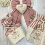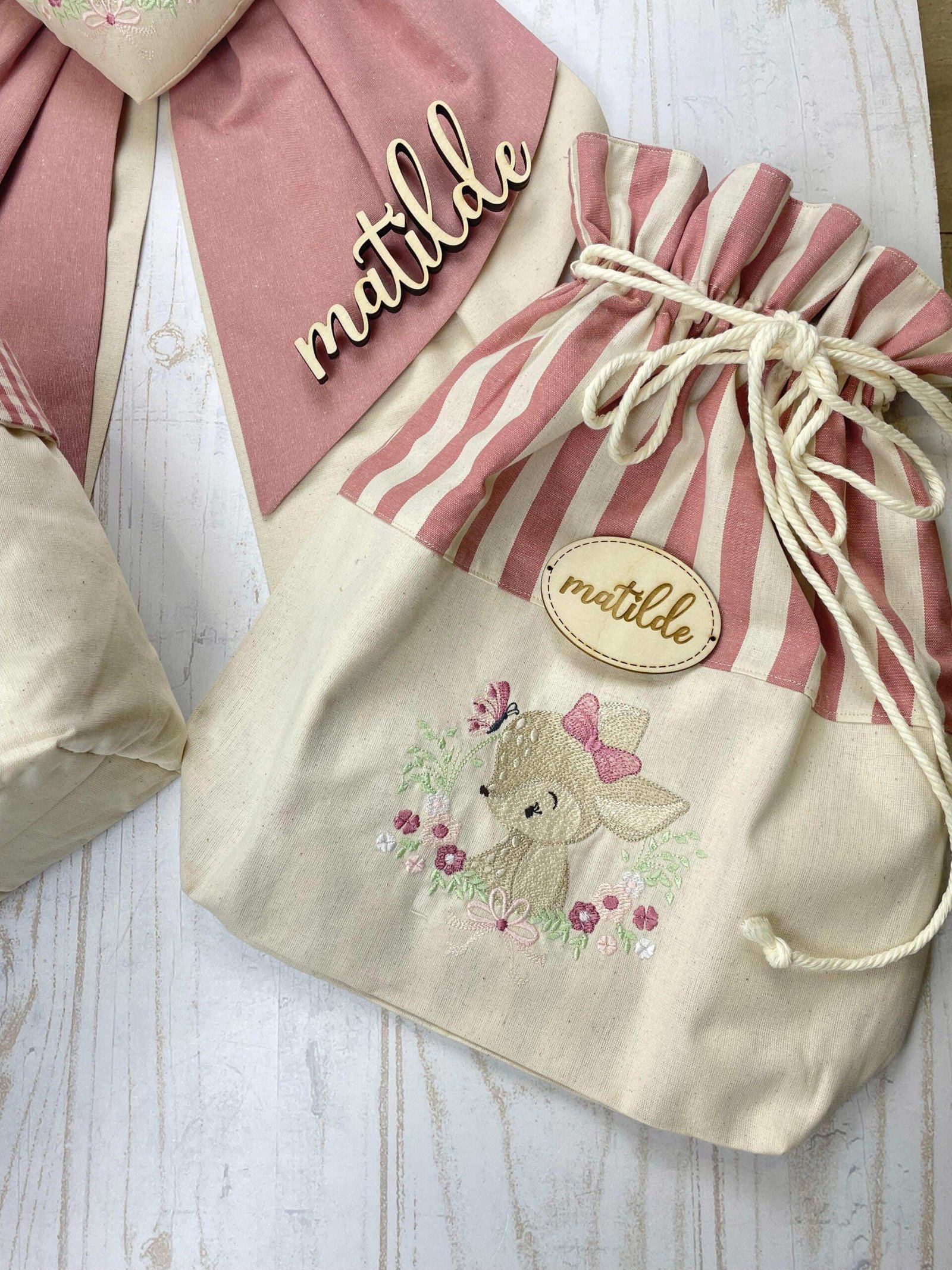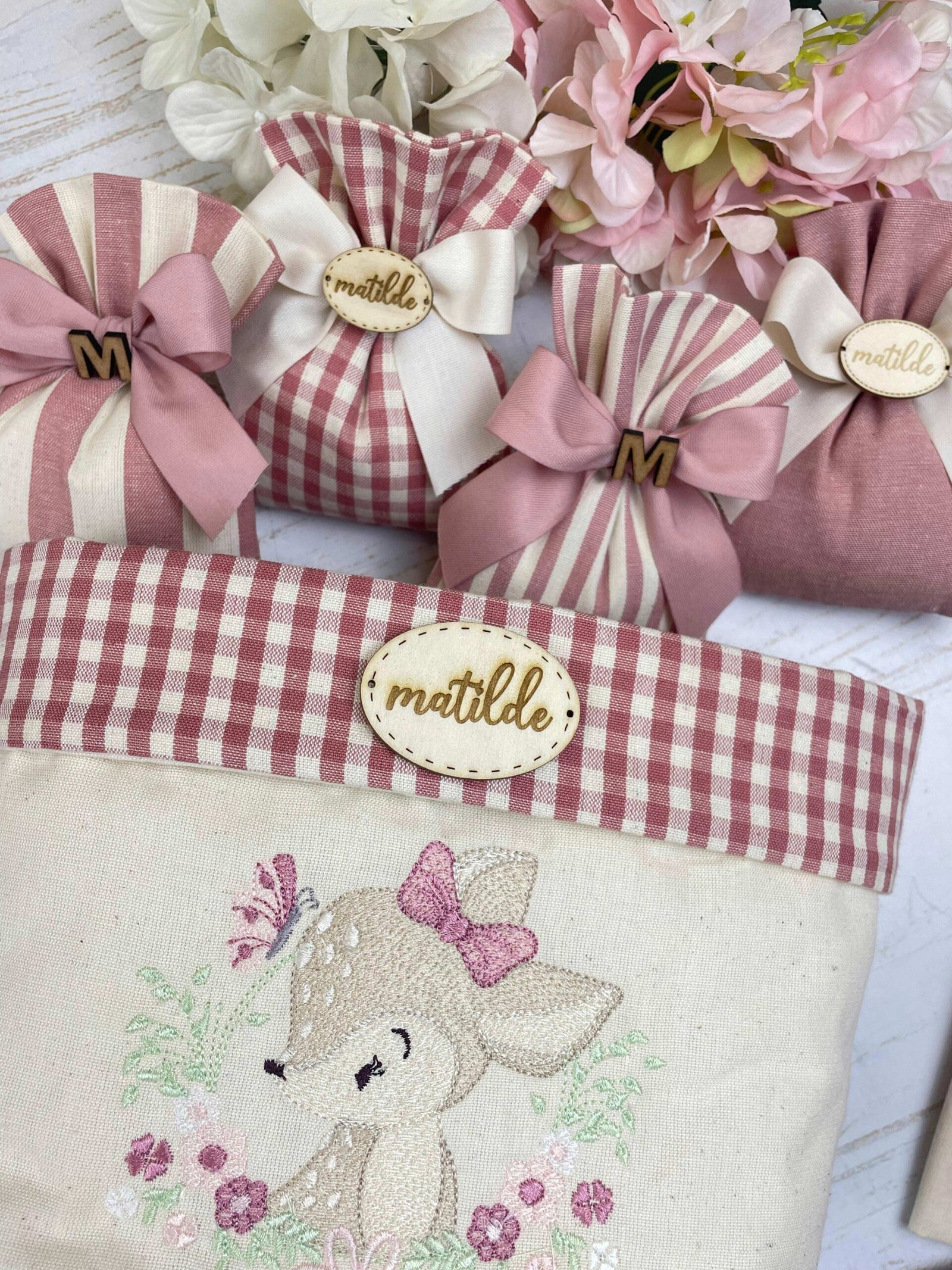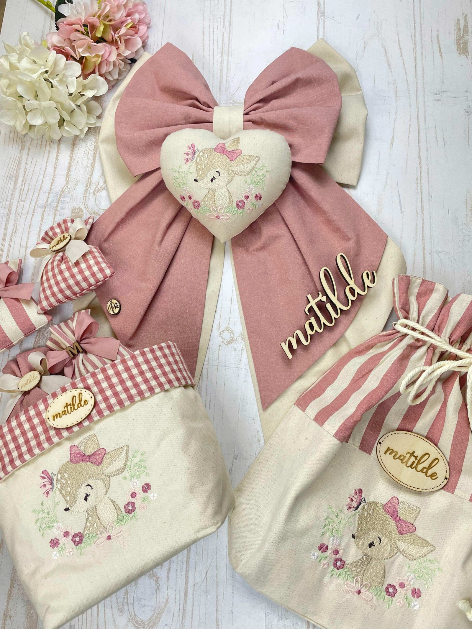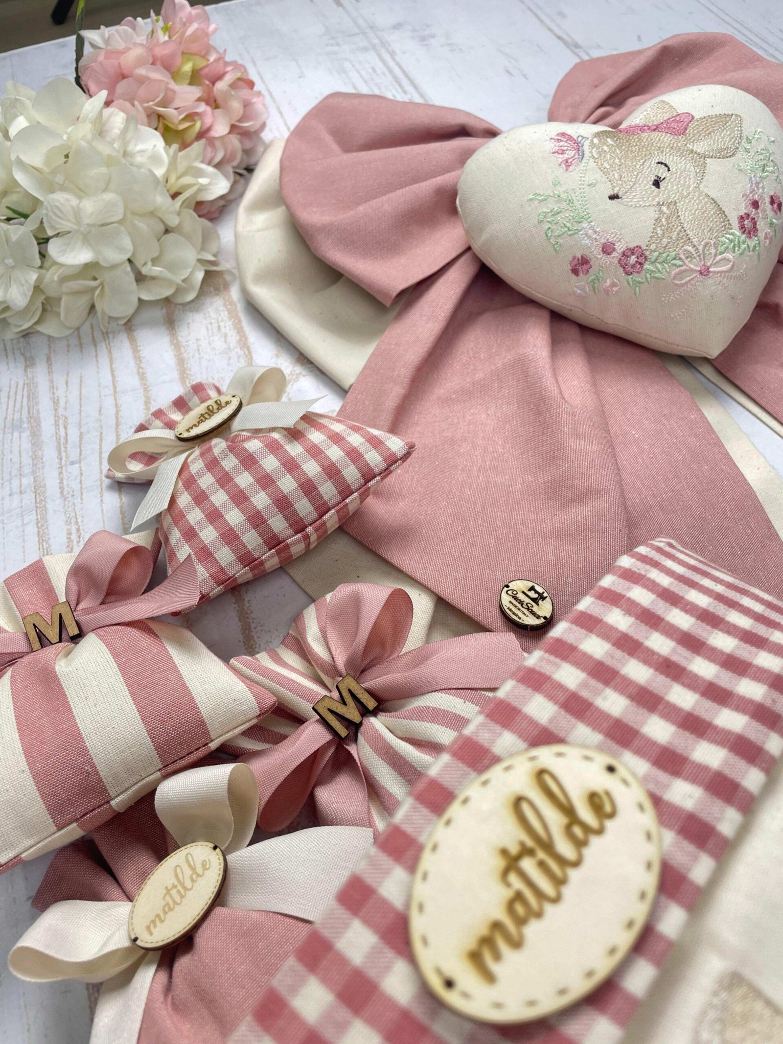 Una collezione raffinata e delicata, perfetta per accogliere con dolcezza una nuova vita. Ogni articolo è realizzato in morbido cotone naturale nei toni del rosa antico e crema, impreziosito da un elegante ricamo con un dolce cerbiatto circondato da fiori.