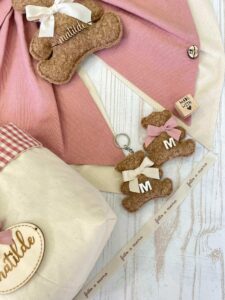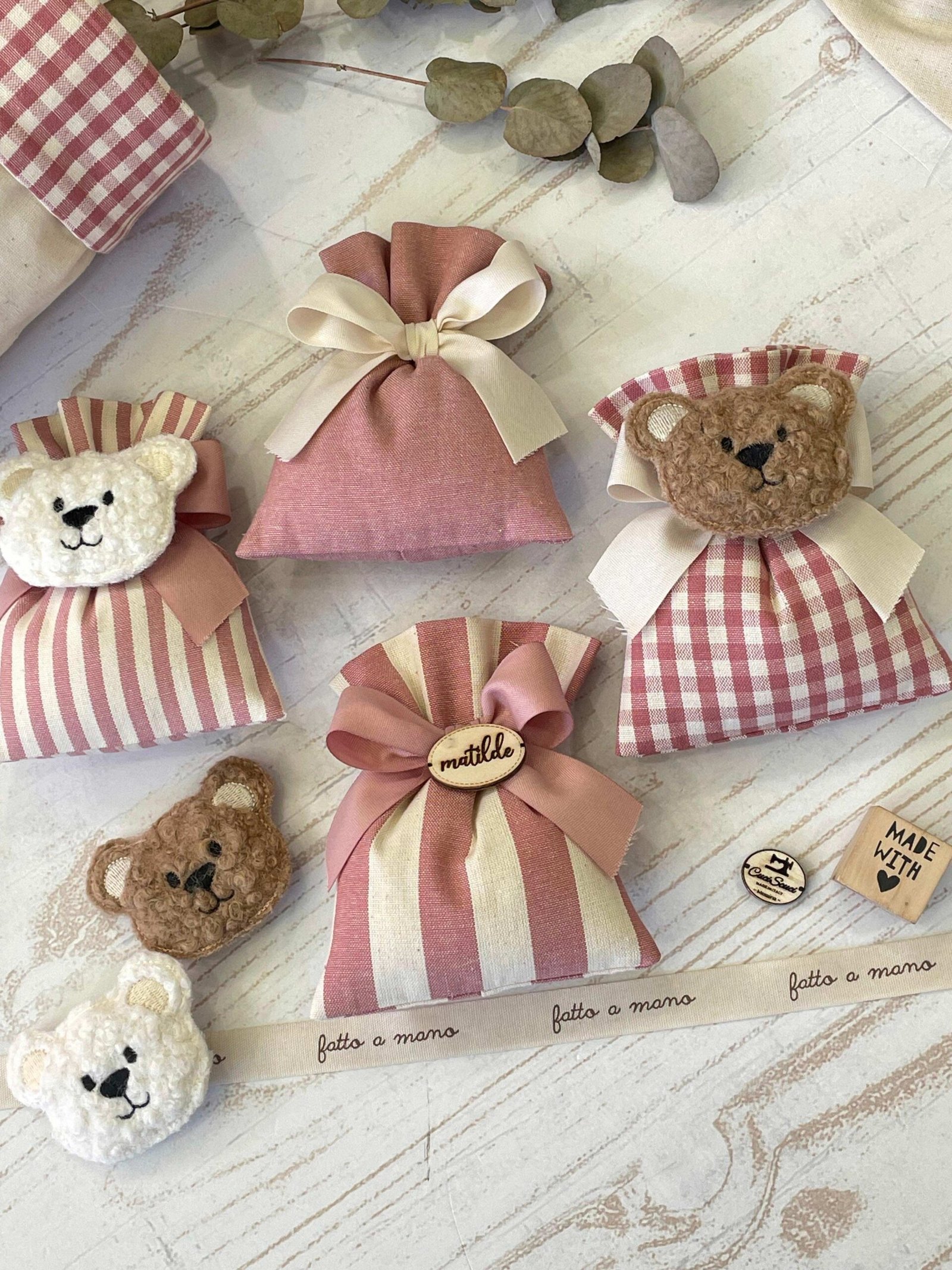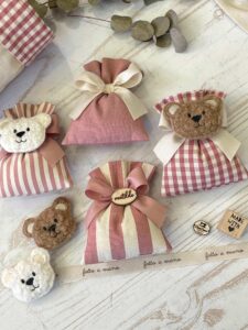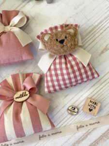 - Sacchetto sartoriale, confezionato con confetti (con orsetto o targhetta in legno personalizzata)