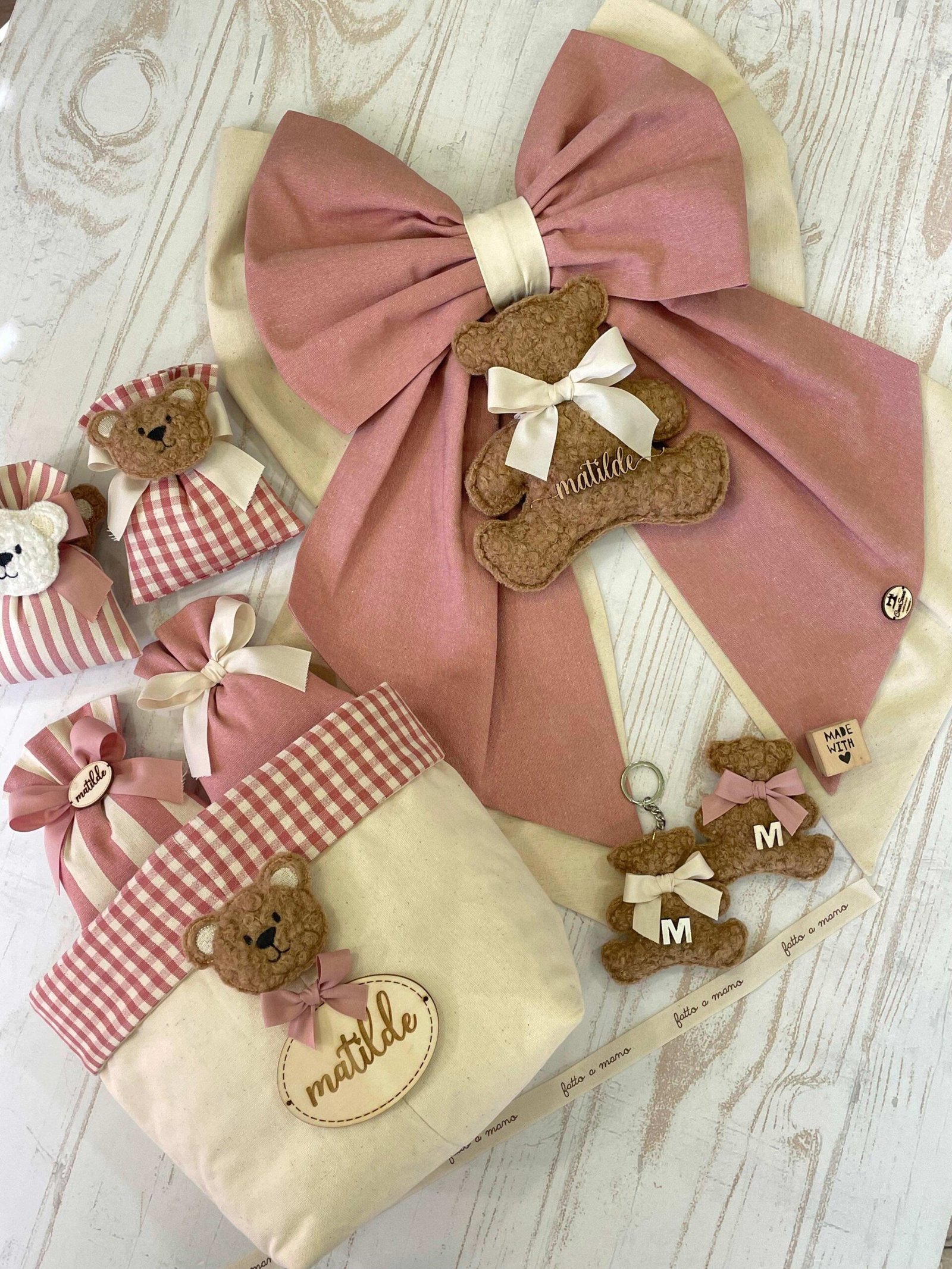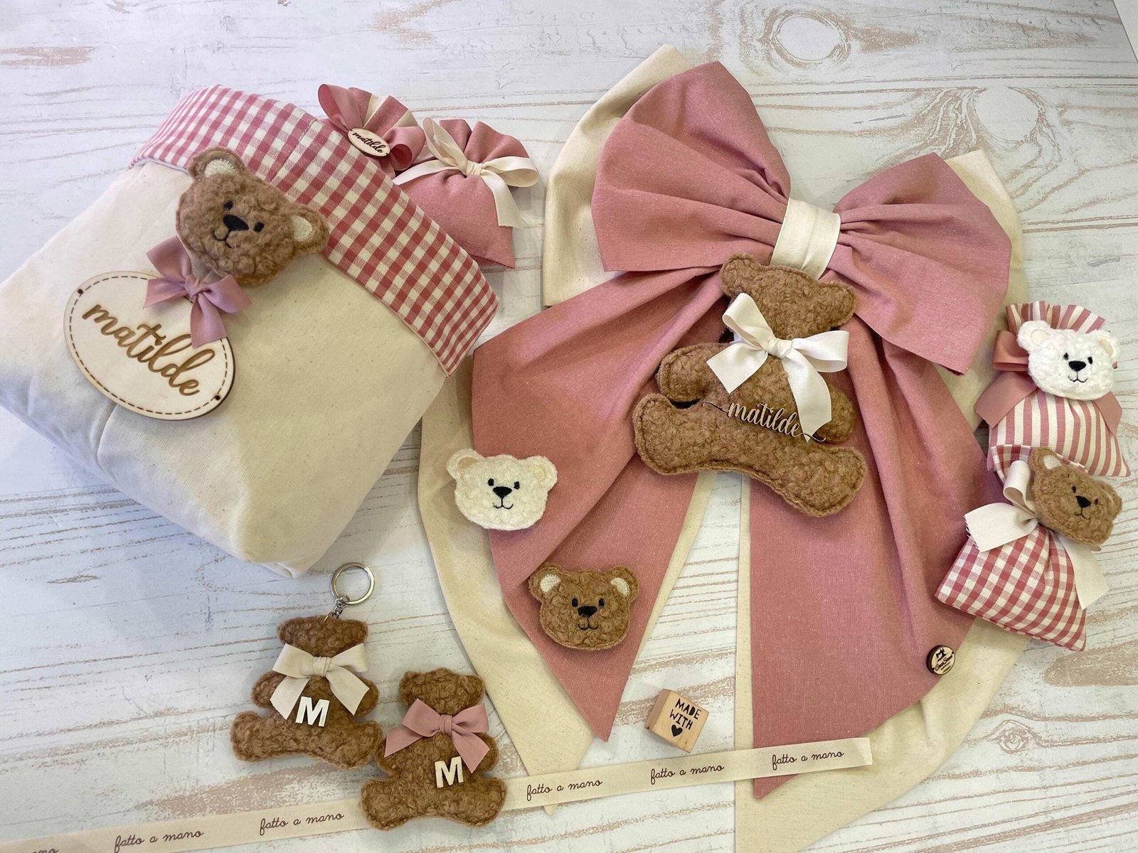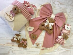 Una collezione raffinata e delicata, perfetta per accogliere con dolcezza una nuova vita. Ogni articolo è realizzato in morbido cotone naturale nei toni del rosa antico e crema, impreziosito da un un orsetto in tessuto bouclè e una targhetta in legno personalizzata.