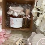 barattolo di miele con copri barattolo ricamato, etichetta personalizzata, cucchiaio spargi miele, scatola e nastri.