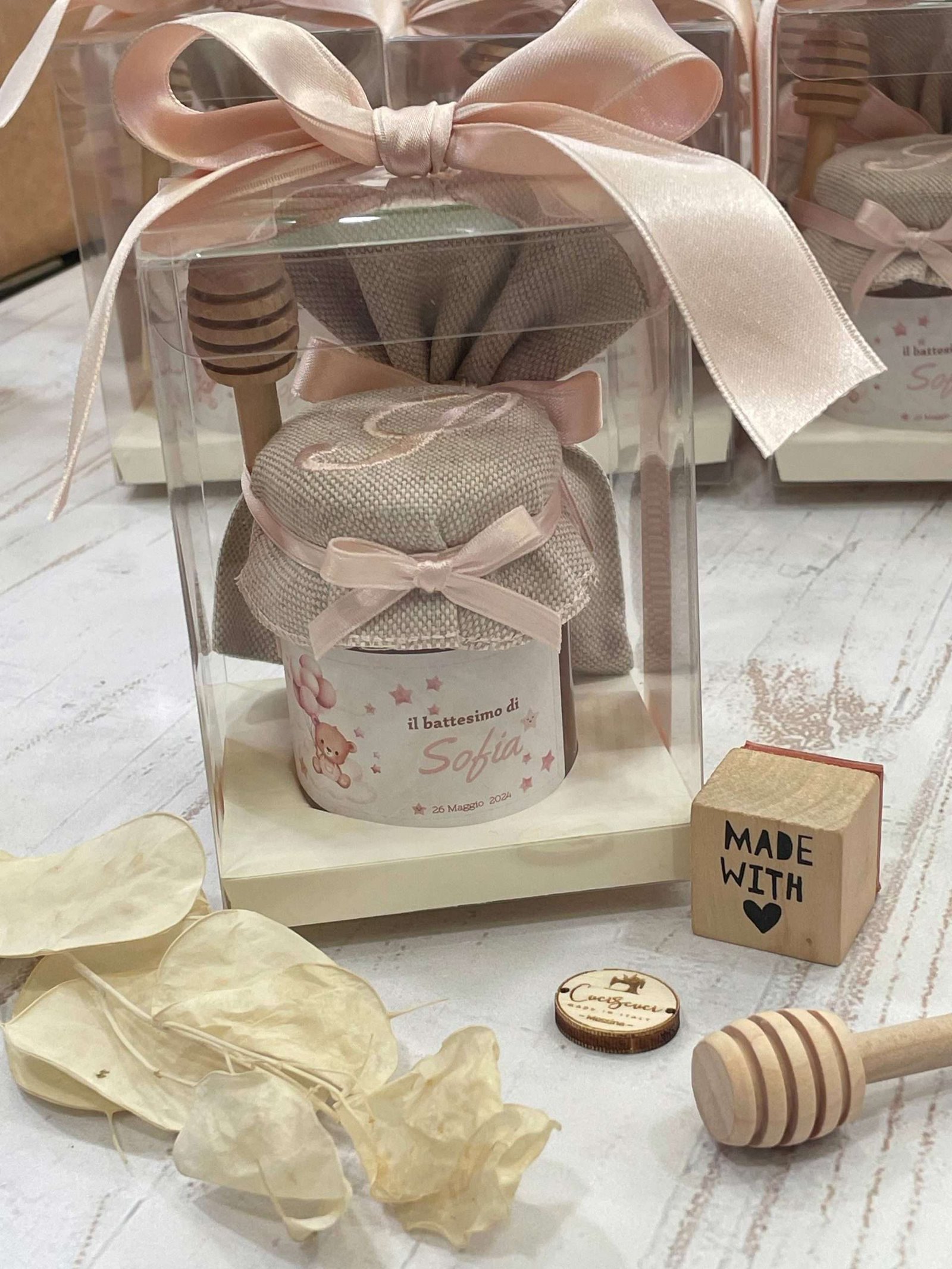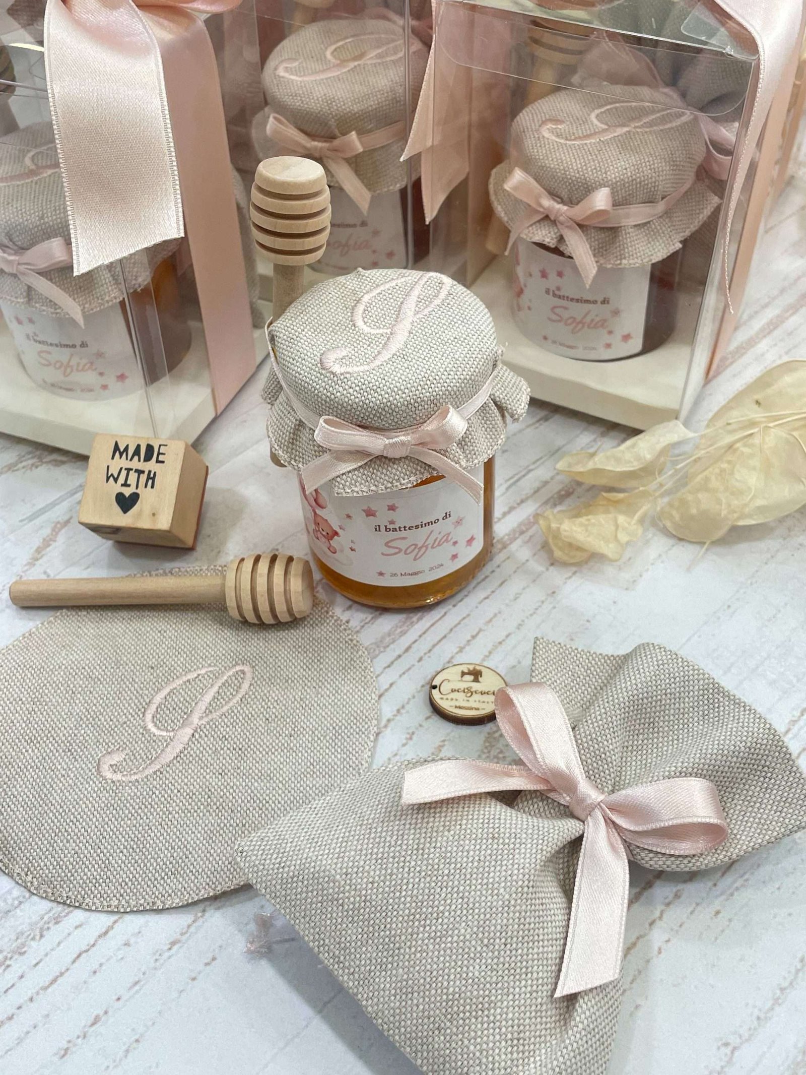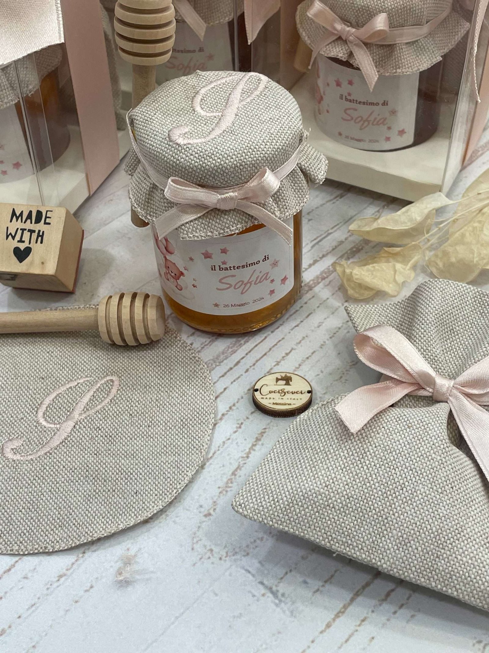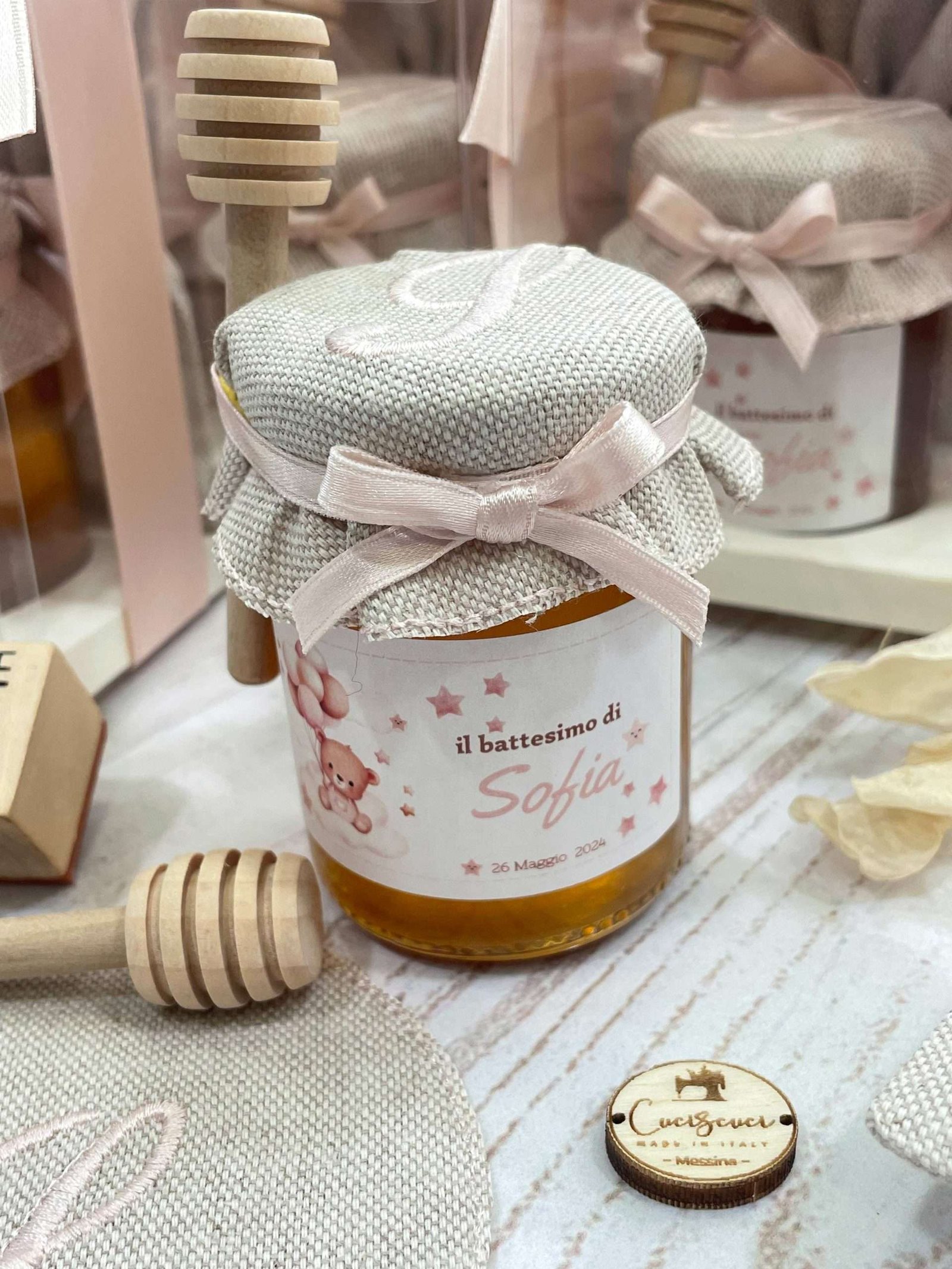Un’elegante bomboniera che unisce dolcezza e cura artigianale, pensata per rendere unico ogni evento speciale. Il barattolo di miele da 100 g è impreziosito da etichetta personalizzata a tema orsetto e da un delicato copri barattolo in tela di cotone ricamato con l’iniziale del festeggiato/a, per un risultato raffinato e armonioso.
