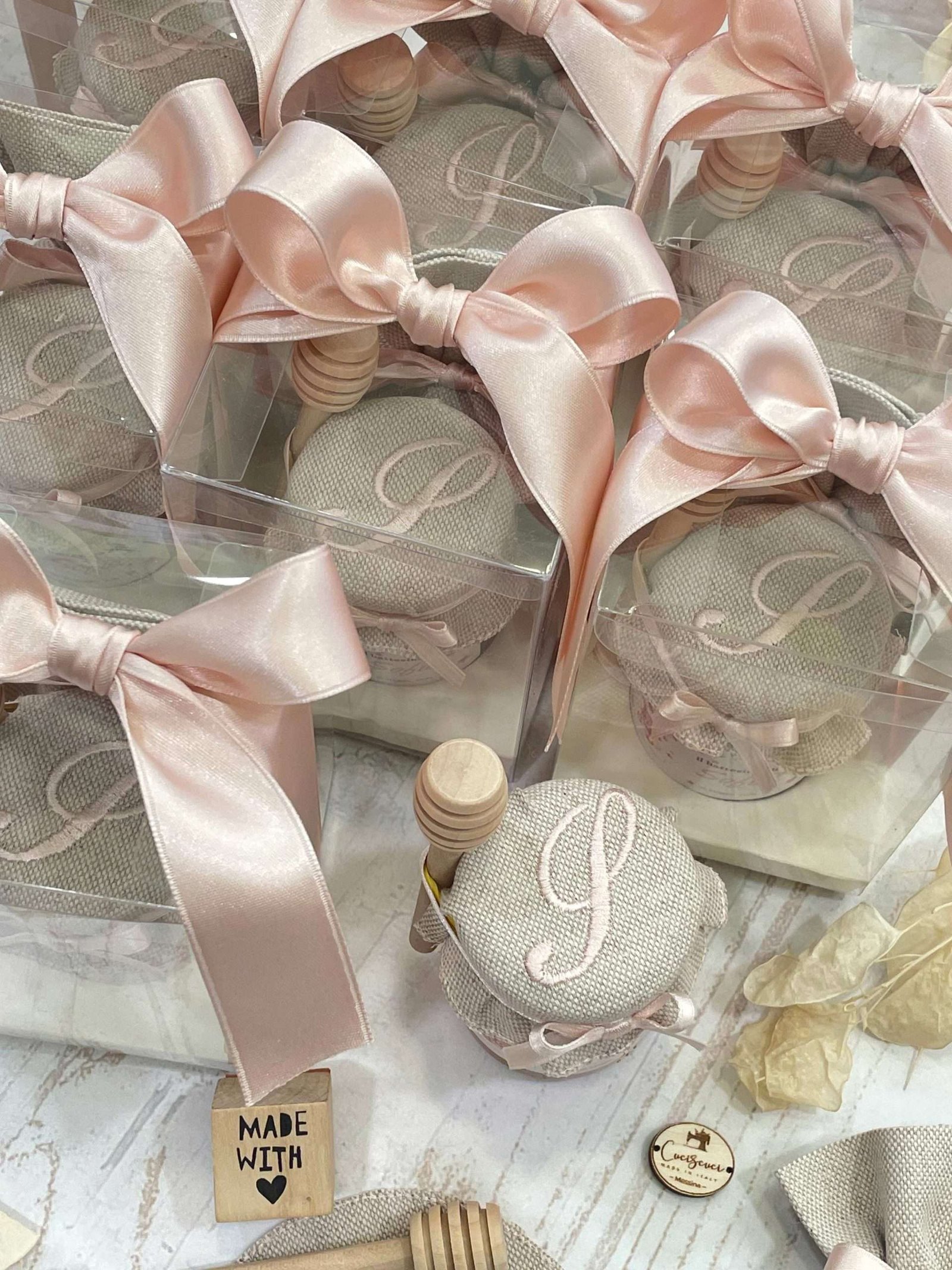 💛 L’equilibrio tra materiali naturali, lavorazione sartoriale e dettagli personalizzati dona a questa creazione un fascino autentico, perfetto per chi desidera una bomboniera elegante e significativa.