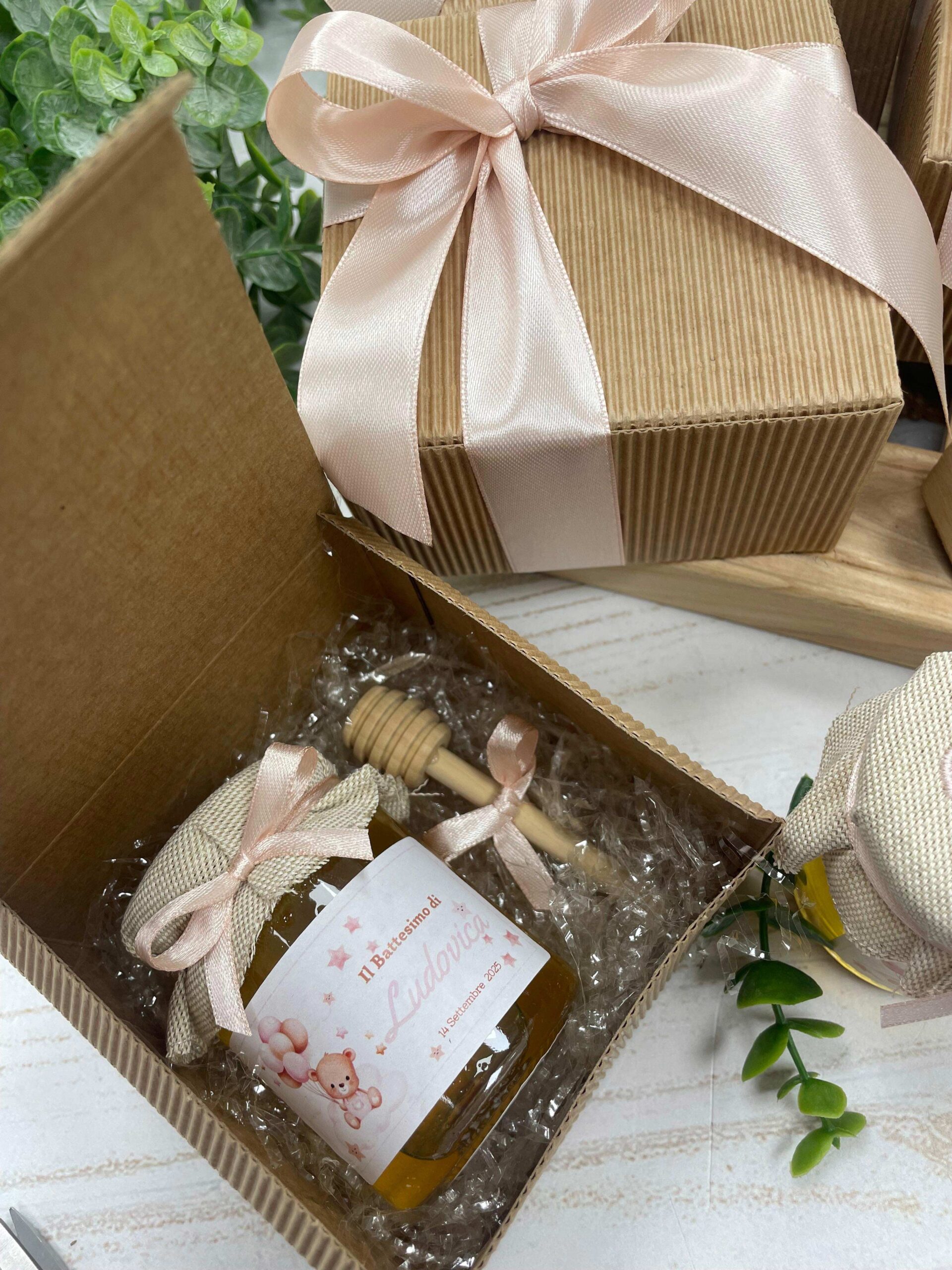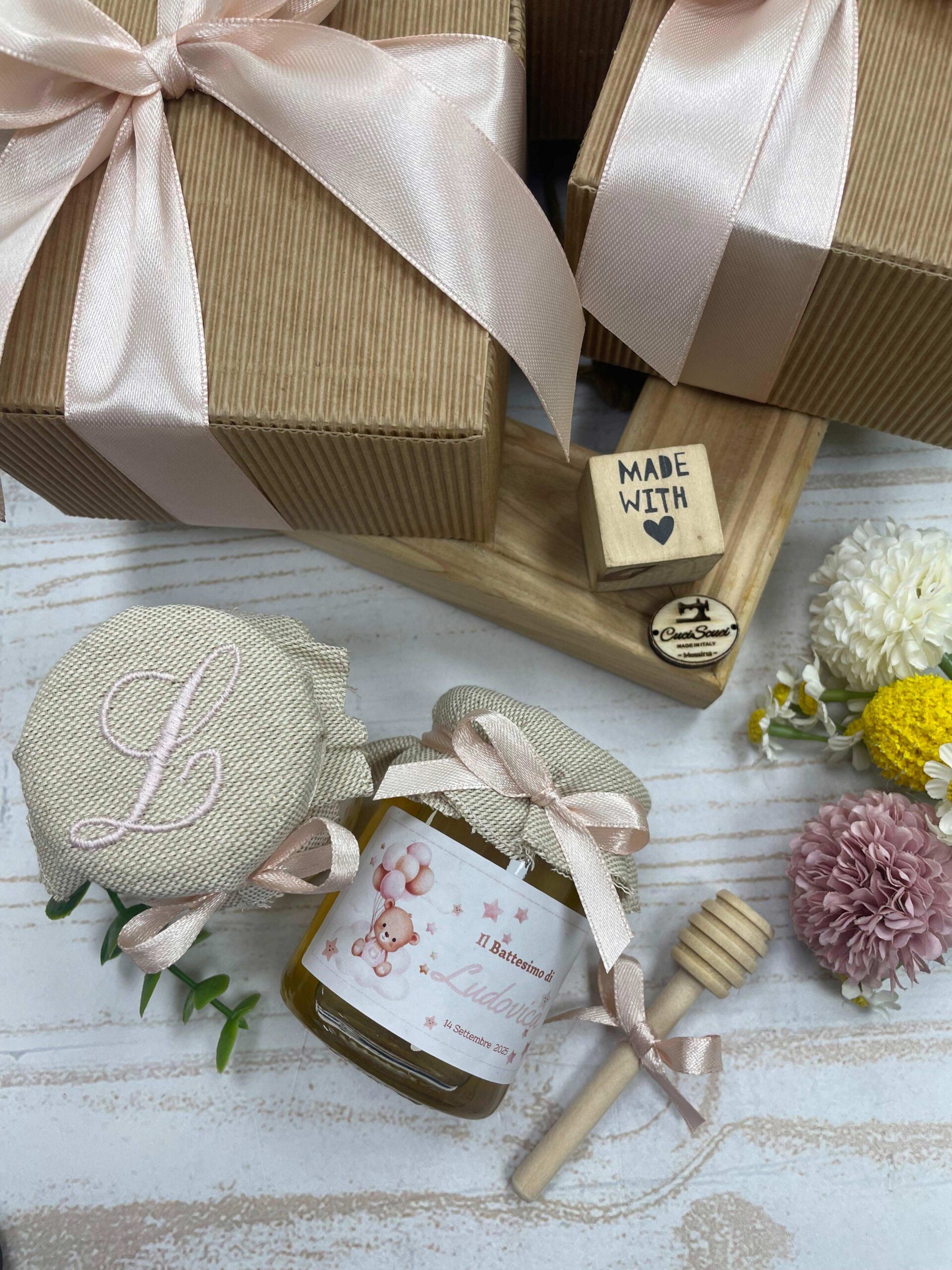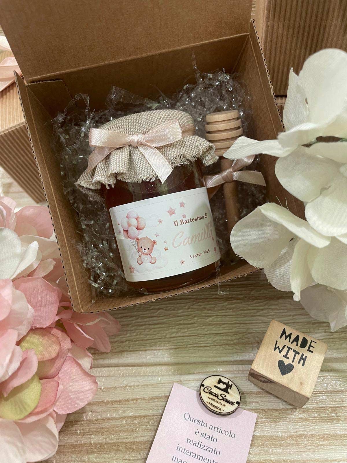 barattolo di miele con copri barattolo ricamato, etichetta personalizzata, cucchiaio spargi miele, scatola e nastri.