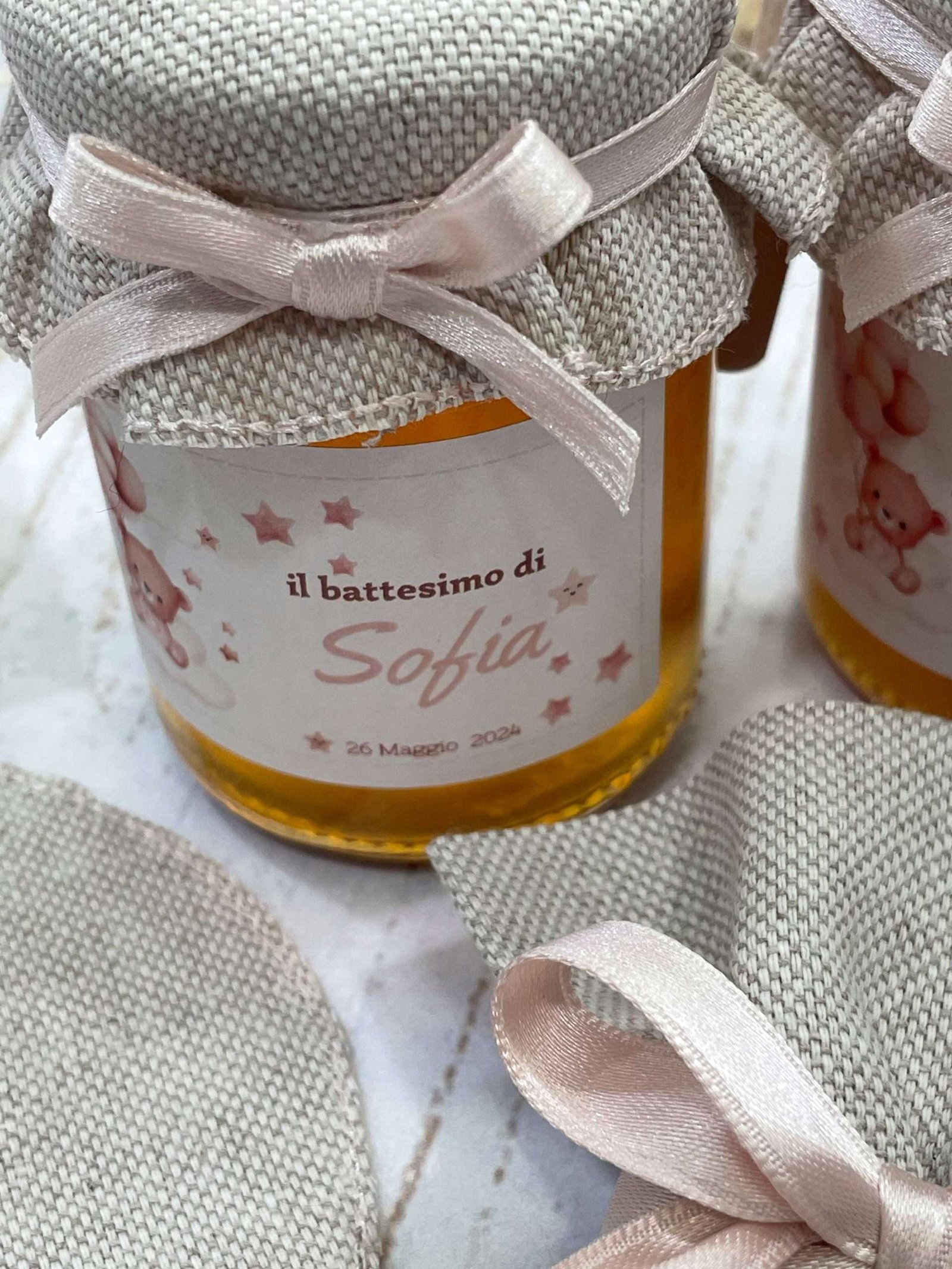Barattolo di miele da 100 g con etichetta personalizzata con tema orsetto e copri barattolo in tela di cotone ricamato con iniziale del festeggiato/a di colore rosa.