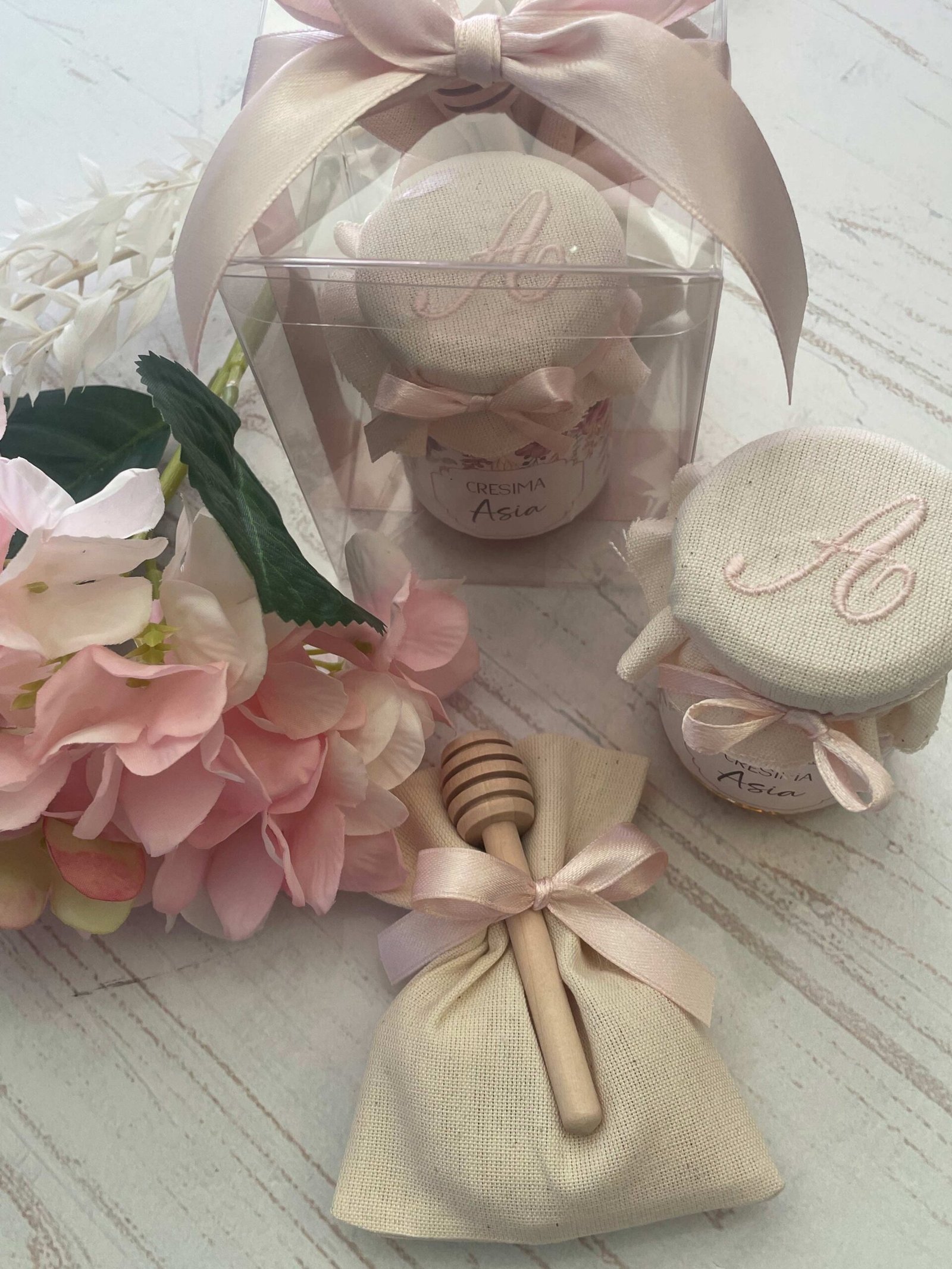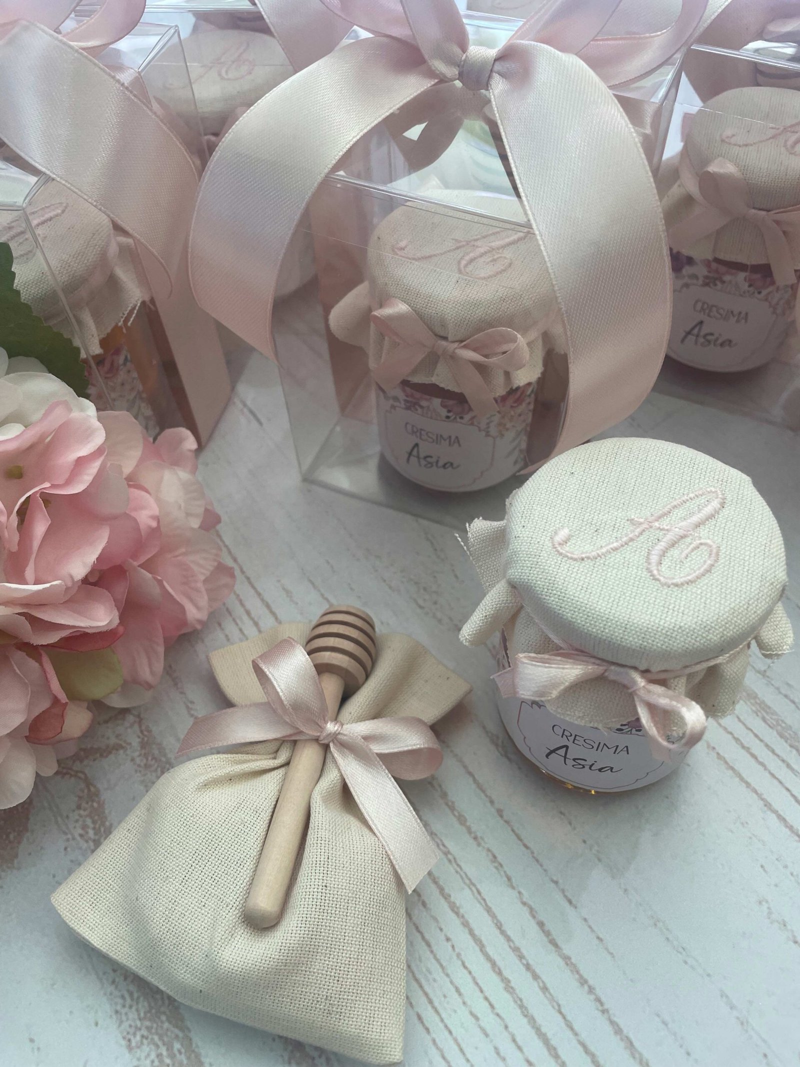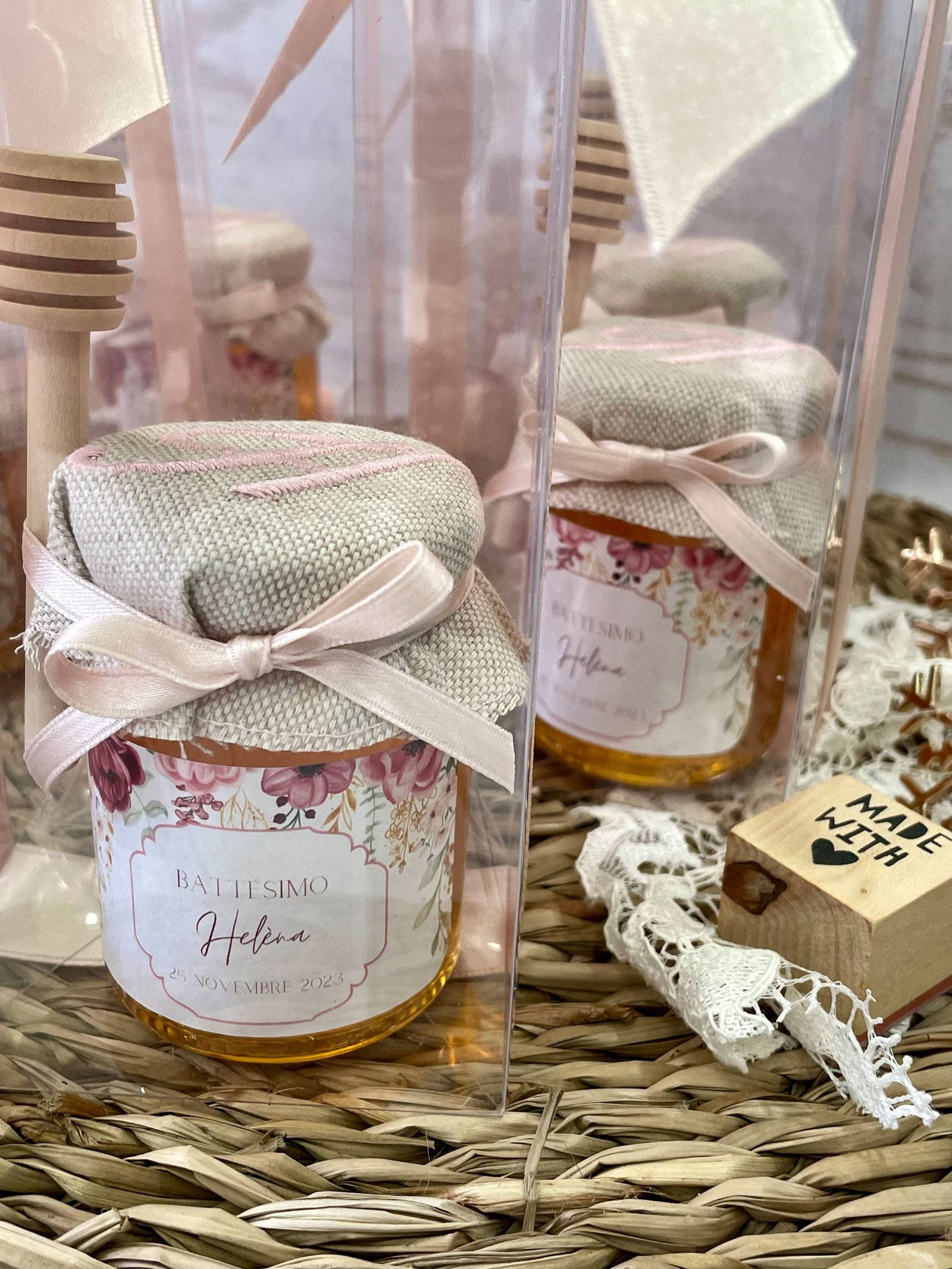 barattolo di miele con copri barattolo ricamato, etichetta personalizzata, mini sacchetto sartoriale con 5 confetti in busta sigillata, cucchiaio spargi miele, scatola e nastri, così come in foto.