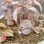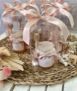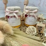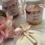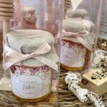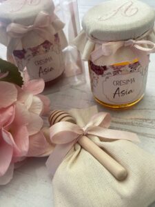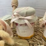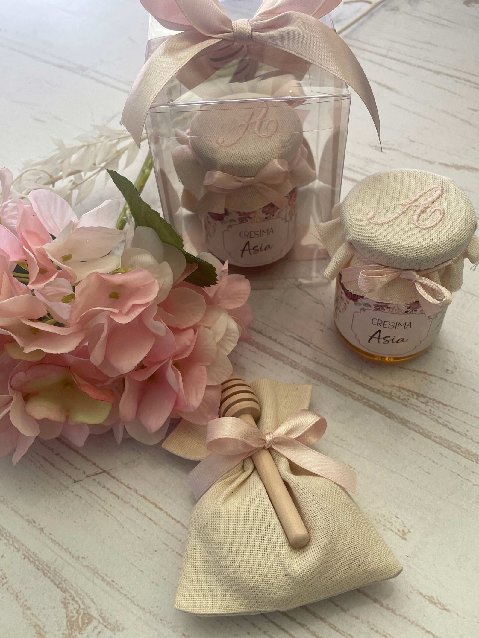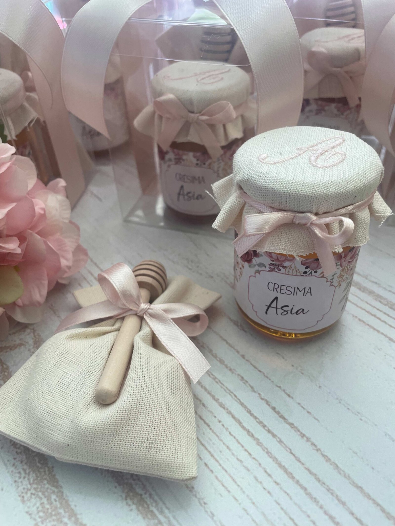 barattolo di miele con copri barattolo ricamato, etichetta personalizzata, mini sacchetto sartoriale con 5 confetti in busta sigillata, cucchiaio spargi miele, scatola e nastri, così come in foto.