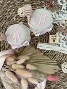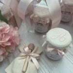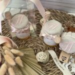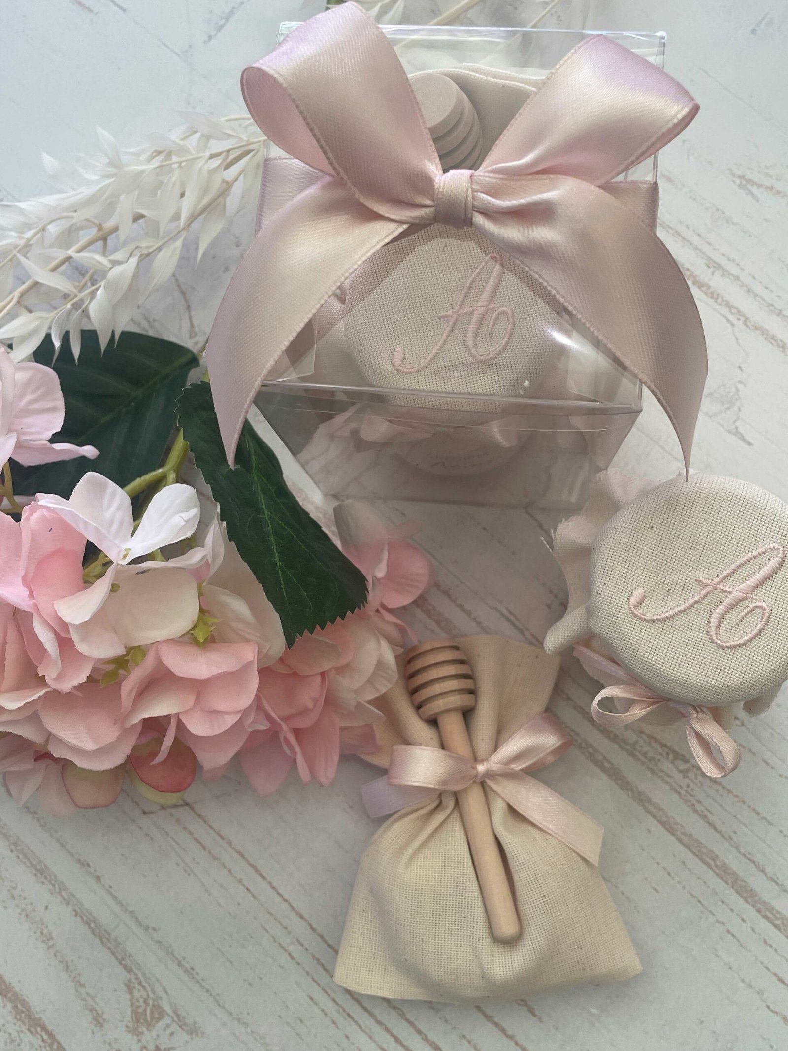 Barattolo di miele da 100 g con etichetta personalizzata con tema fiori e copri barattolo in tela di cotone ricamato con iniziale del festeggiato/a di colore rosa.