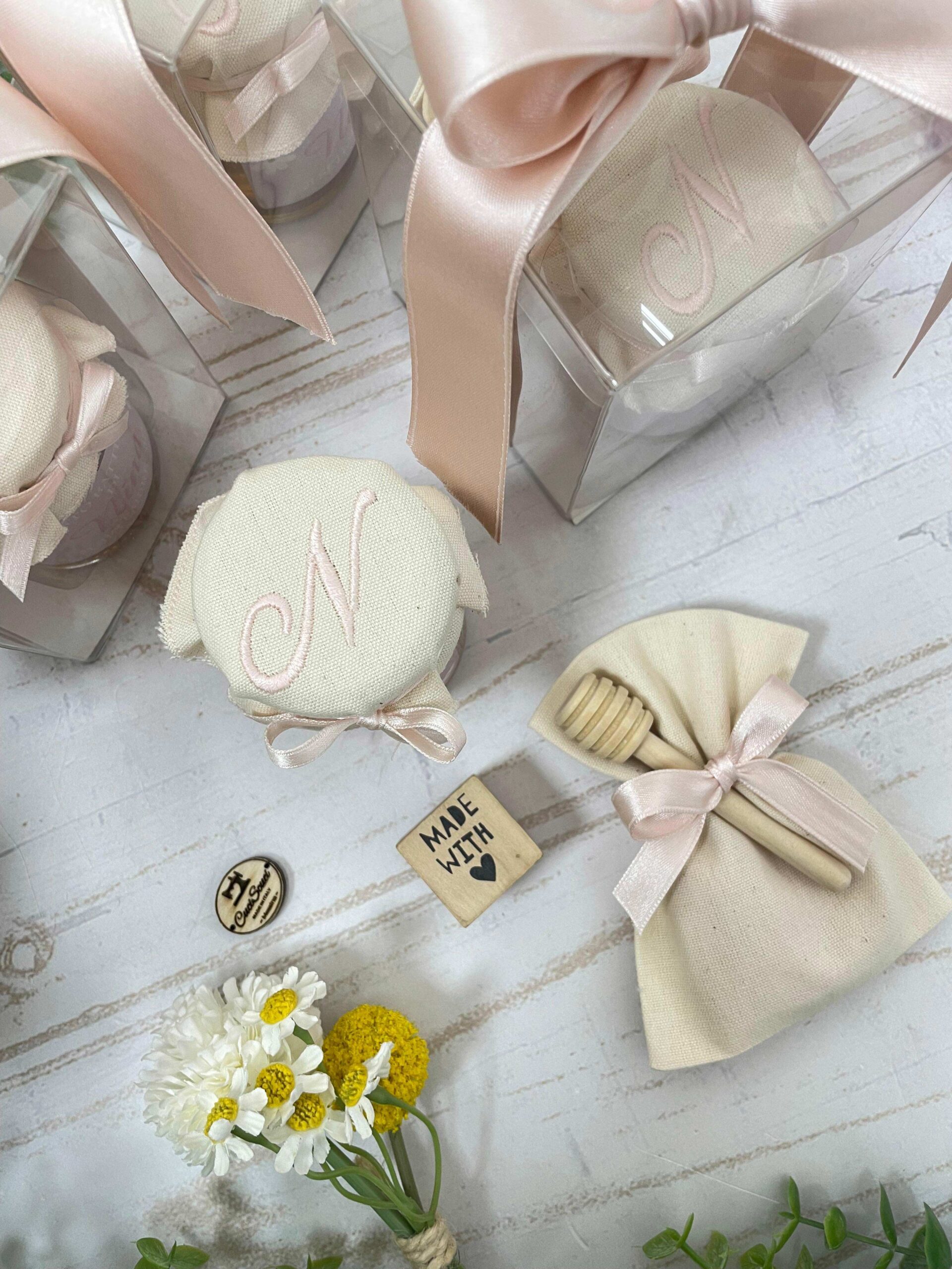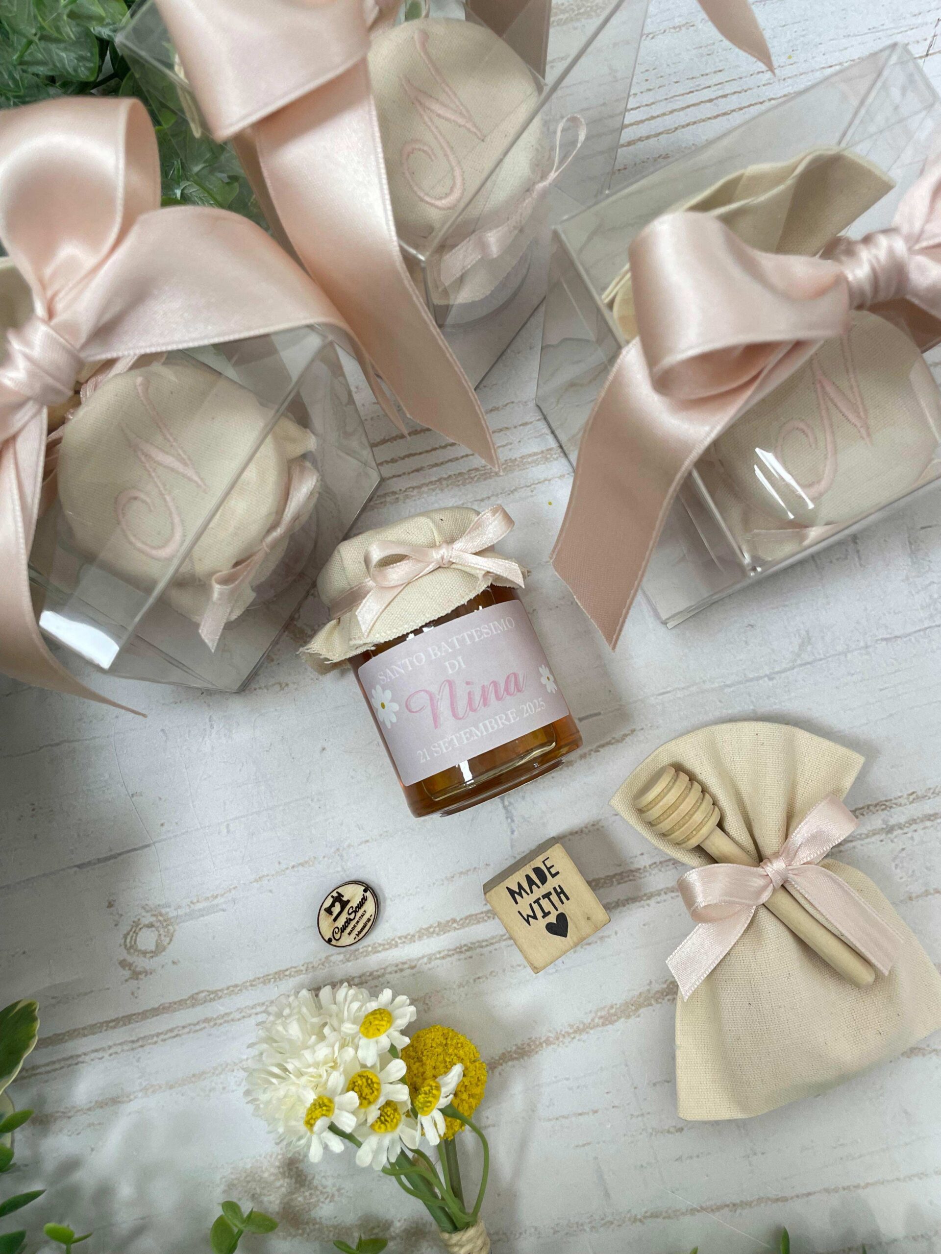 Il barattolo di miele da 100 g è impreziosito da un’etichetta personalizzata con tema margherite e da un copri barattolo in tela di cotone ricamato con l’iniziale del festeggiato o della festeggiata in filo rosa.