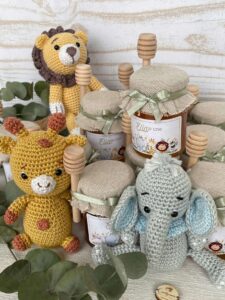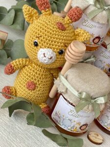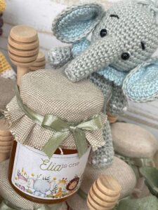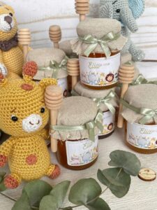barattolo di miele con copri barattolo ricamato, etichetta personalizzata, mini sacchetto sartoriale con 5 confetti in busta sigillata, cucchiaio spargi miele, scatola e nastri, così come in foto.