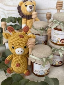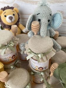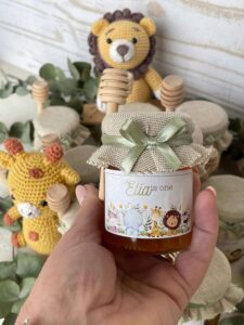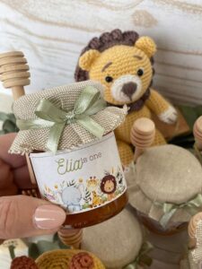 Barattolo di miele da 100 g con etichetta personalizzata con tema safari e copri barattolo in tela di cotone (a scelta se ricamato o no).