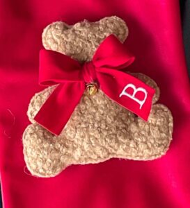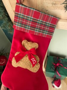 Sul davanti è applicato un tenero orsetto in tessuto bouclè, arricchito da un delicato nastrino rosso. L’orsetto può essere personalizzato con un’iniziale ricamata, rendendo ogni calza unica e speciale, un piccolo dettaglio ricercato che la trasforma in un regalo prezioso o in una decorazione da custodire nel tempo. Ogni pezzo è realizzato interamente a mano e quindi originale e irripetibile ✨
