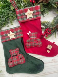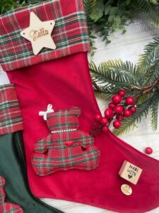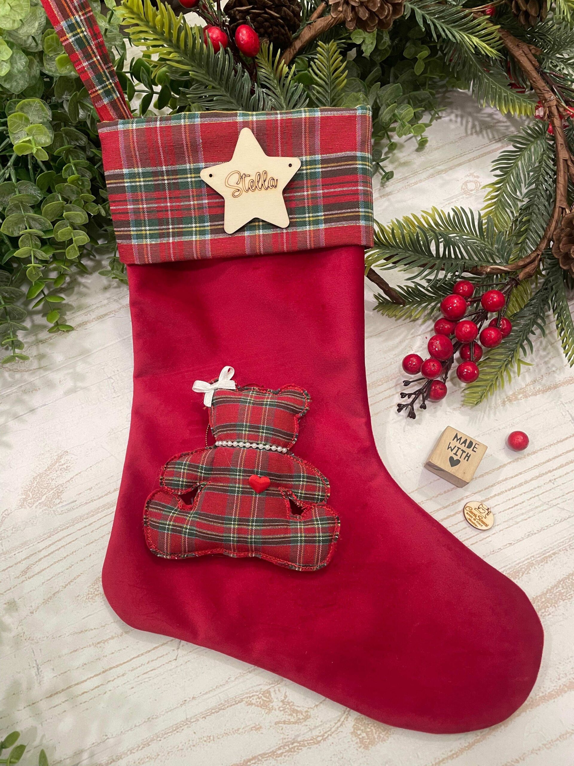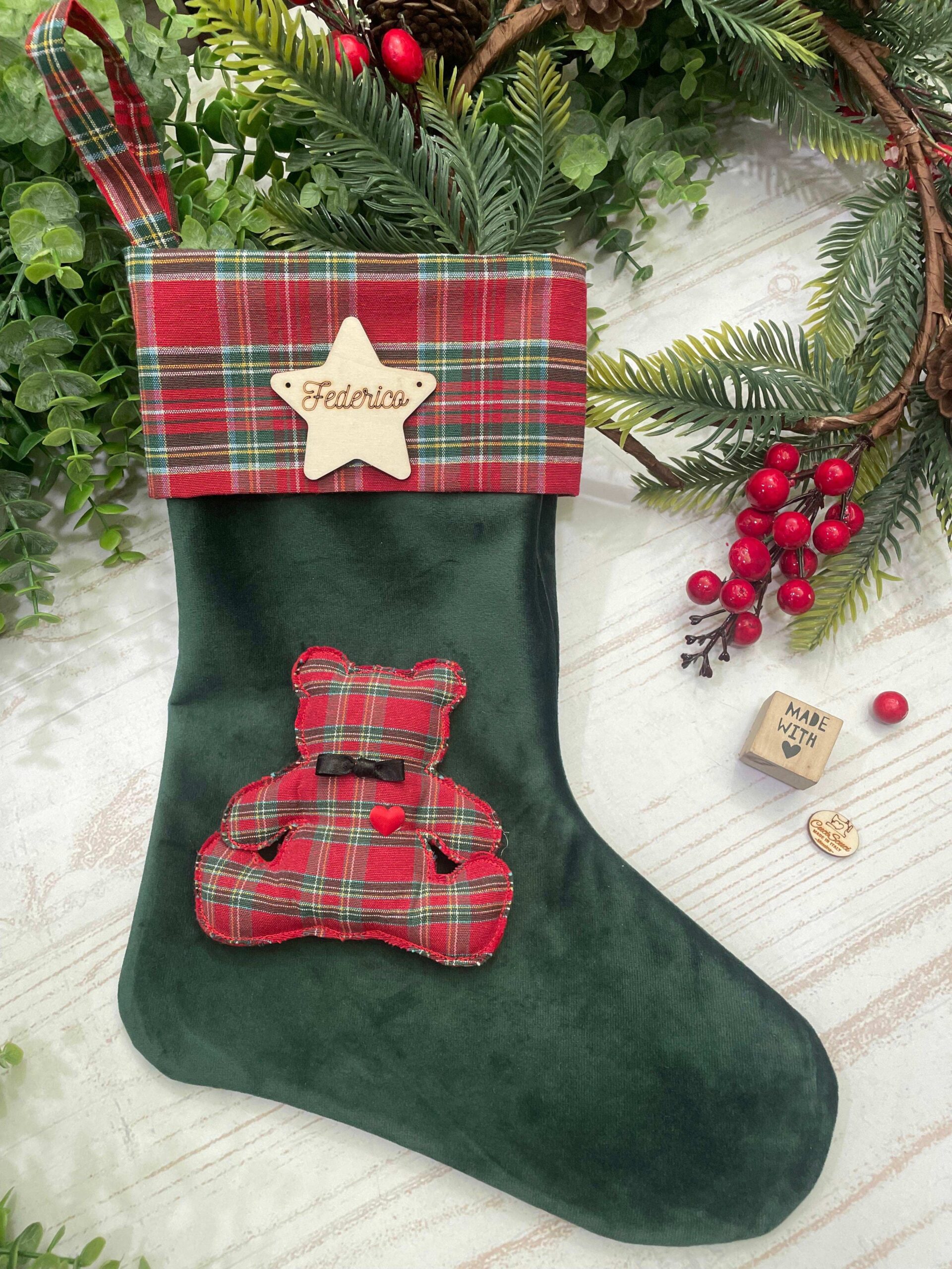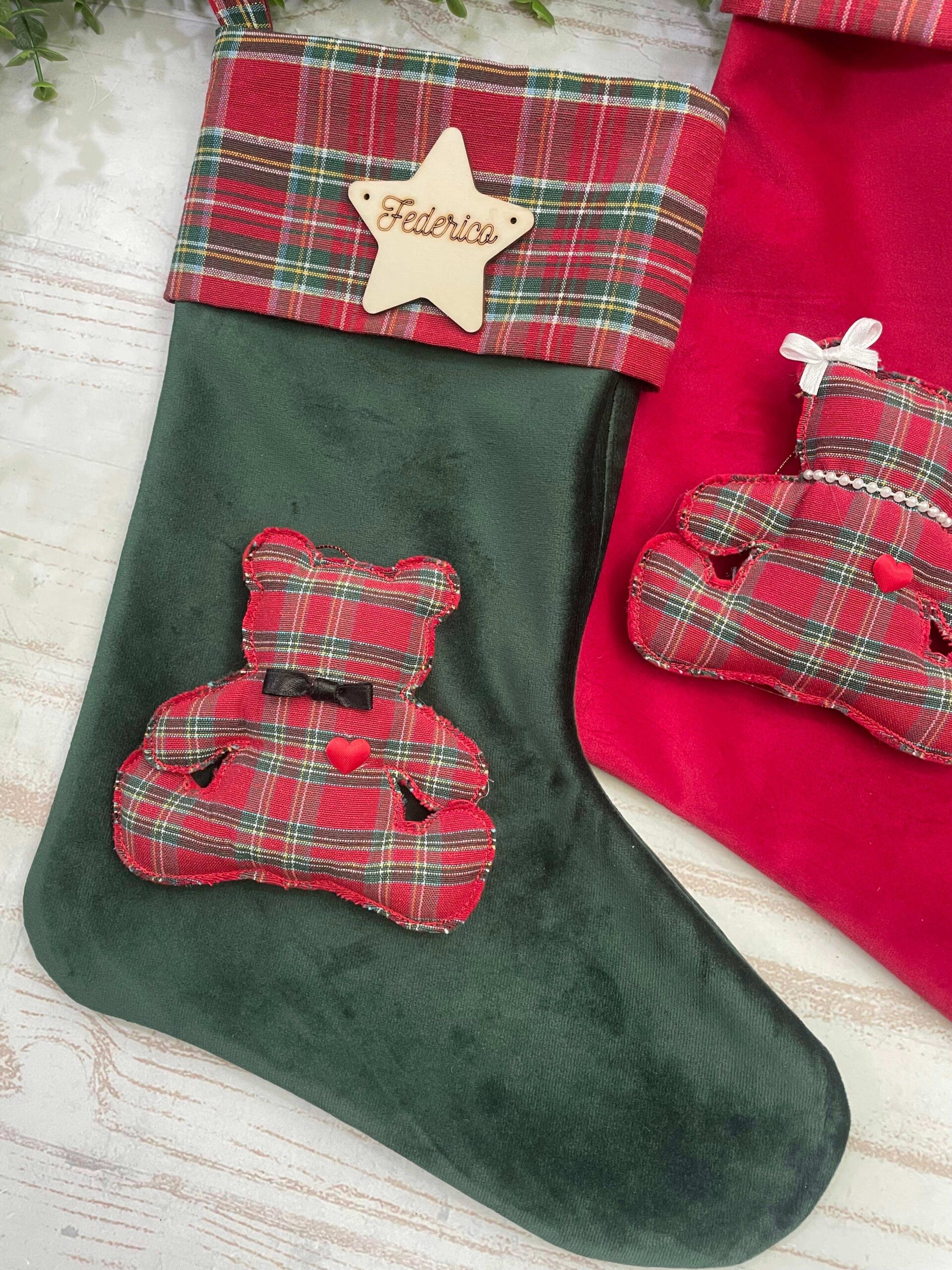 Calza natalizia in velluto con orsetto in tessuto tartan e targhetta personalizzata ✨