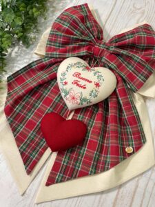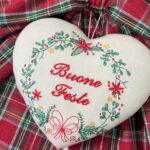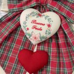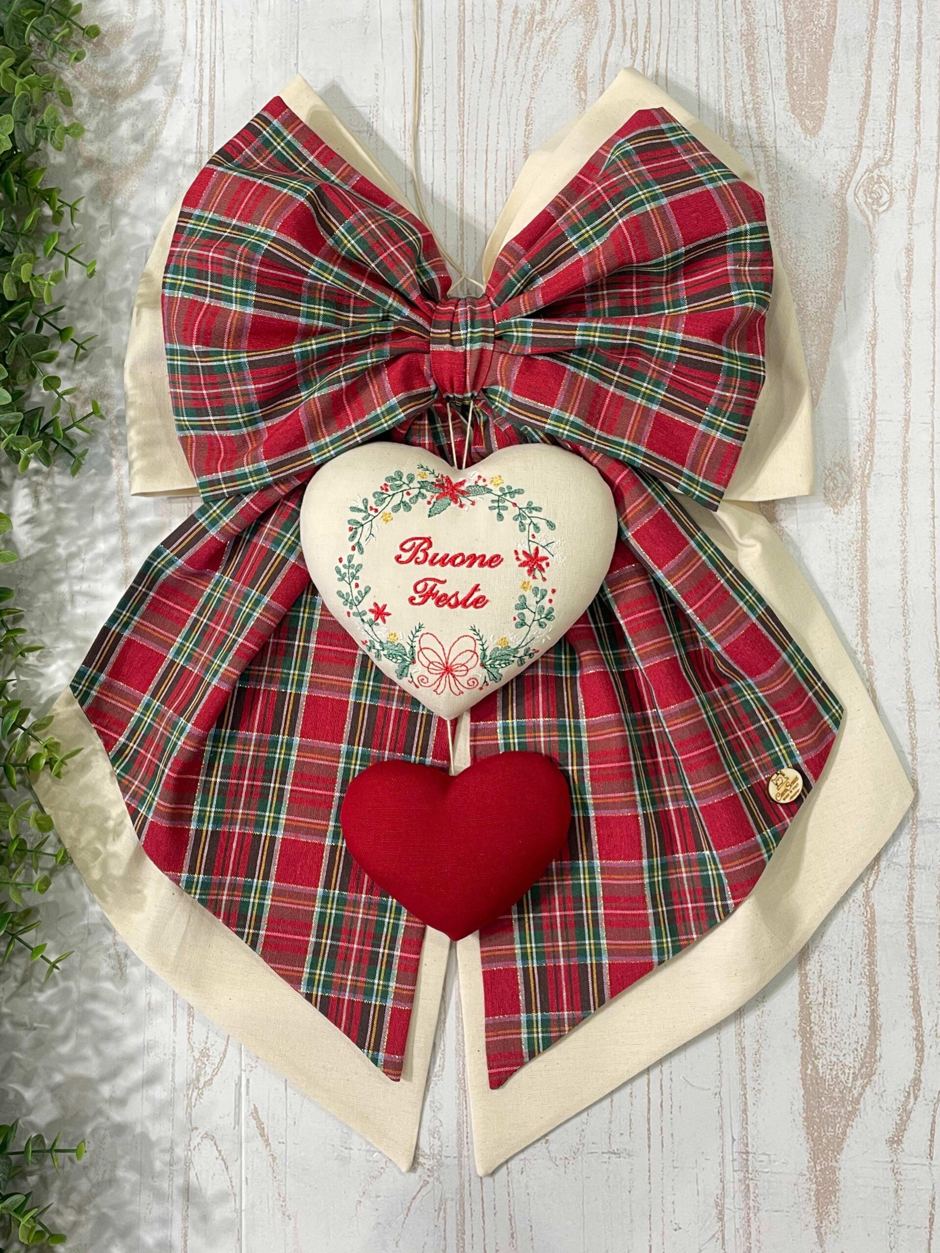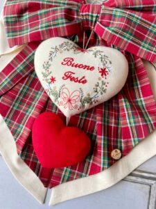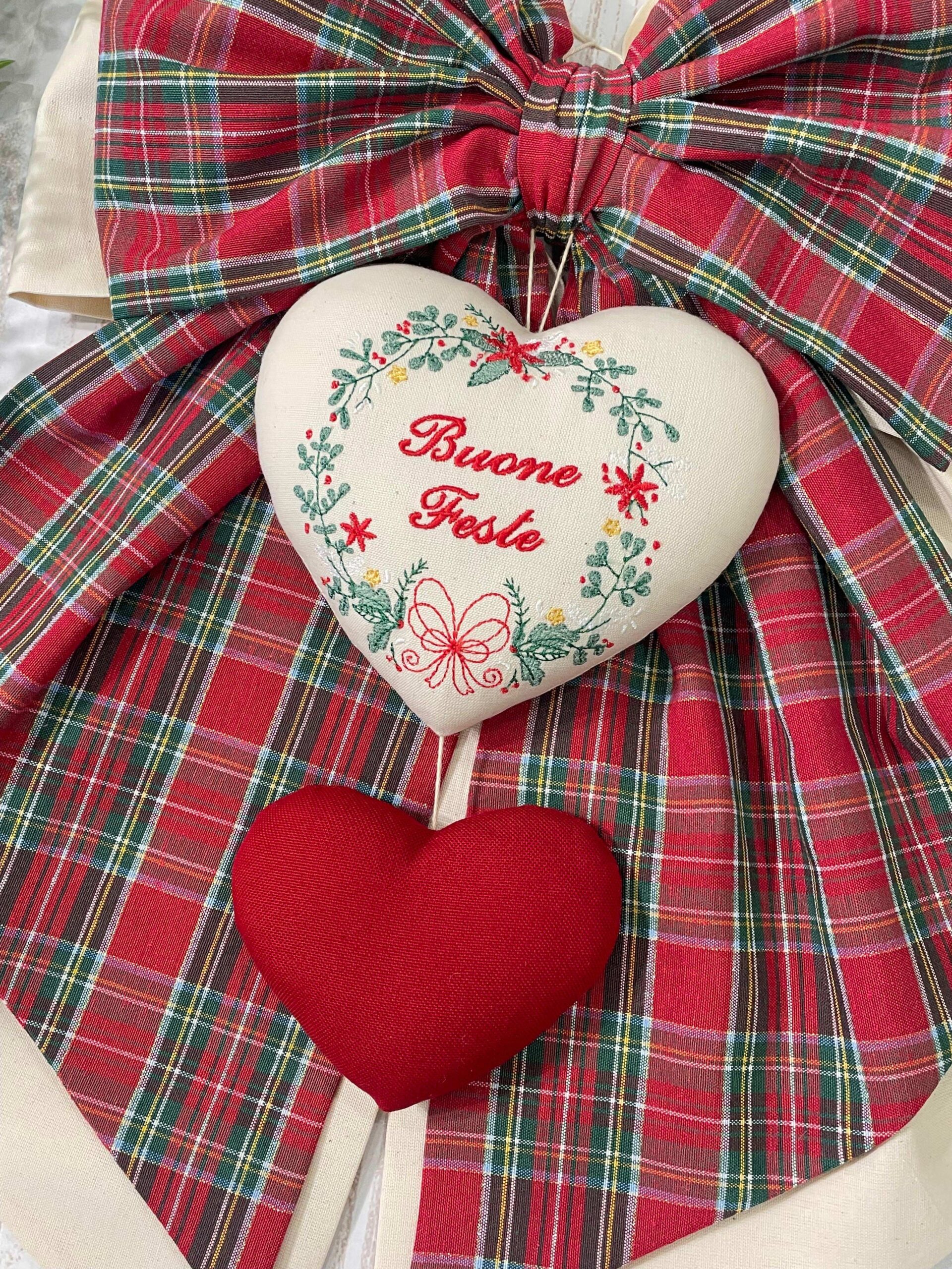 Al centro della composizione è applicato un cuore decorativo, impreziosito dal ricamo di una ghirlanda e dalla scritta “Buone Feste”, mentre nella parte inferiore pende un secondo cuore rosso, che completa l’insieme con un dettaglio armonioso e festivo.