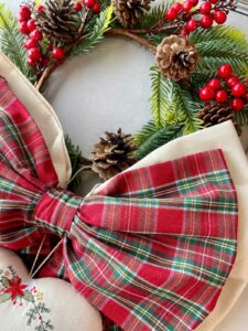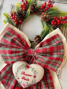 Un raffinato fuoriporta natalizio caratterizzato da una composizione a doppio fiocco: il fiocco inferiore in tono panna crea una base luminosa ed elegante, mentre il fiocco superiore in tessuto tartan aggiunge un tocco caldo e tradizionale, tipico dell’atmosfera natalizia.