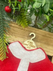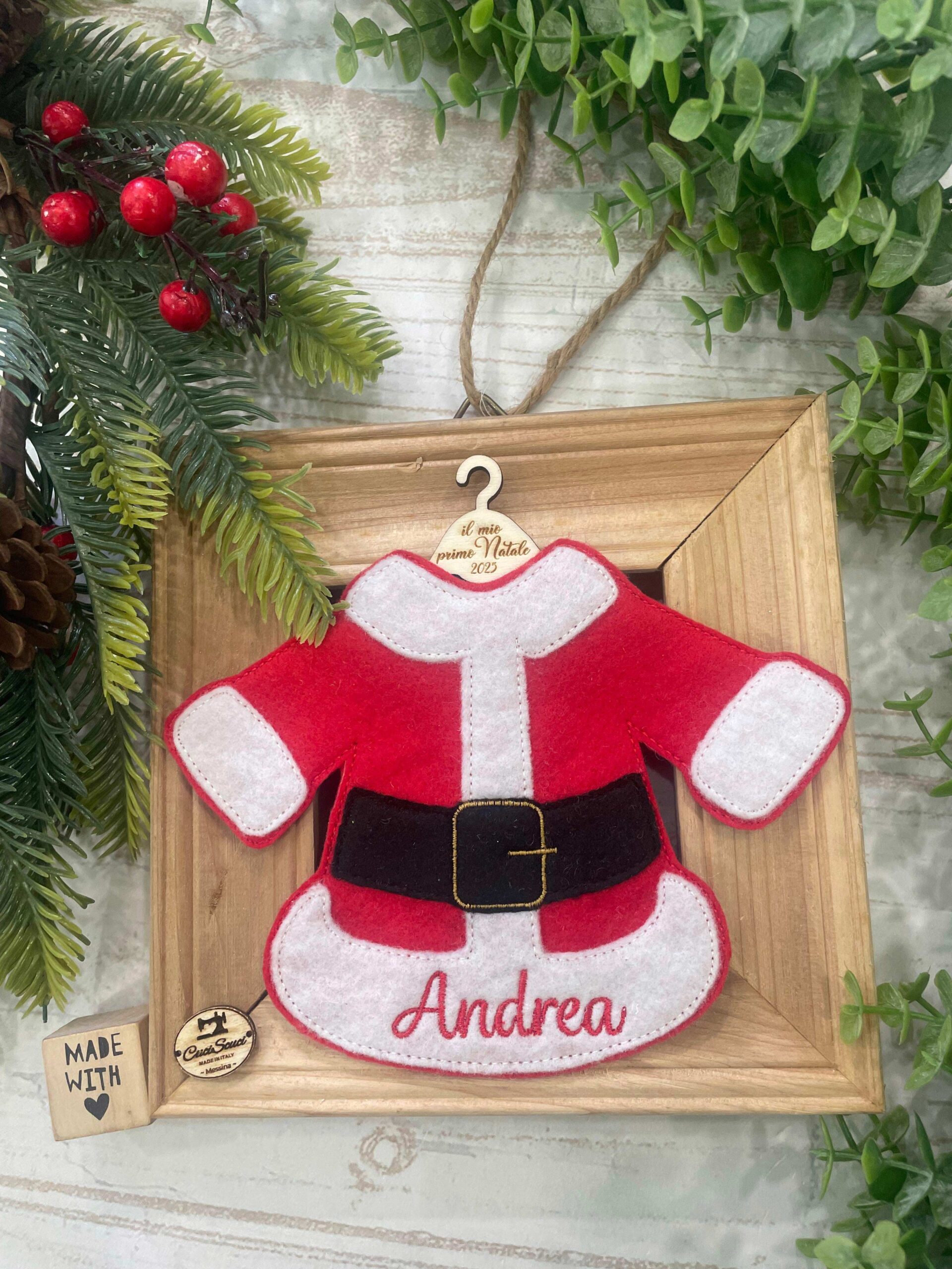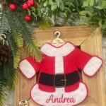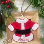 Una dolcissima decorazione natalizia che richiama la giacca di Babbo Natale, realizzata interamente a mano in pannolenci con cura sartoriale e attenzione ai dettagli. Il capo è impreziosito dal ricamo del nome del bimbo o della bimba, rendendo la creazione unica e personale.