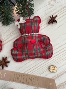 Orsetto natalizio da appendere realizzato con abilità e cura per il dettaglio dalla nostra sartoria, in tessuto tartan con l’applicazione di piccoli accessori.