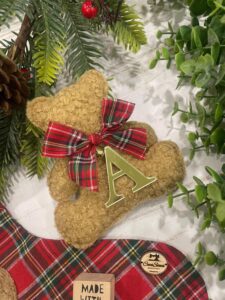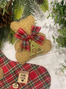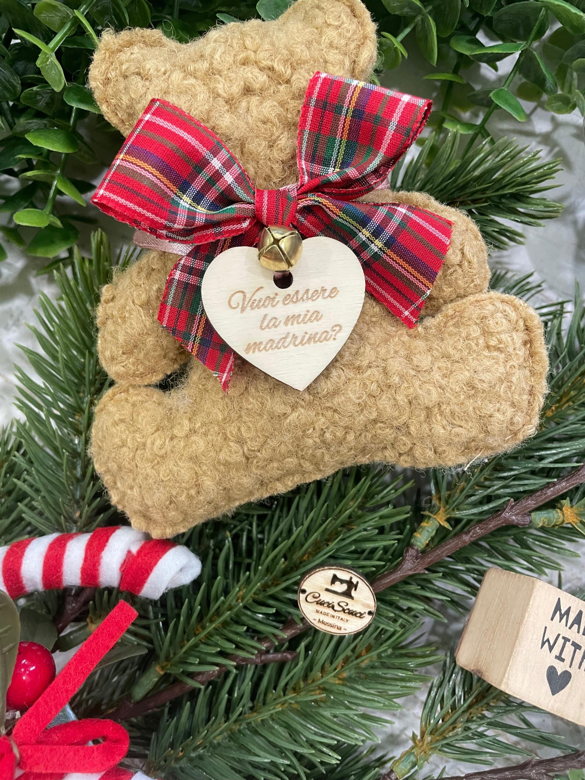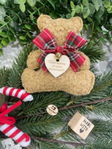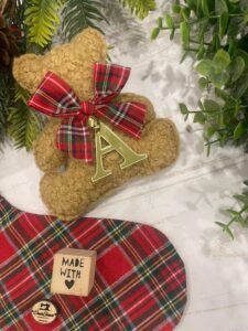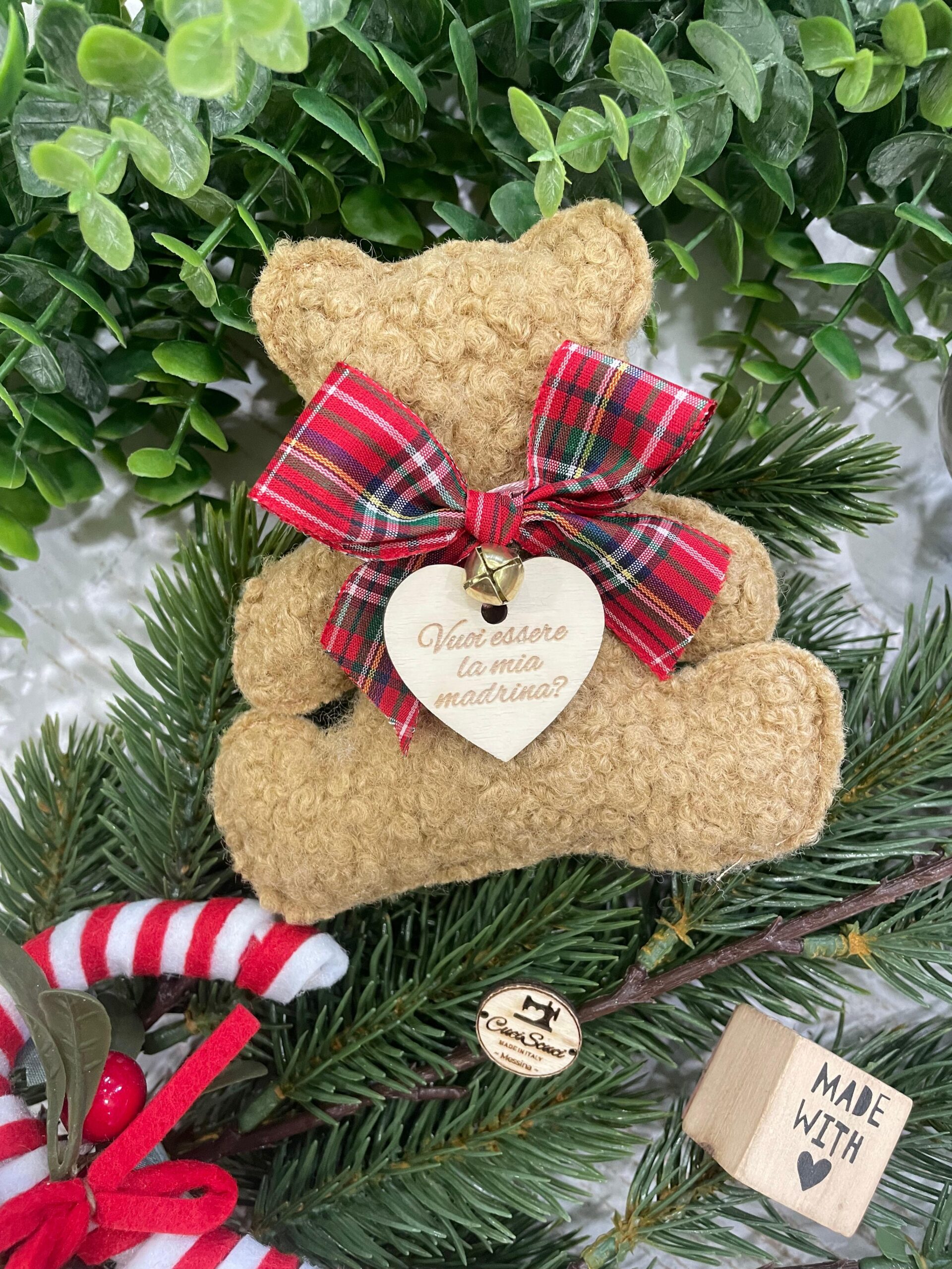 L’orsetto è impreziosito da un nastrino in tessuto tartan e da un delicato campanellino, dettagli che ne esaltano il carattere caldo e artigianale.