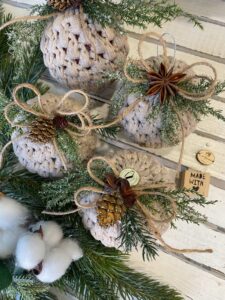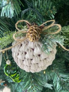Questa pallina natalizia all’uncinetto color sabbia, interamente realizzata a mano, combina eleganza e semplicità con un design in filato naturale.