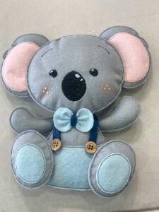 Un tenero koala con dettagli in celeste, che indossa un piccolo papillon, realizzato in pannolenci.