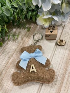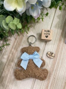 Orsetto realizzato in tessuto bouclè marrone o bianco, è ideale per essere utilizzato come applicazione per un sacchetto o da solo come bomboniera.