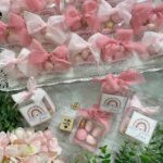 Un delicato porta confetti in PVC, impreziosito da etichetta personalizzata a tema arcobaleno rosa, pensato per accompagnare con dolcezza ed eleganza i momenti più importanti.