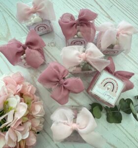 La semplicità della scatolina trasparente si unisce alla cura artigianale dei dettagli, creando una bomboniera luminosa e raffinata, ideale per eventi dedicati ai più piccoli ma perfetta anche per occasioni speciali. Ogni confezione è realizzata interamente a mano e personalizzabile per adattarsi al tema e ai colori scelti.