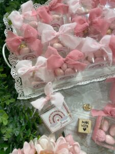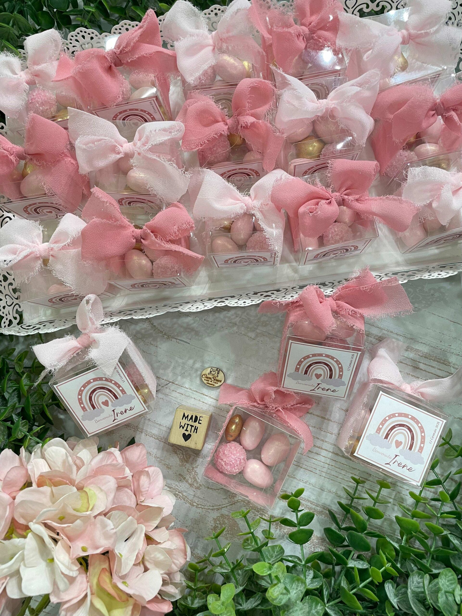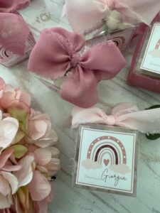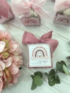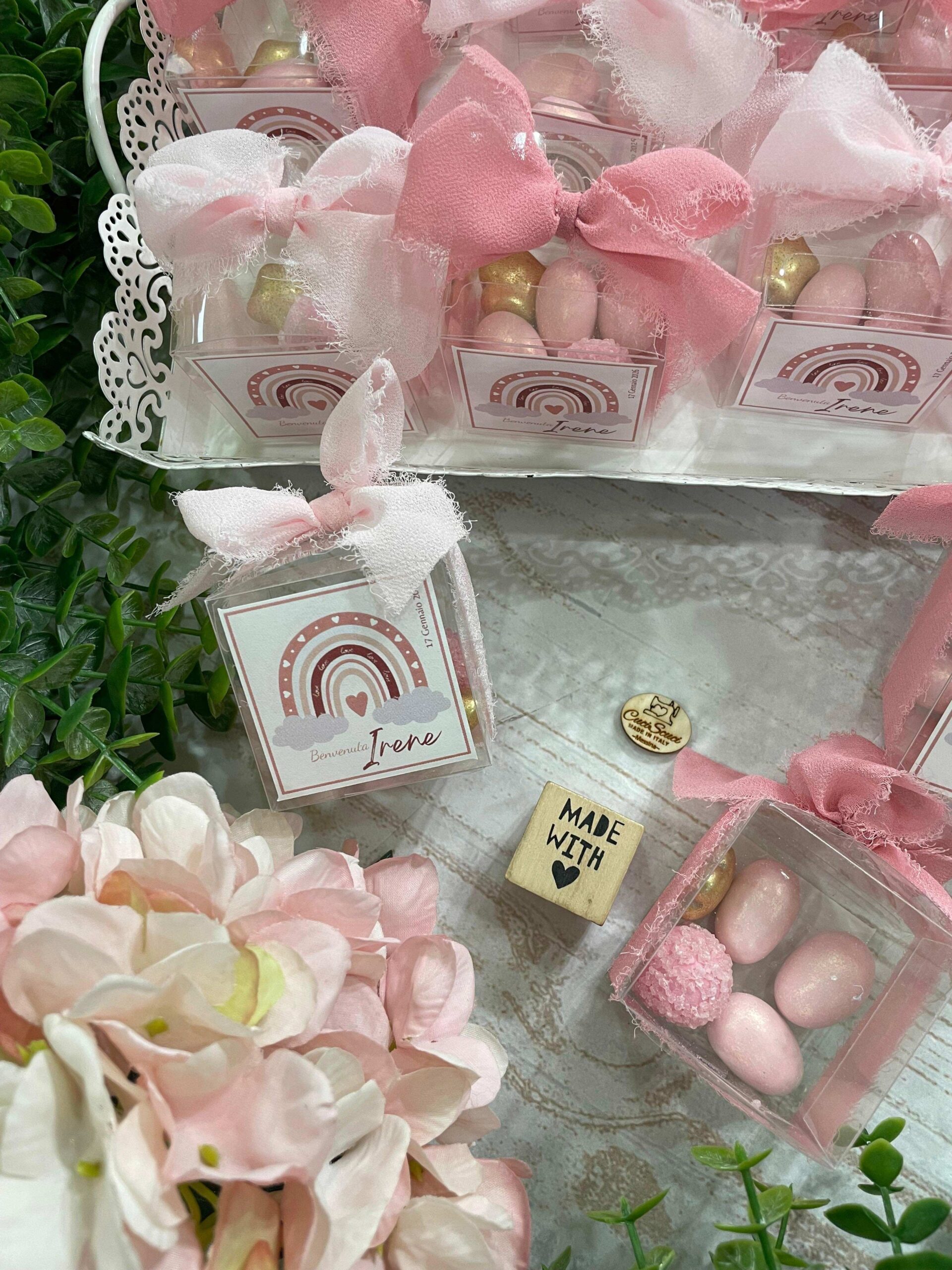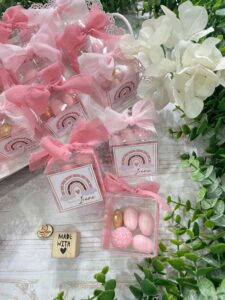 Un delicato porta confetti in PVC, impreziosito da etichetta personalizzata a tema arcobaleno rosa, pensato per accompagnare con dolcezza ed eleganza i momenti più importanti.