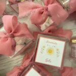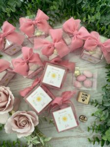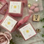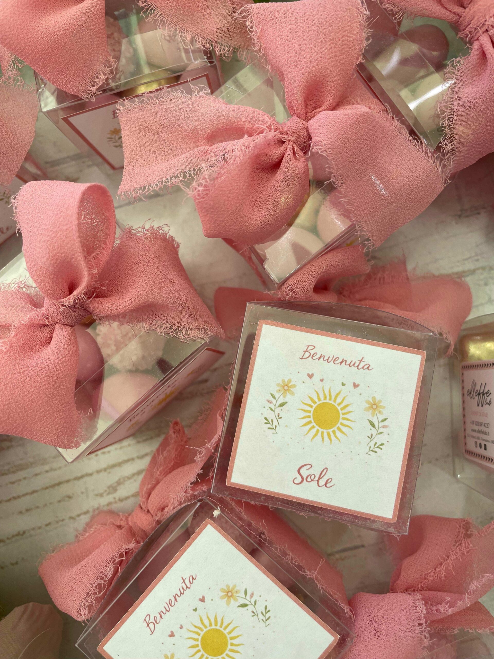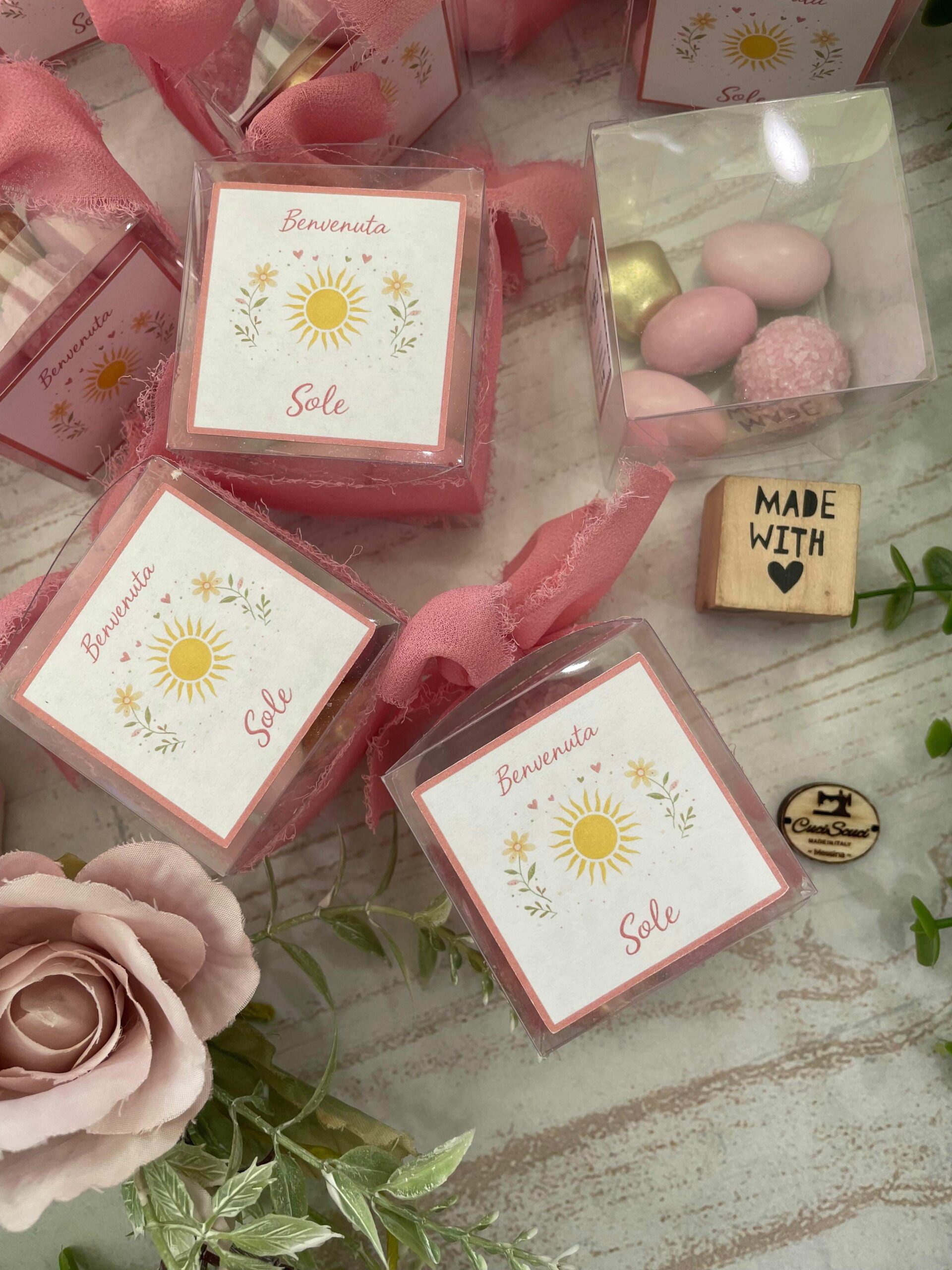 Un luminoso e delicato porta confetti in PVC, impreziosito da etichetta personalizzata a tema sole e fiori, pensato per donare un tocco di allegria e armonia ai tuoi eventi speciali.