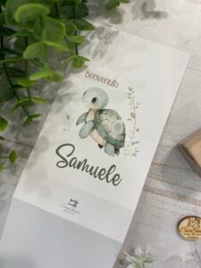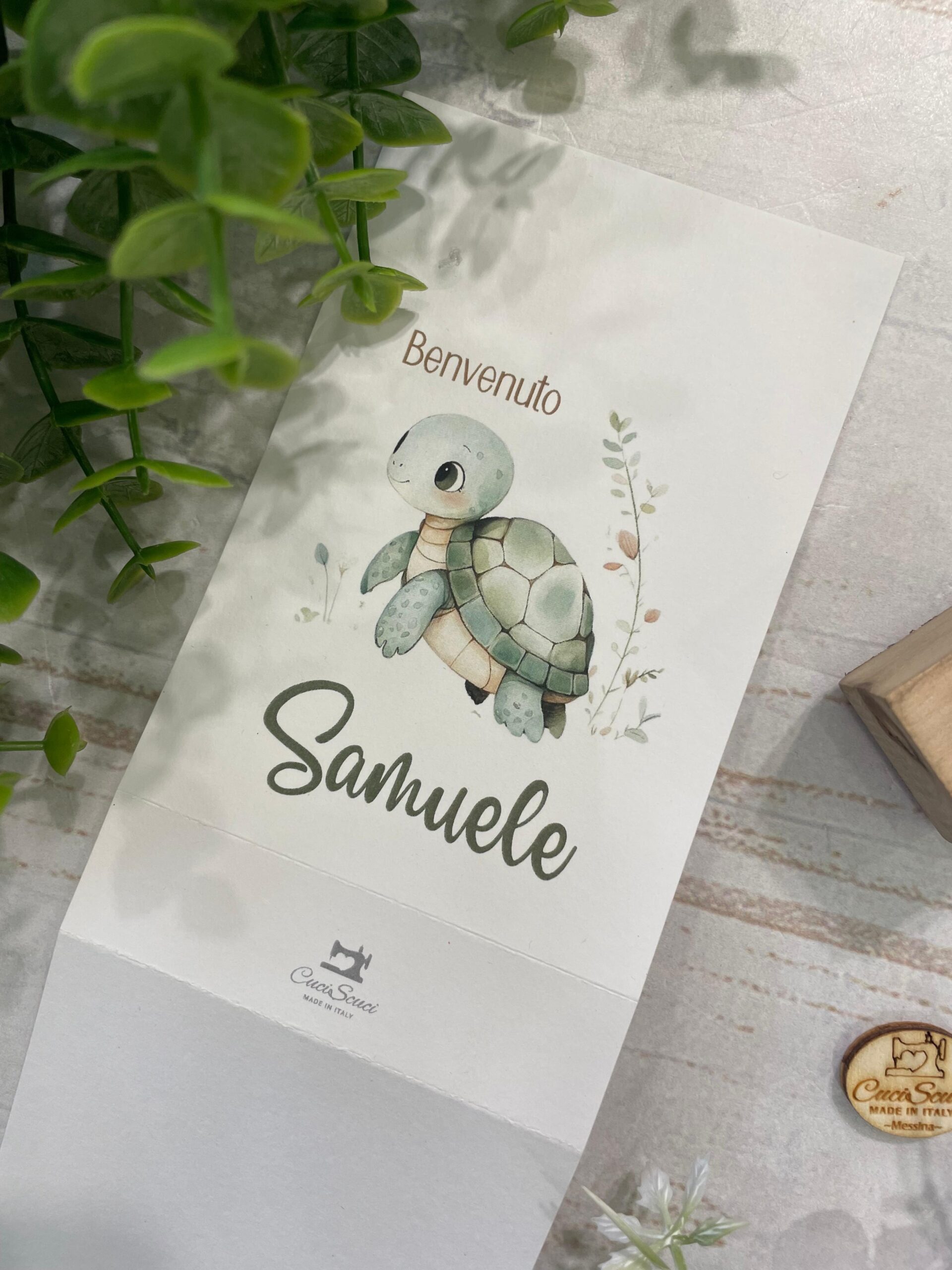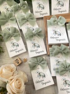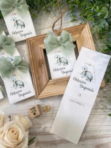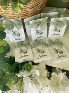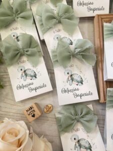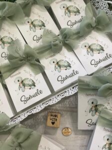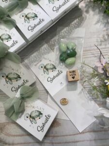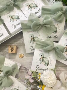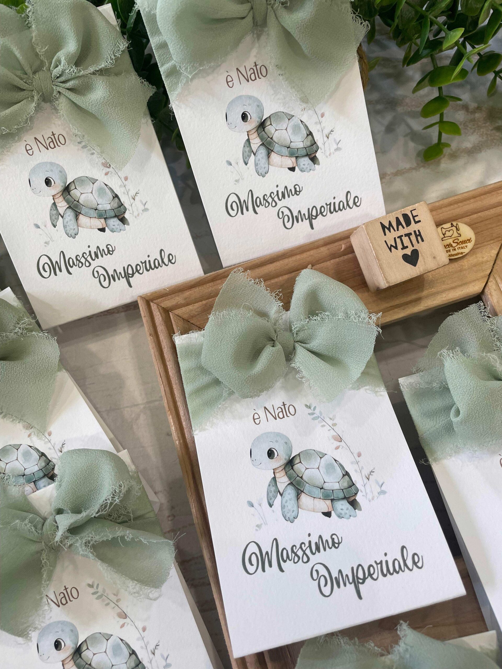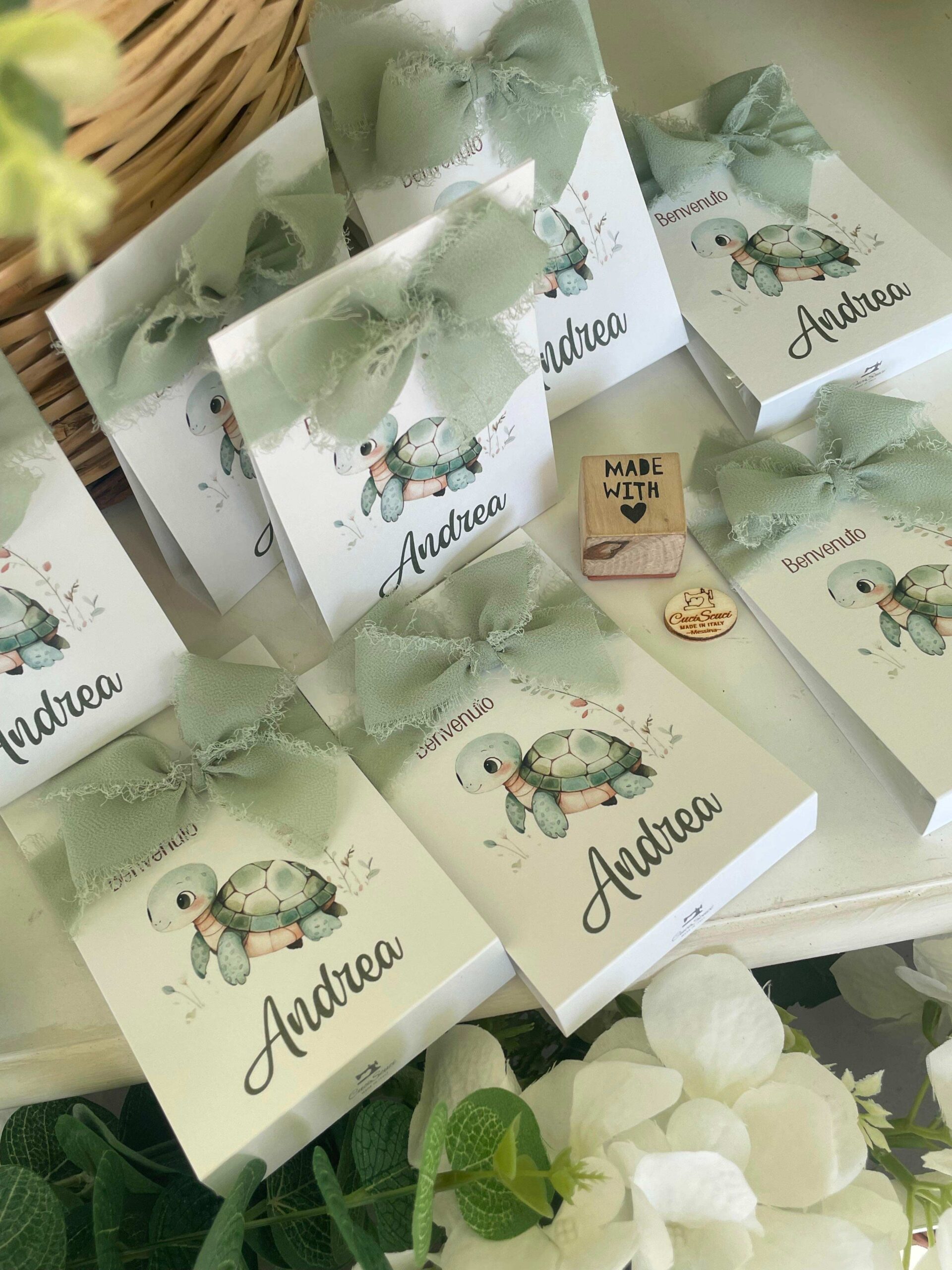 Un delicato porta confetti in cartoncino, impreziosito da una grafica personalizzata a tema tartarughina, pensato per accompagnare con dolcezza i momenti più importanti. Una proposta semplice ma curata, ideale per chi desidera una bomboniera raffinata e personalizzabile.