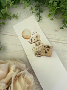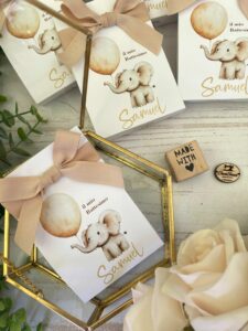 Un delicato porta confetti in cartoncino, decorato con grafica personalizzata a tema elefantino, pensato per accompagnare con dolcezza ed eleganza i momenti più importanti. Una bomboniera semplice ma curata, ideale per eventi dedicati ai più piccoli e alle loro famiglie.