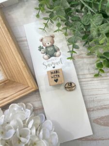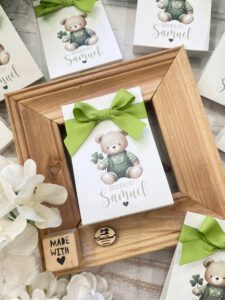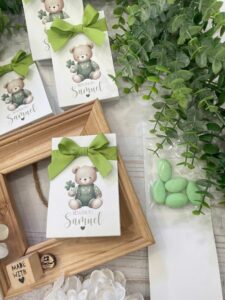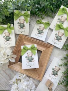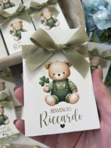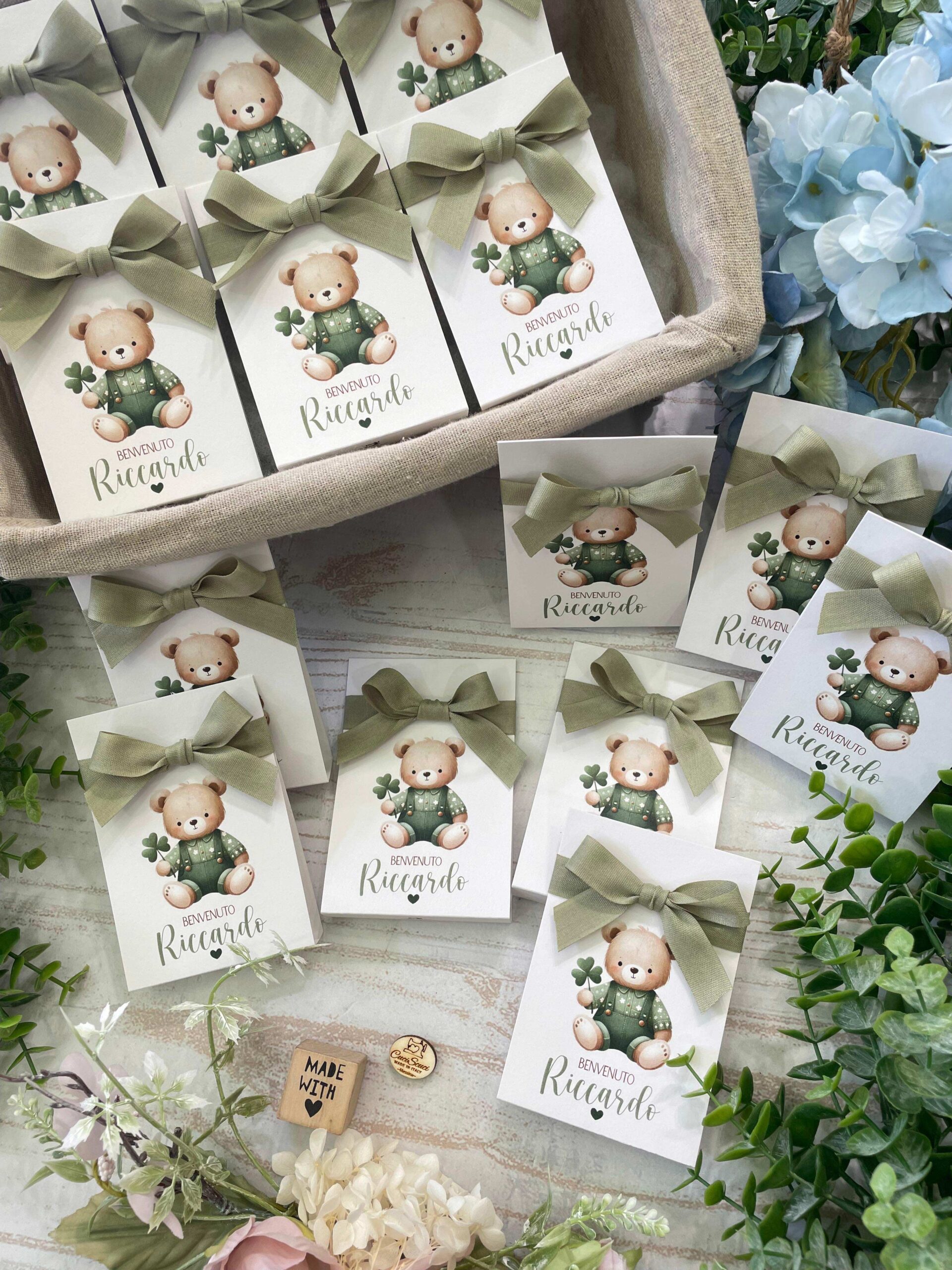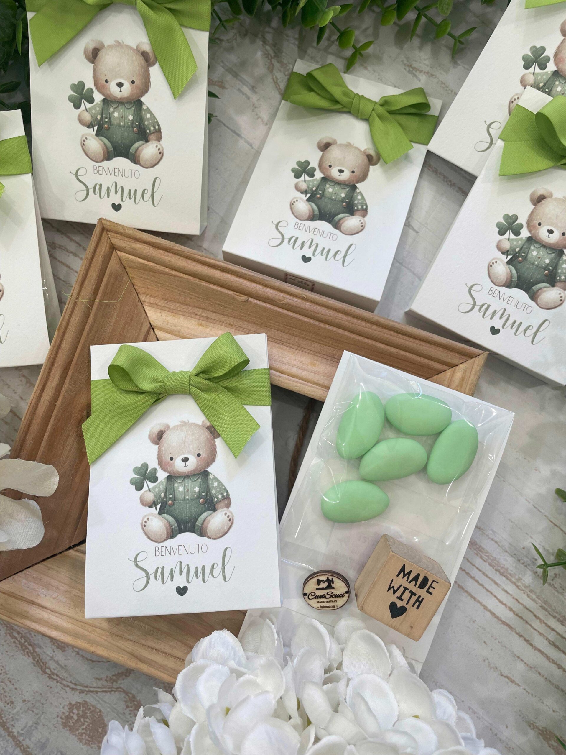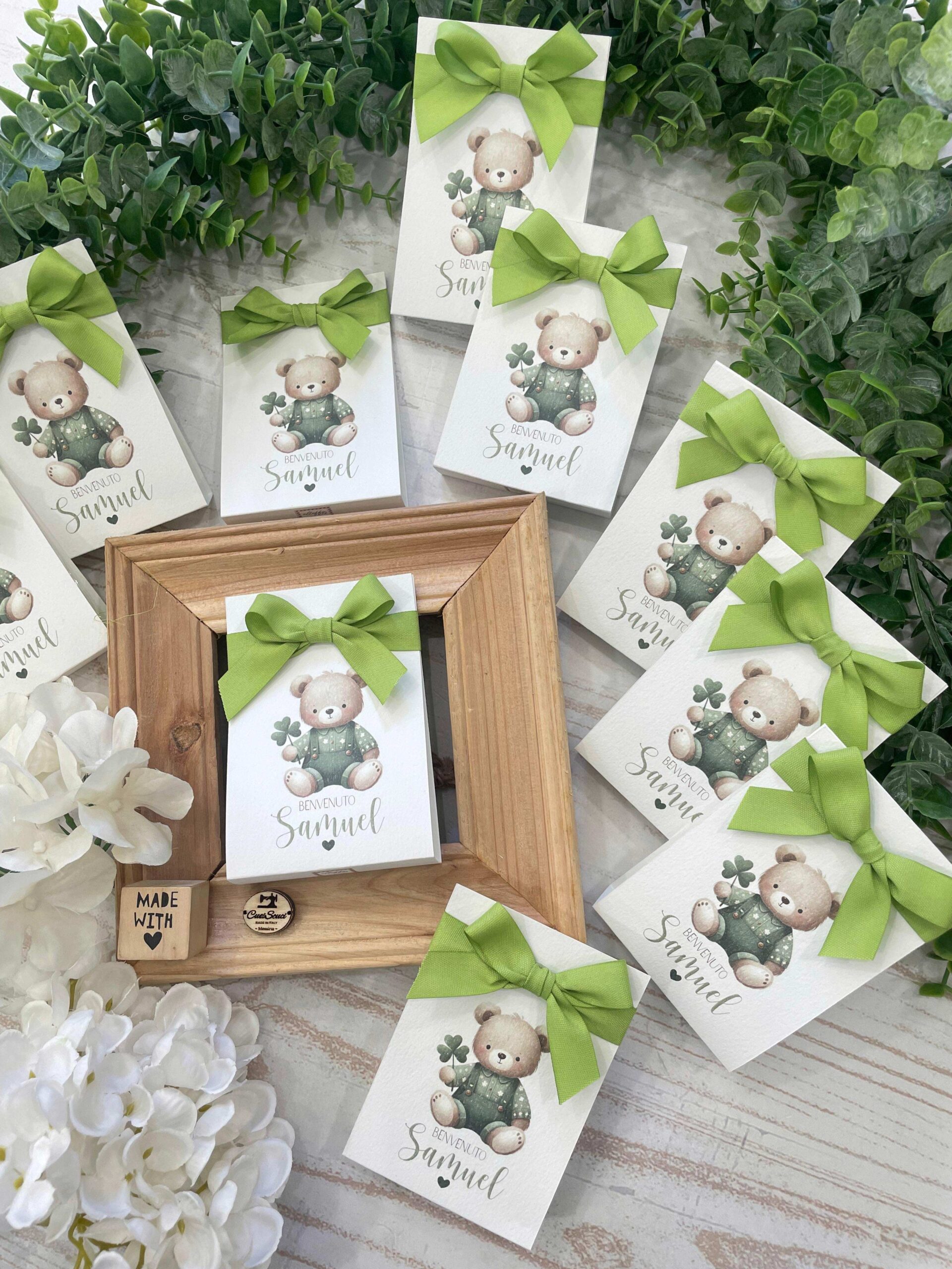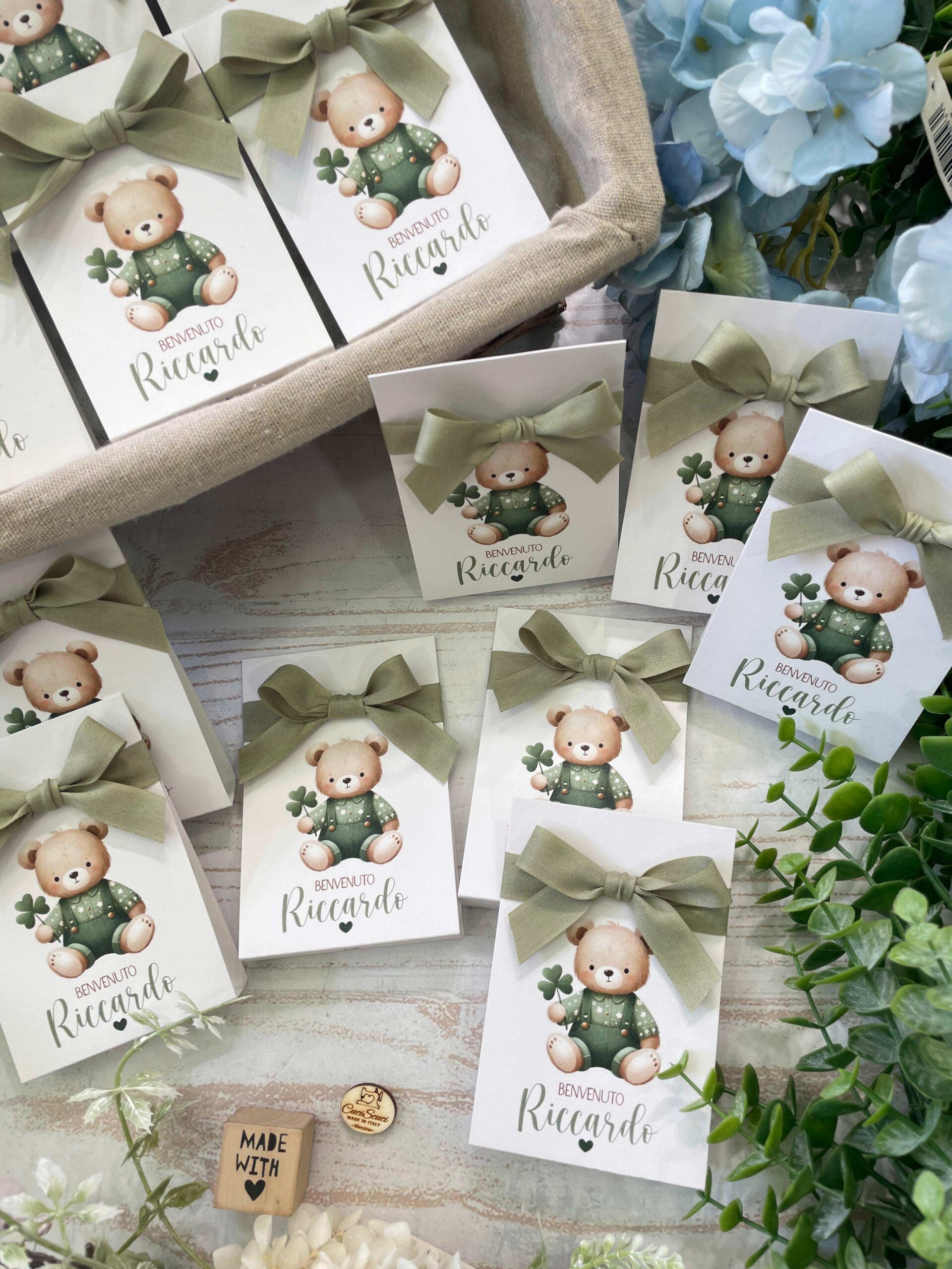Un delicato porta confetti in cartoncino, impreziosito da grafica personalizzata a tema orsetto con quadrifoglio, pensato per accompagnare con armonia e originalità i momenti speciali della tua vita. Il design tenero e curato lo rende perfetto per celebrare occasioni importanti con uno stile raffinato.