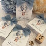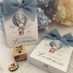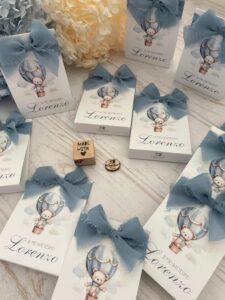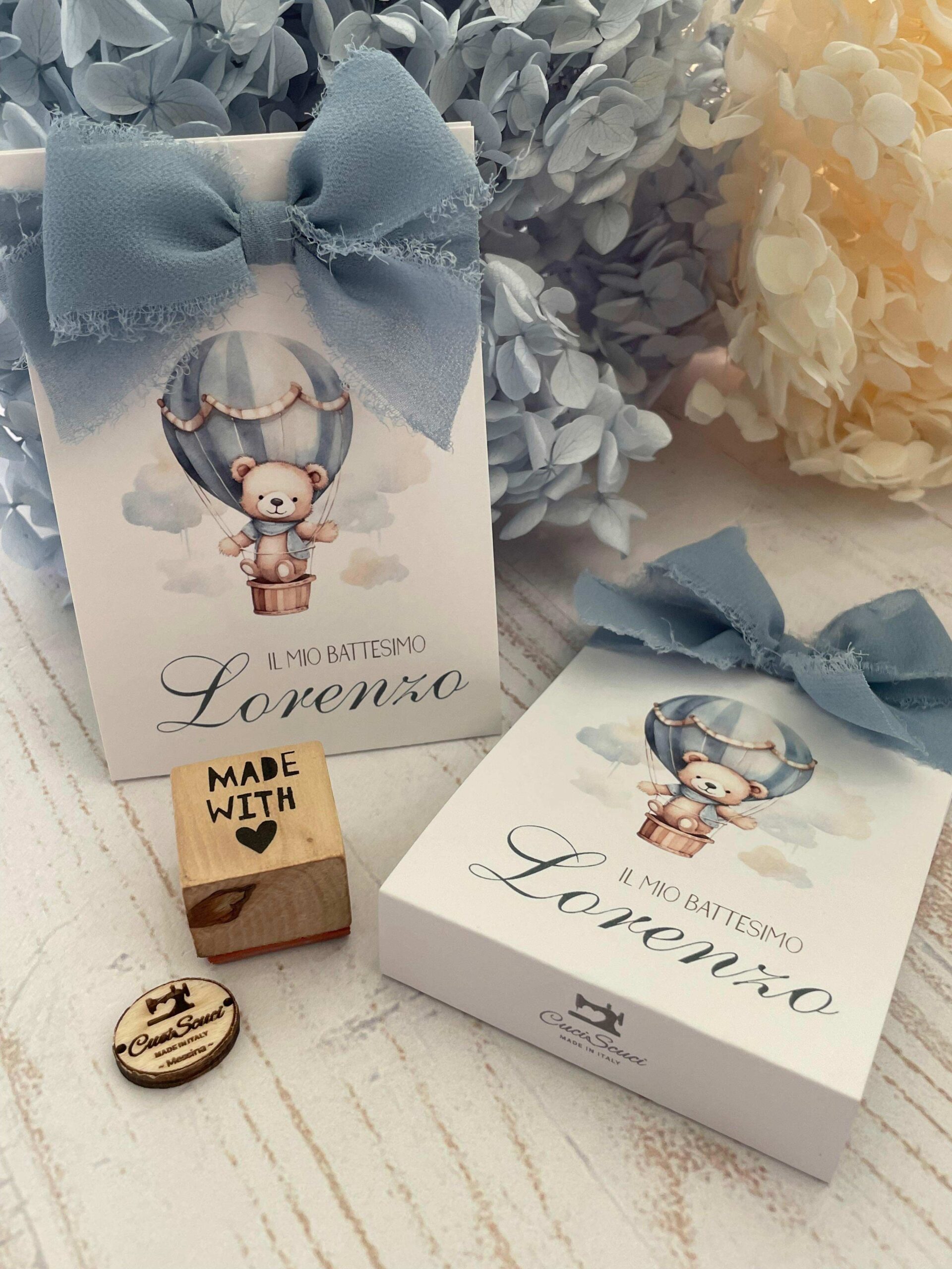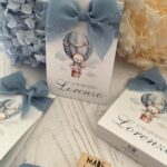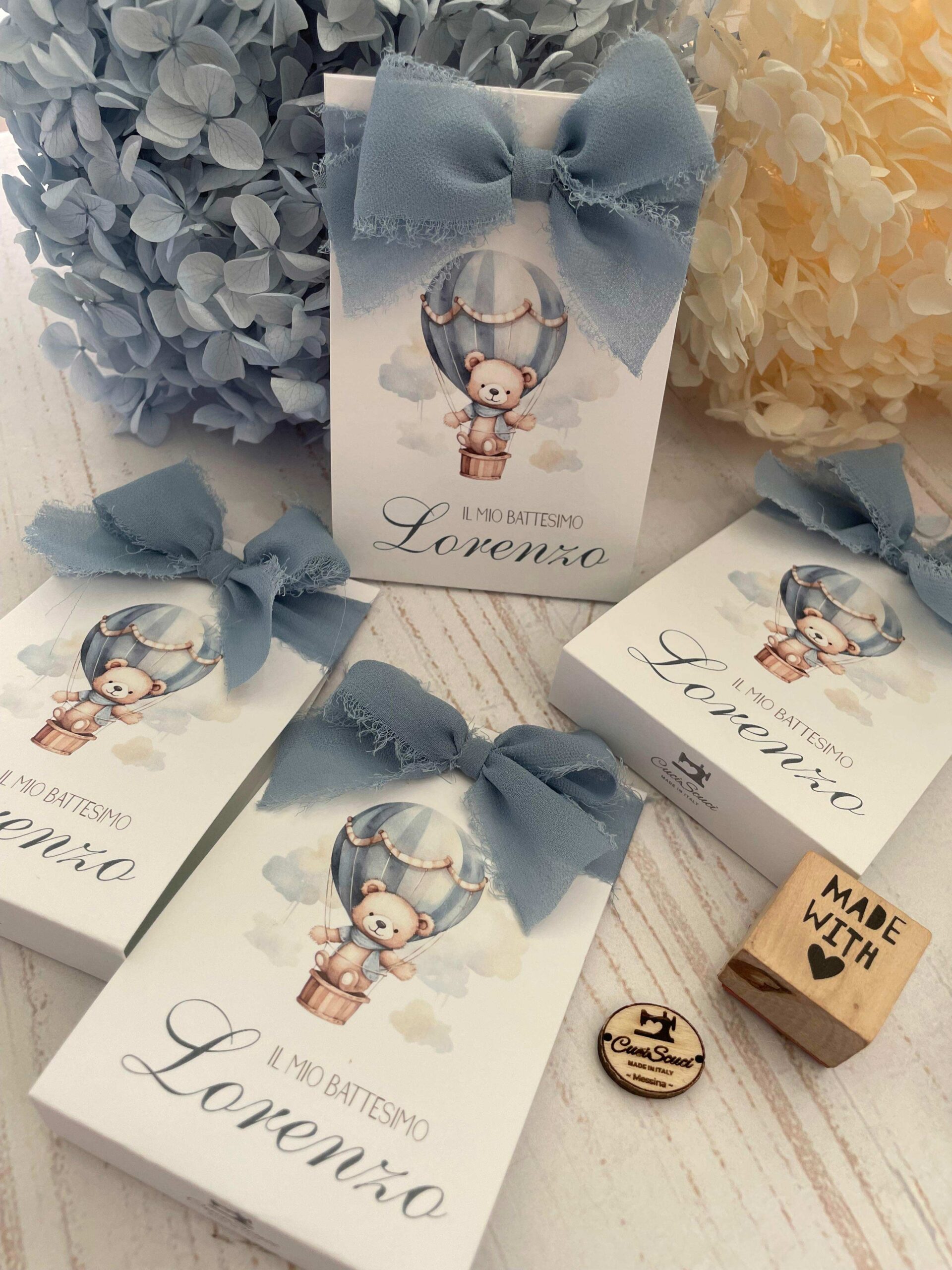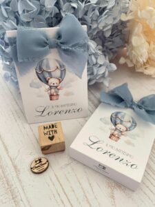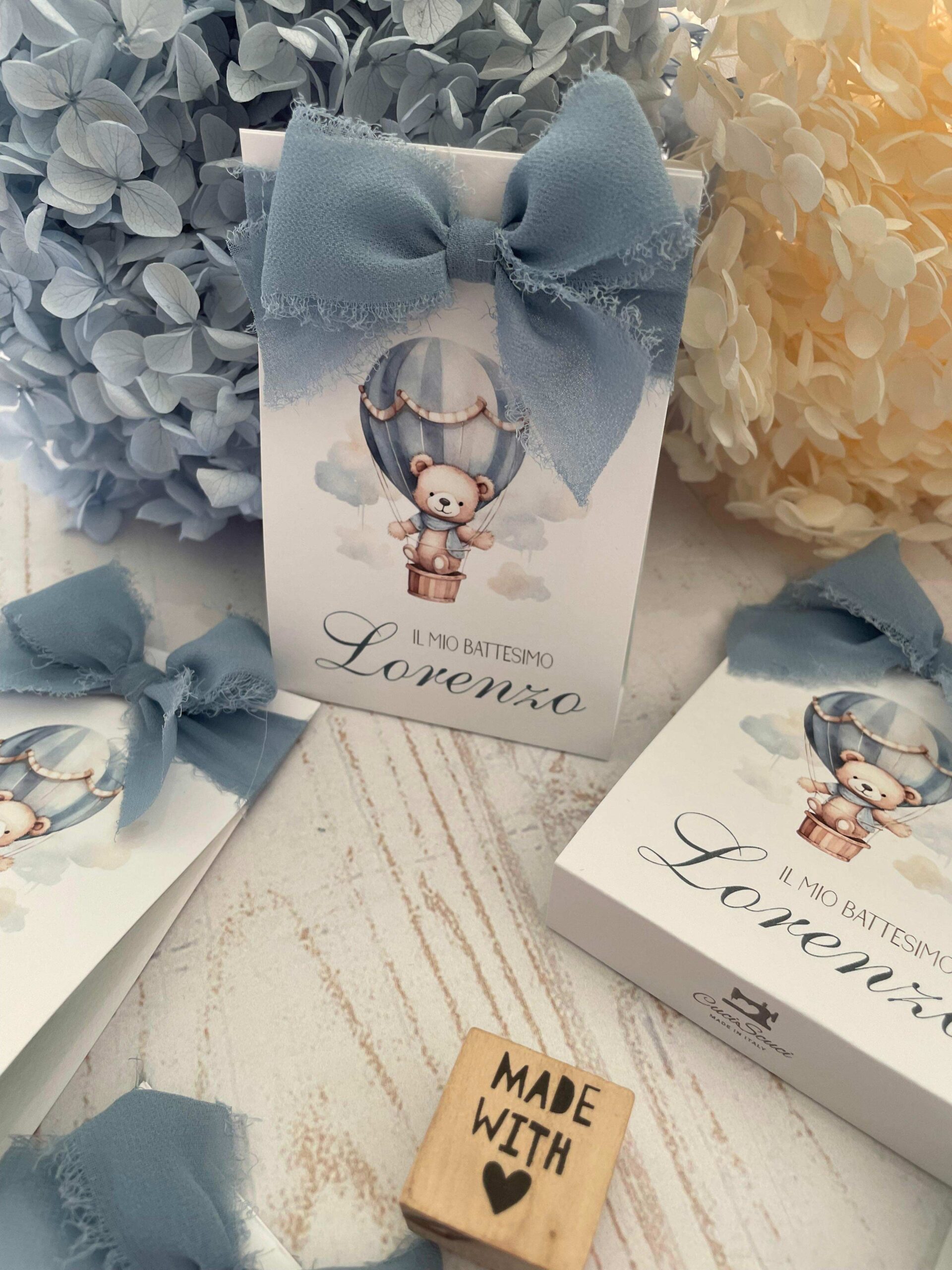 Un delicato porta confetti in cartoncino, impreziosito da grafica personalizzata a tema orsetto su mongolfiera, pensato per accompagnare con dolcezza ed eleganza i momenti più importanti.