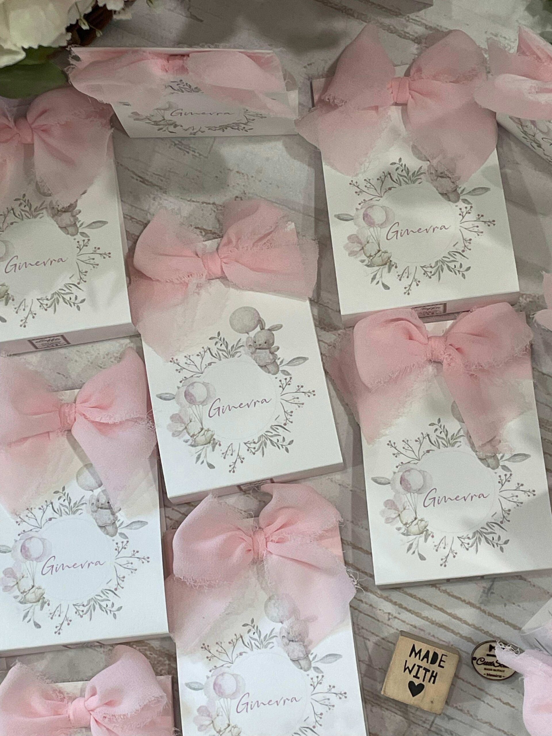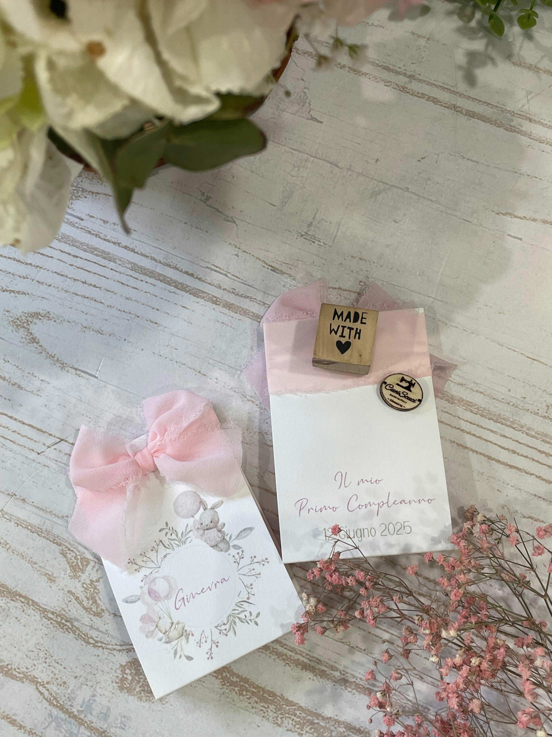Un delicato porta confetti in cartoncino, impreziosito da grafica personalizzata a tema coniglietto con palloncini, pensato per accompagnare con eleganza i momenti più speciali. Le tonalità tenui e il design giocoso lo rendono perfetto per eventi di ogni tipo.