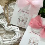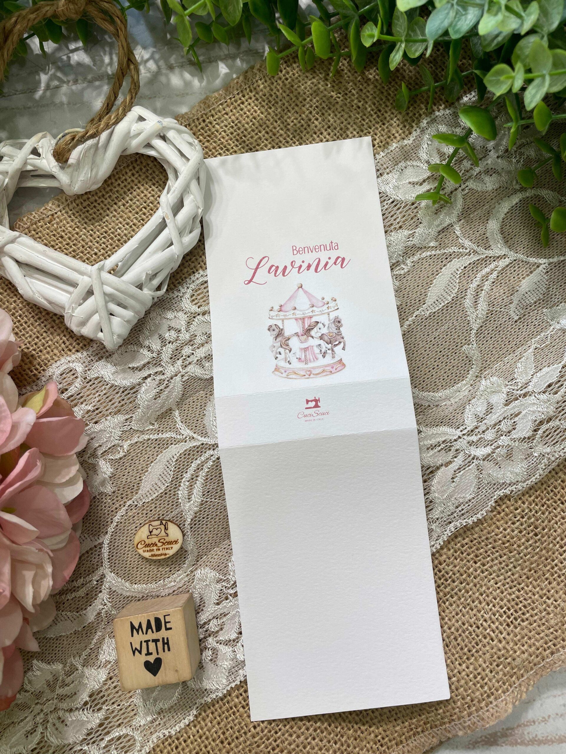 Un delicato porta confetti in cartoncino, impreziosito da grafica personalizzata a tema giostrina rosa, pensato per accompagnare con eleganza e dolcezza i momenti più speciali dedicati ai più piccoli.